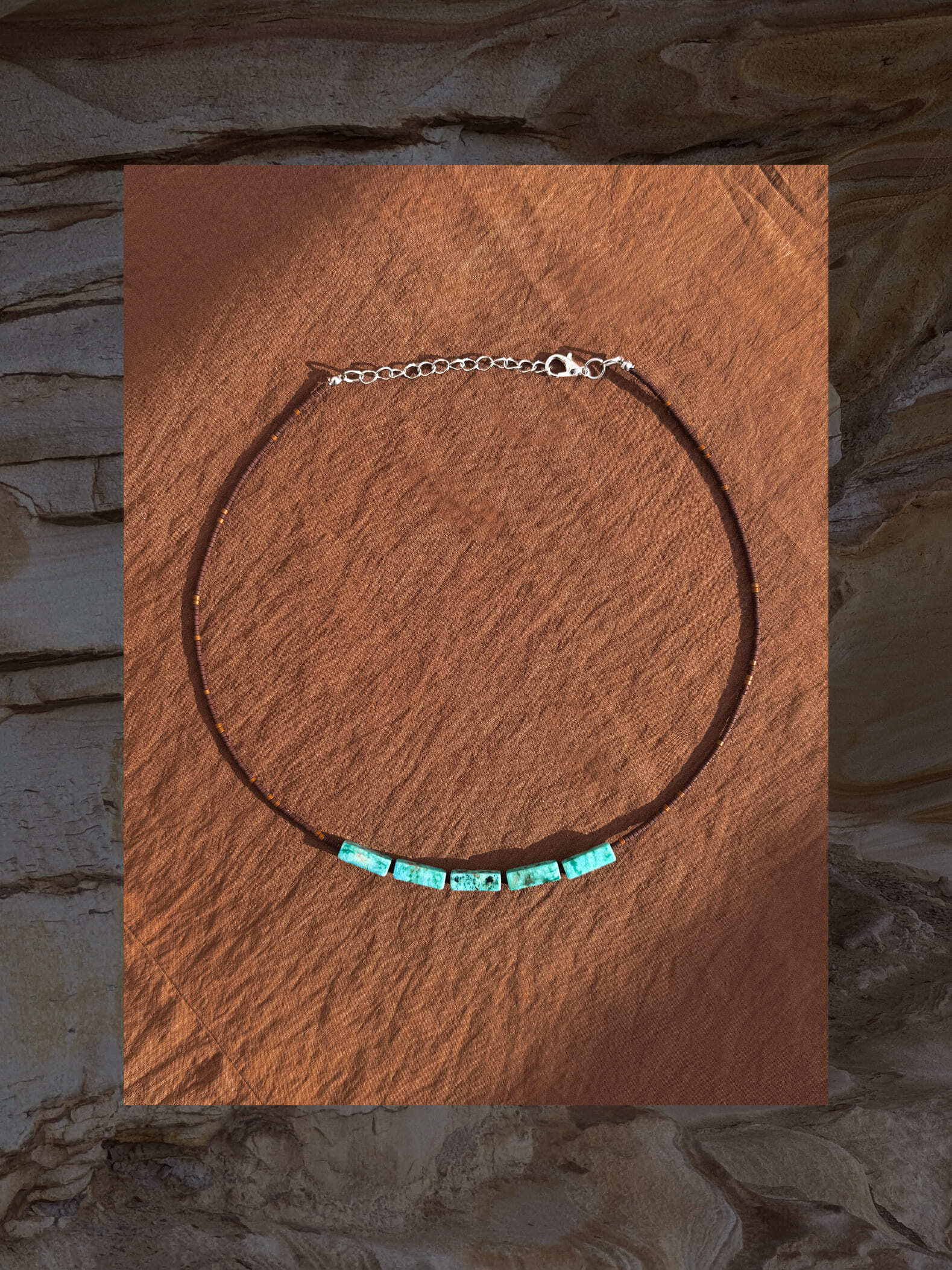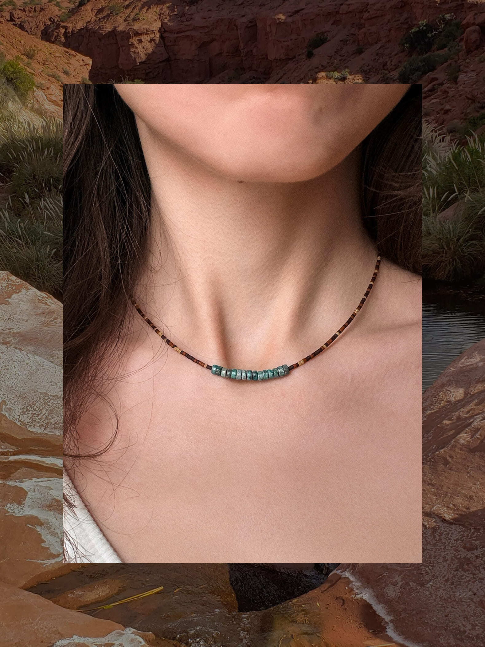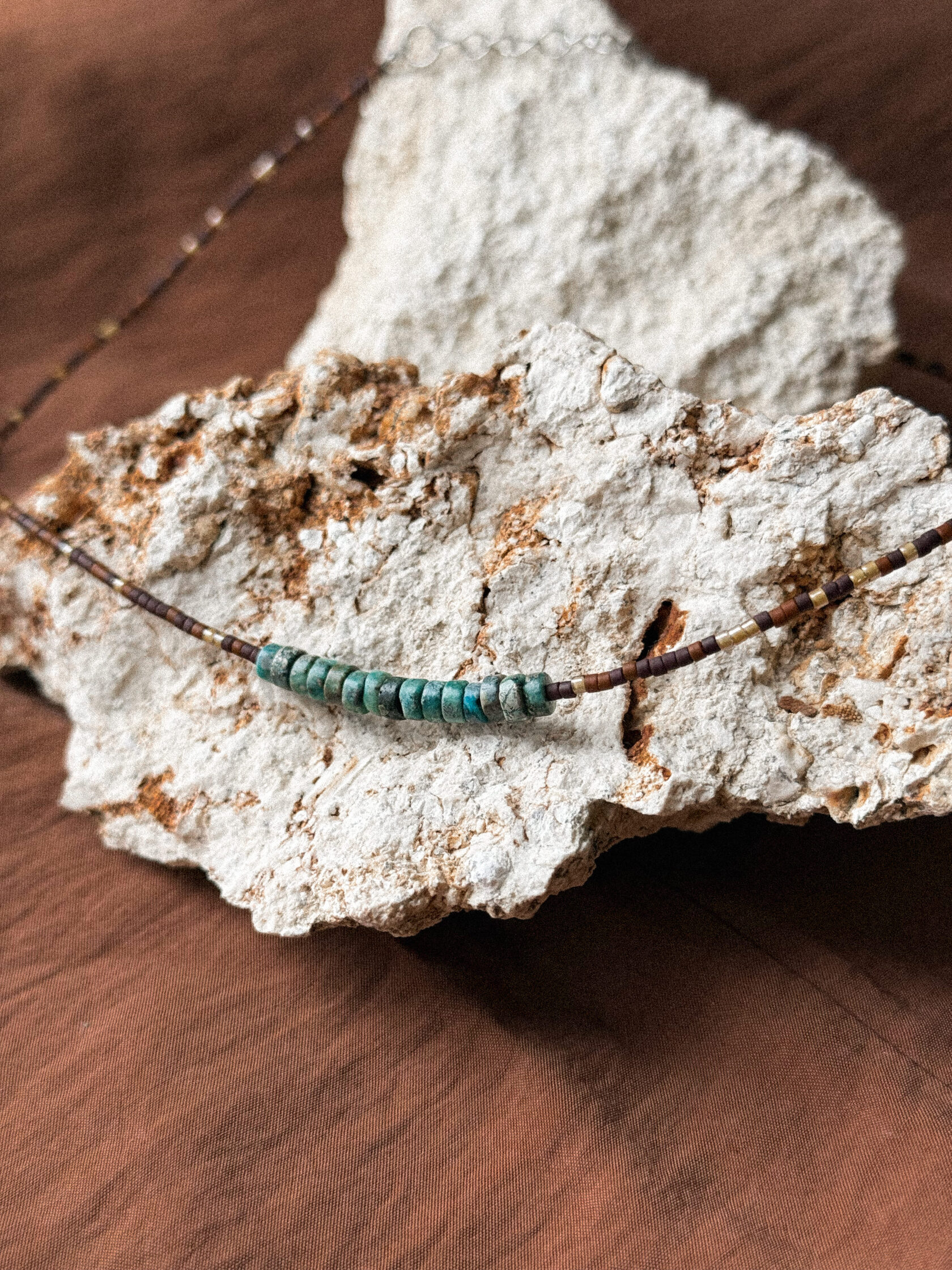 Inspired by the raw textures of a mountain landscape, the Creek necklace represents a narrow path of life. The central turquoise stones symbolize pure water frozen in the heart of earth's rocks. It's handmade from high-quality glass beads, stainless steel, and natural Chrysocolla.