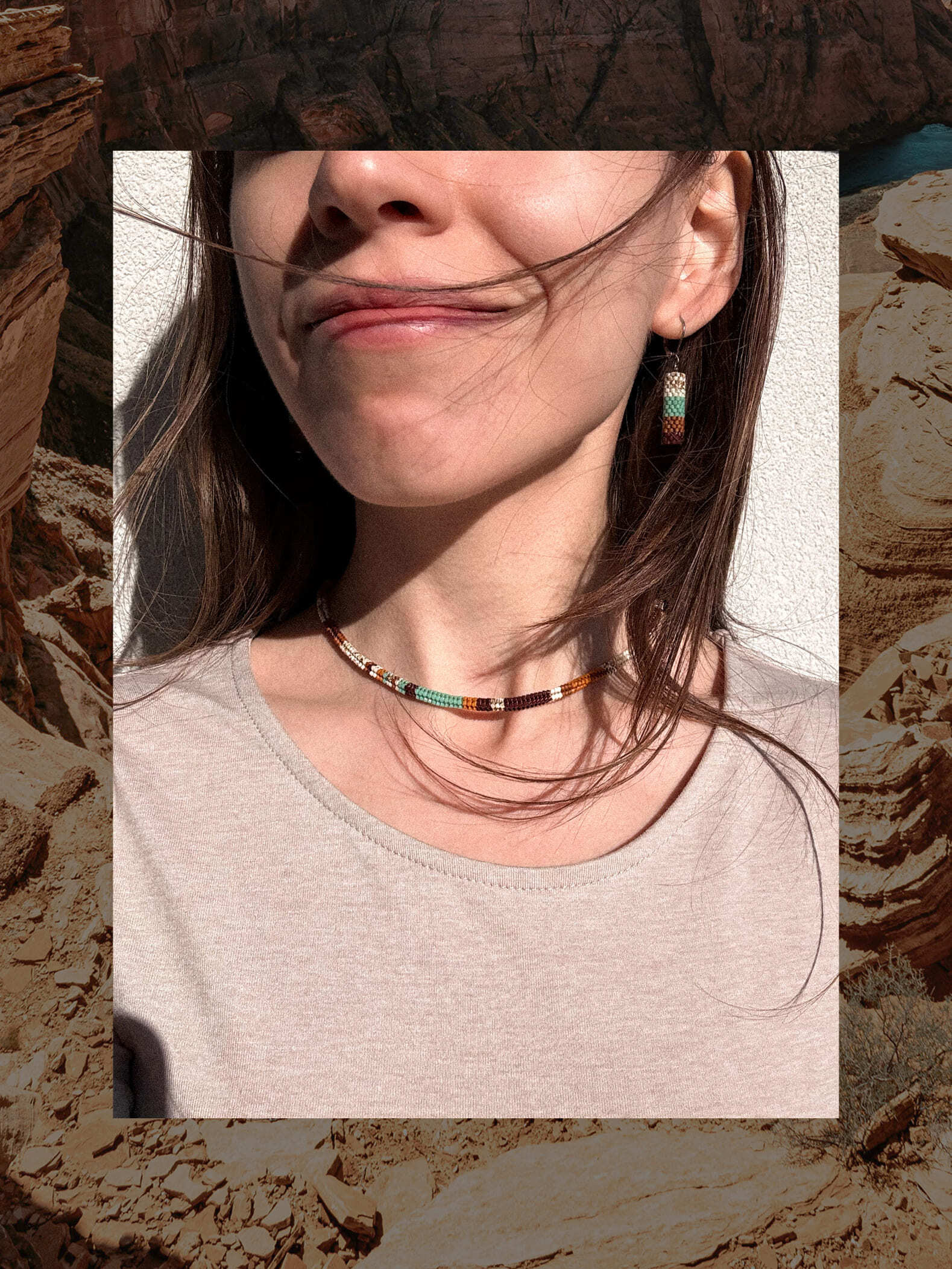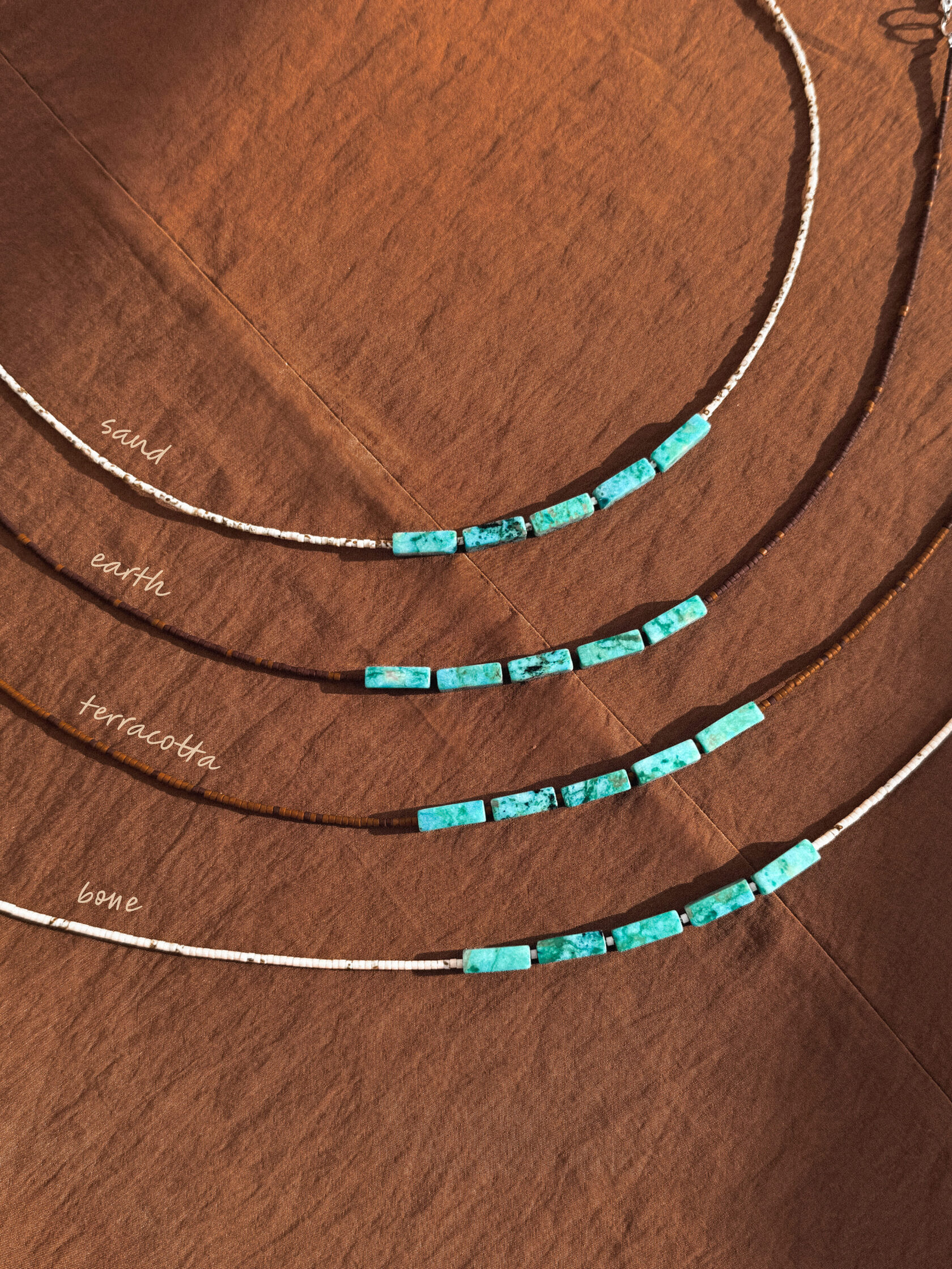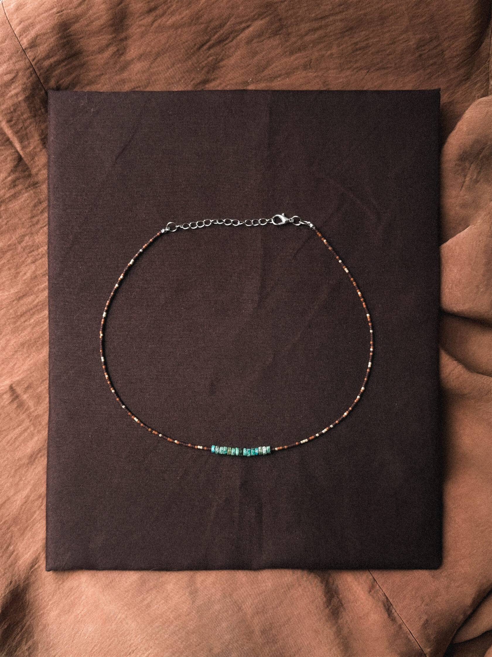 Inspired by the raw textures of a mountain landscape, the Creek necklace represents a narrow path of life. The central turquoise stones symbolize pure water frozen in the heart of earth's rocks. It's handmade from high-quality glass beads, stainless steel, and natural Chrysocolla.