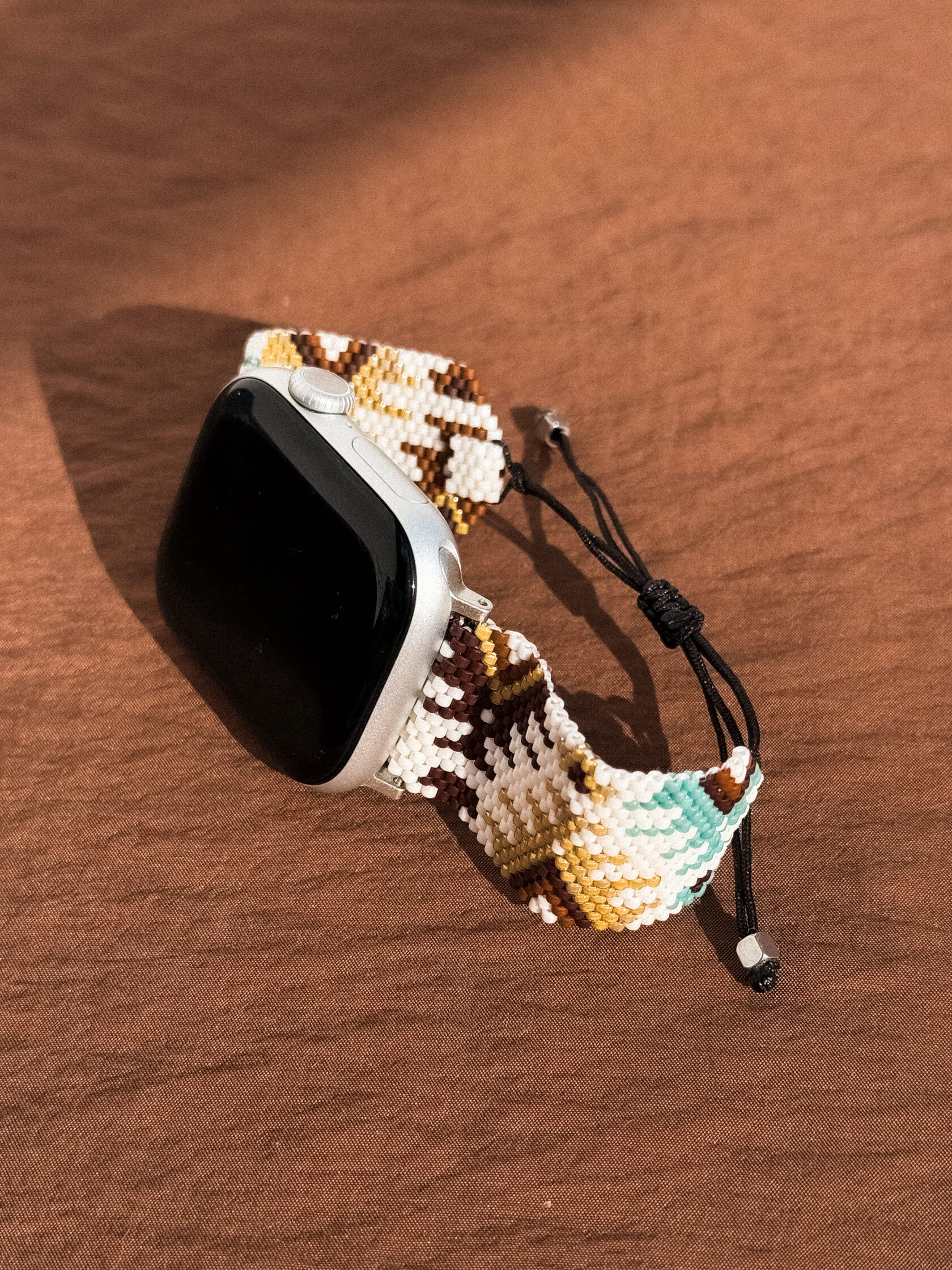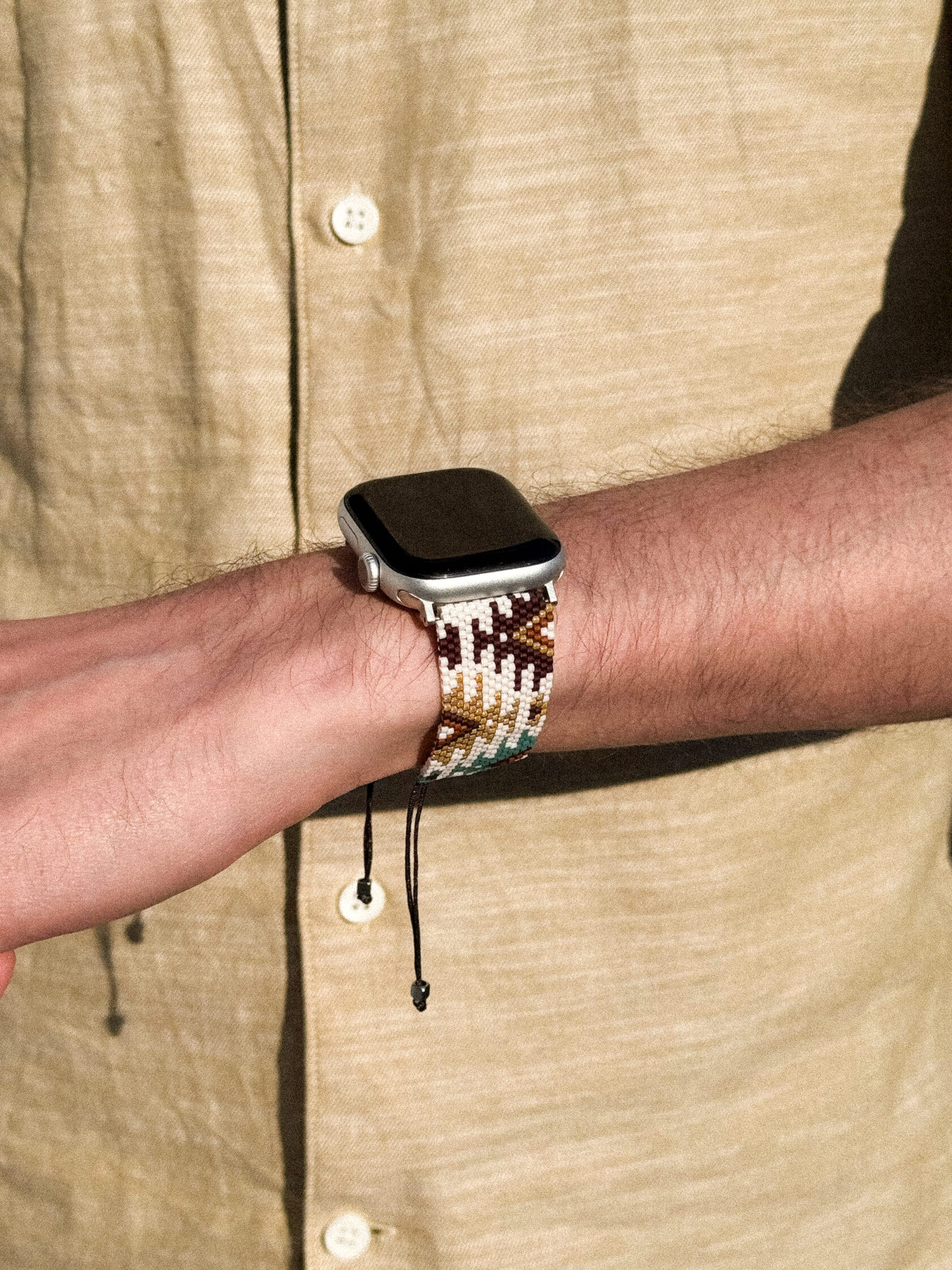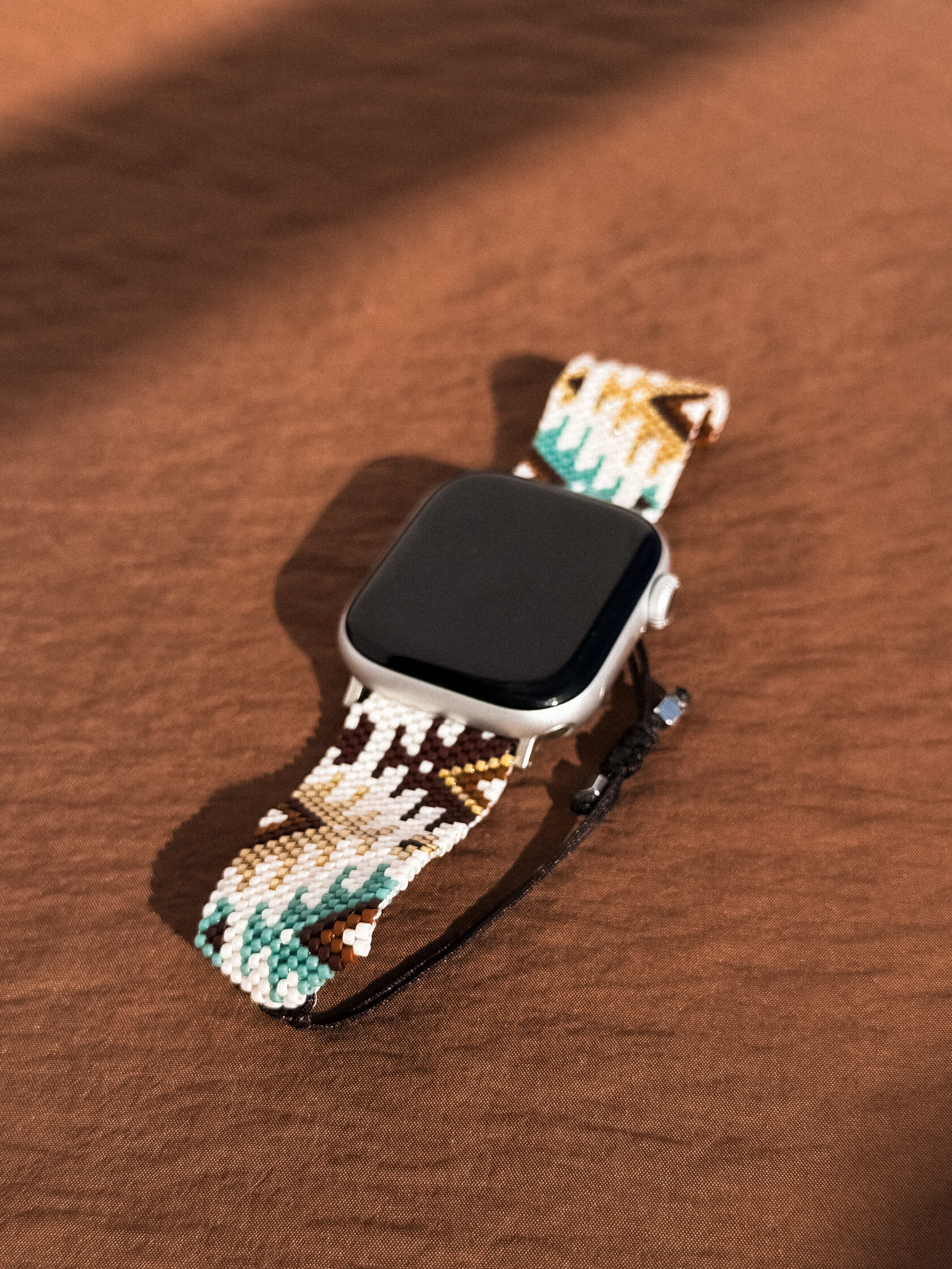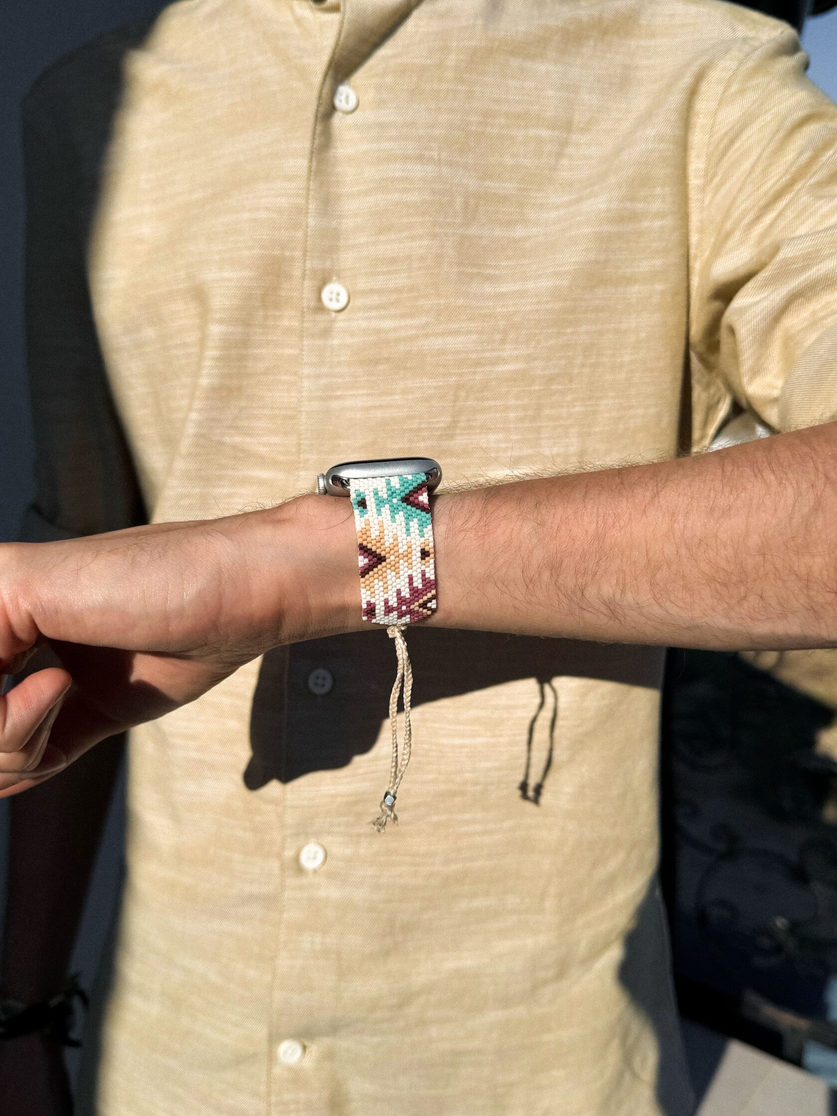 This Apple Watch band is inspired by the weaving traditions and rugged landscapes of the American Southwest. The palette of terracotta, sandstone, and turquoise reflects a deep connection to the earth, mimicking the mineral-rich layers of the canyons and the expansive desert horizon.
