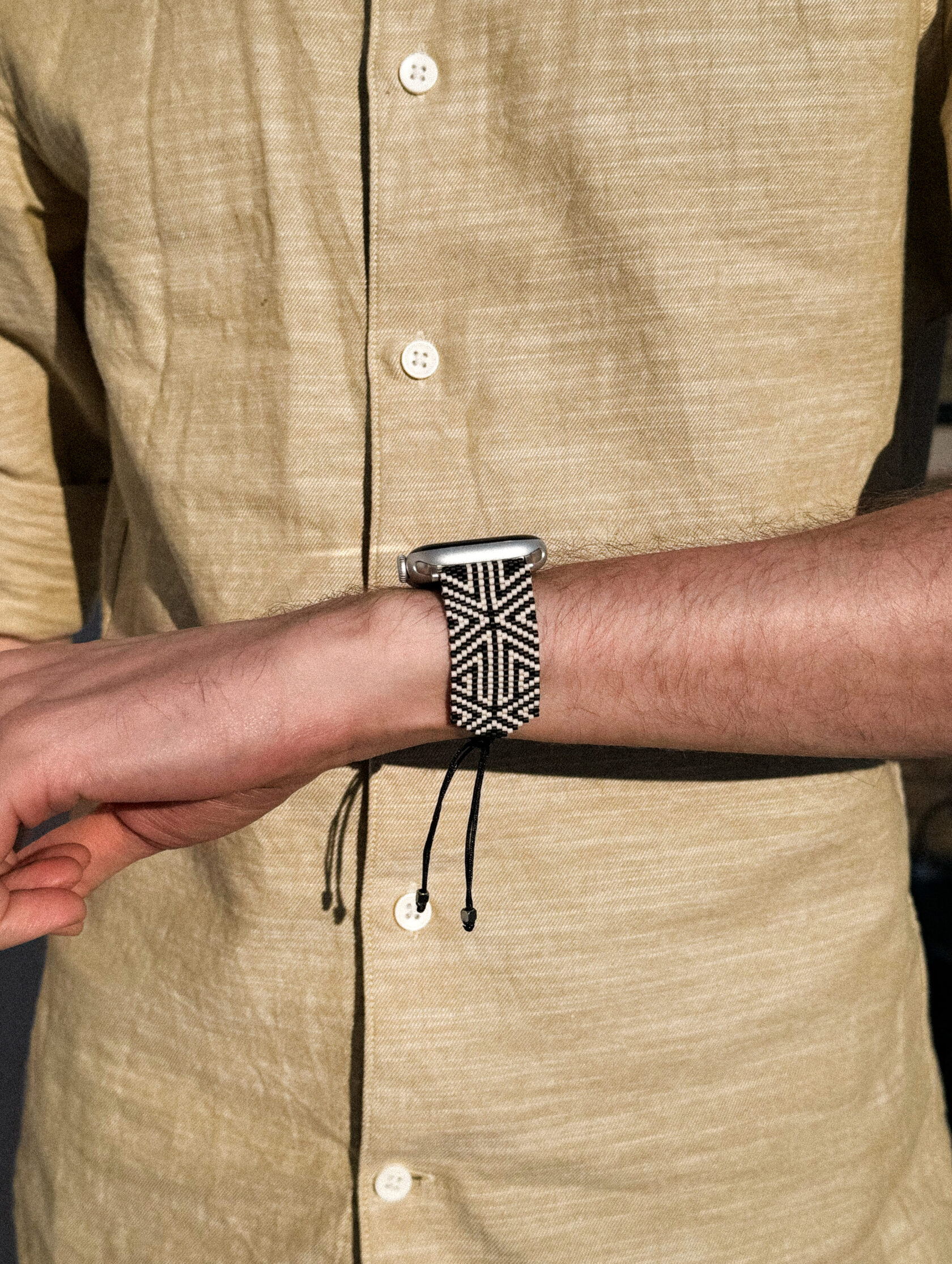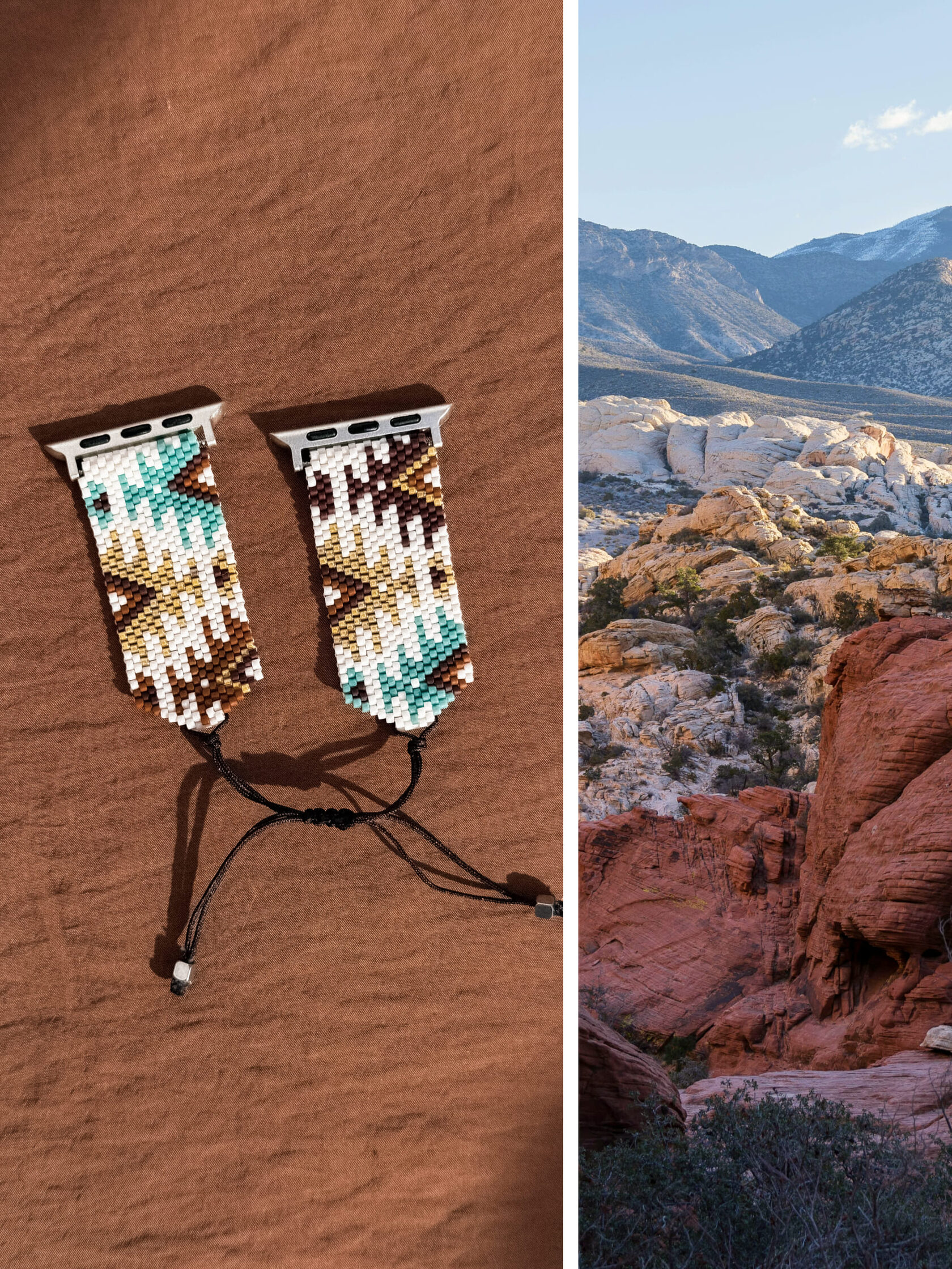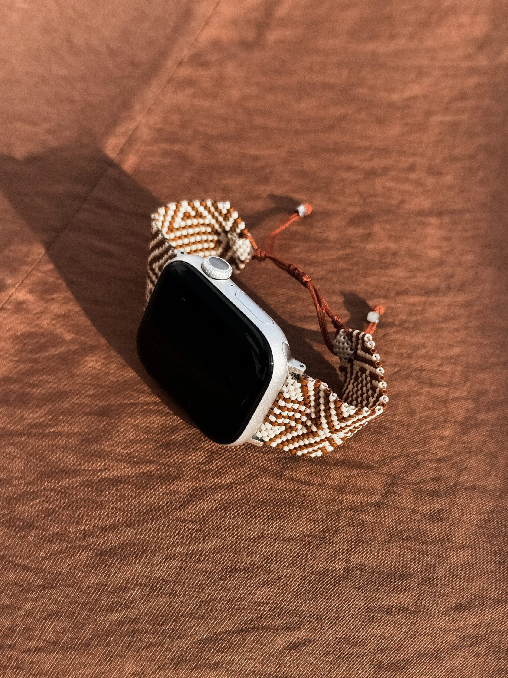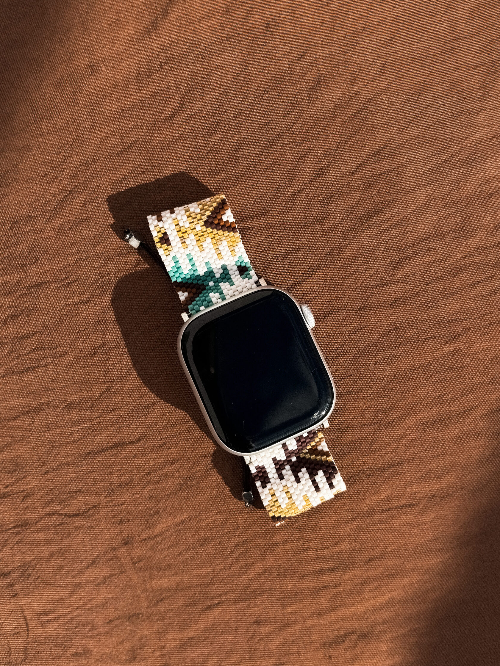 This Apple Watch band is inspired by the weaving traditions and rugged landscapes of the American Southwest. The palette of terracotta, sandstone, and turquoise reflects a deep connection to the earth, mimicking the mineral-rich layers of the canyons and the expansive desert horizon.