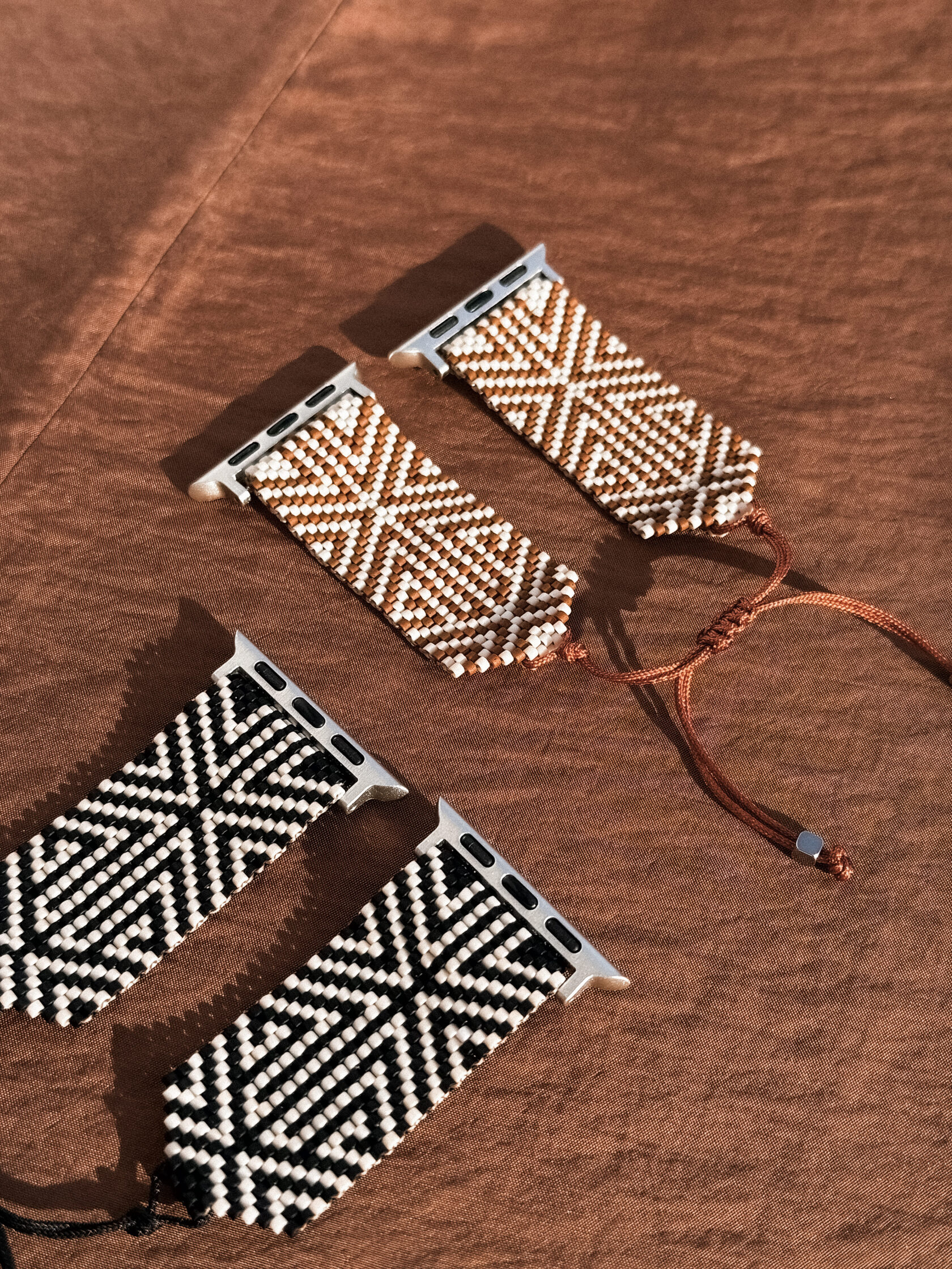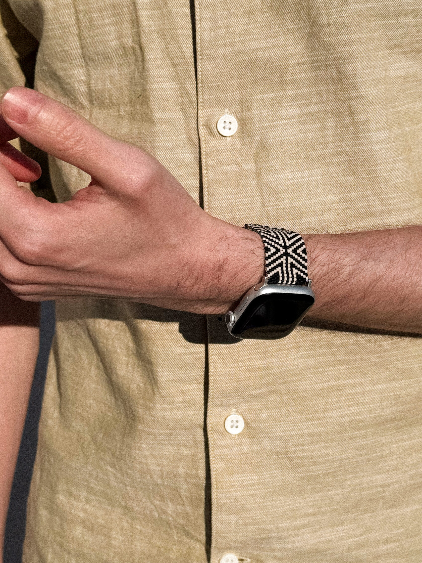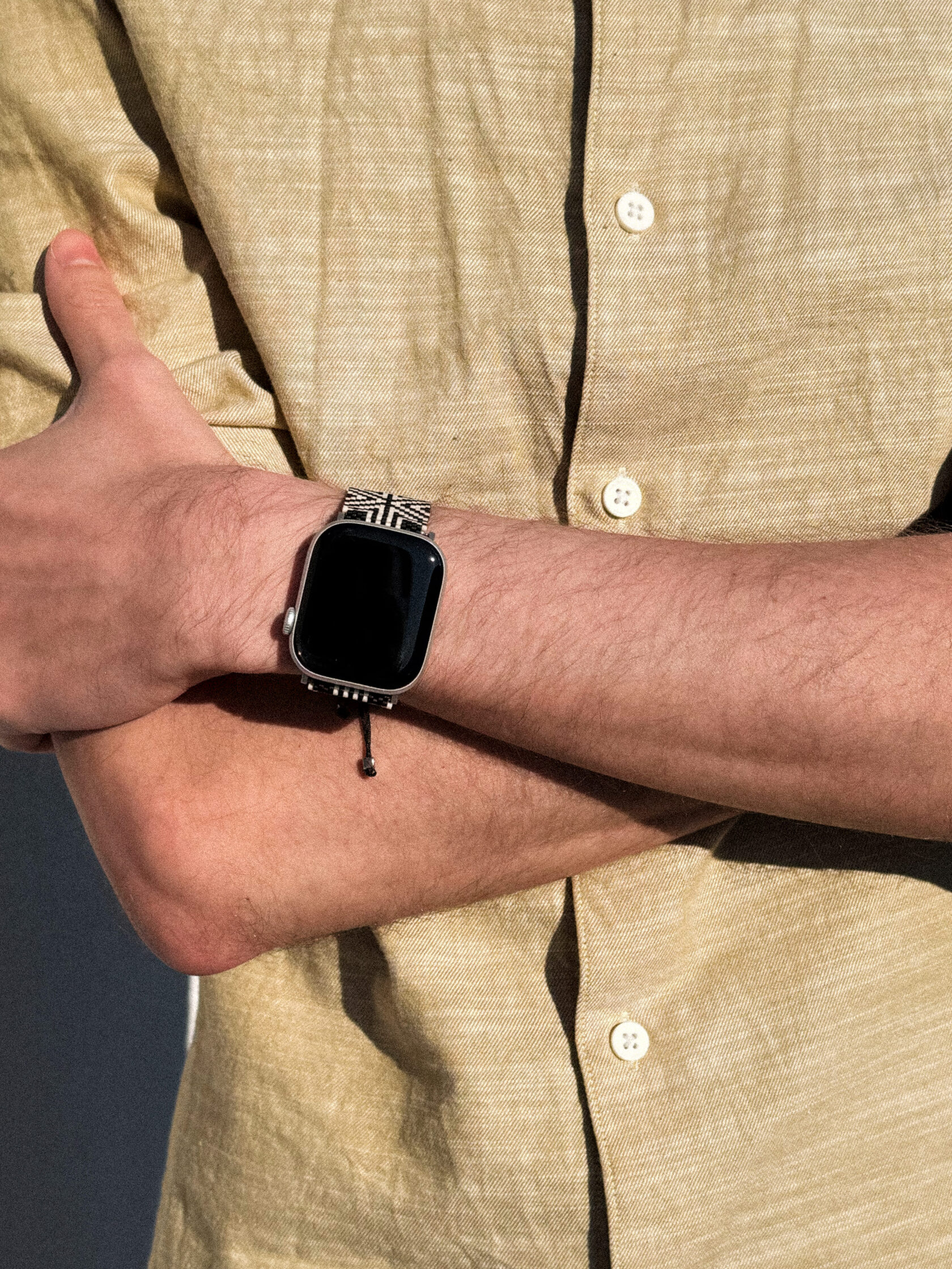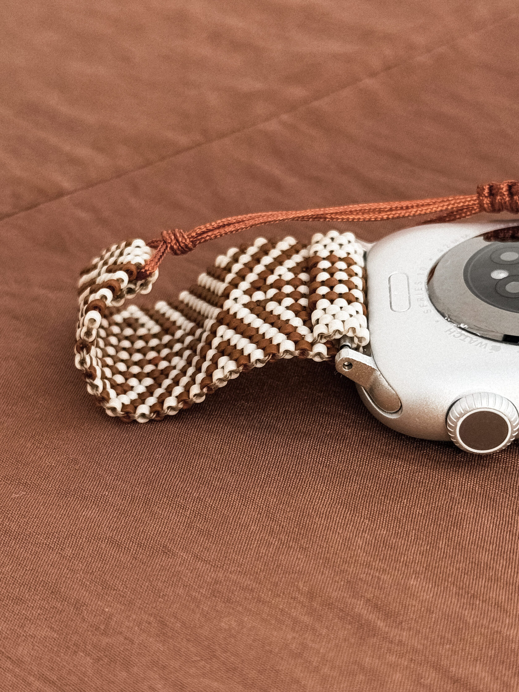 This Apple Watch band is inspired by the weaving traditions and rugged landscapes of the American Southwest. The palette of terracotta, sandstone, and turquoise reflects a deep connection to the earth, mimicking the mineral-rich layers of the canyons and the expansive desert horizon.