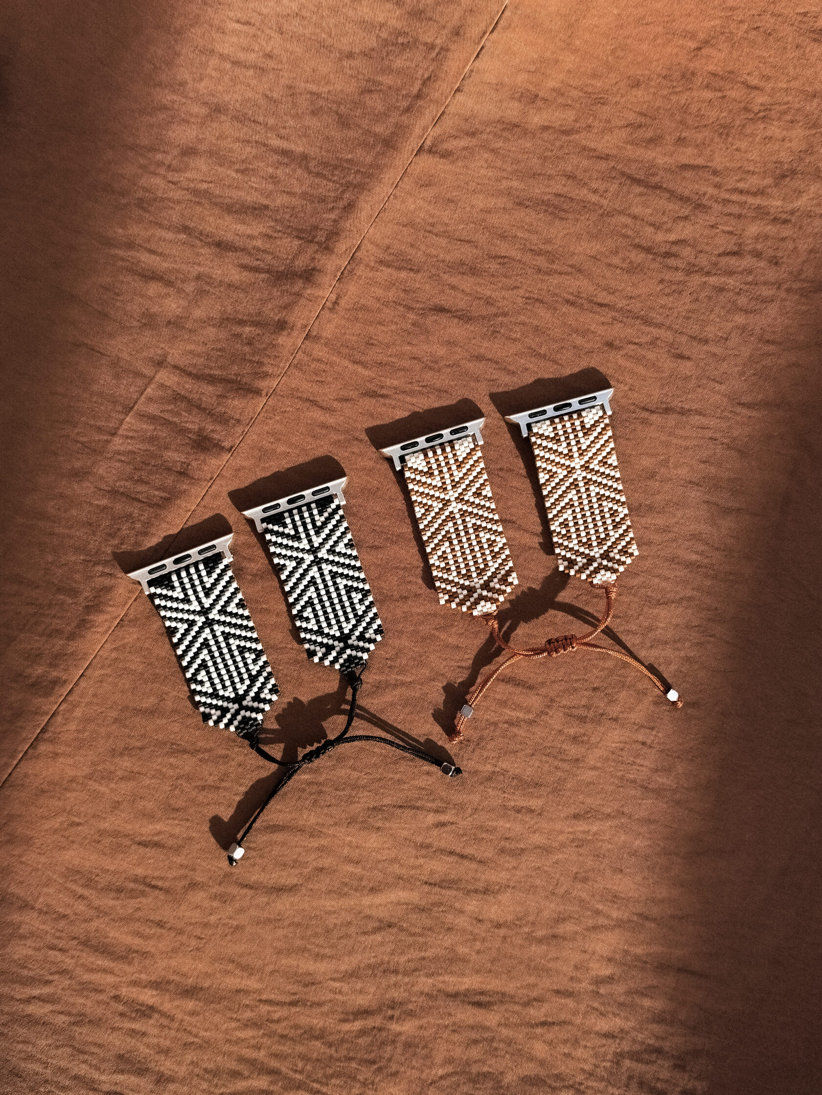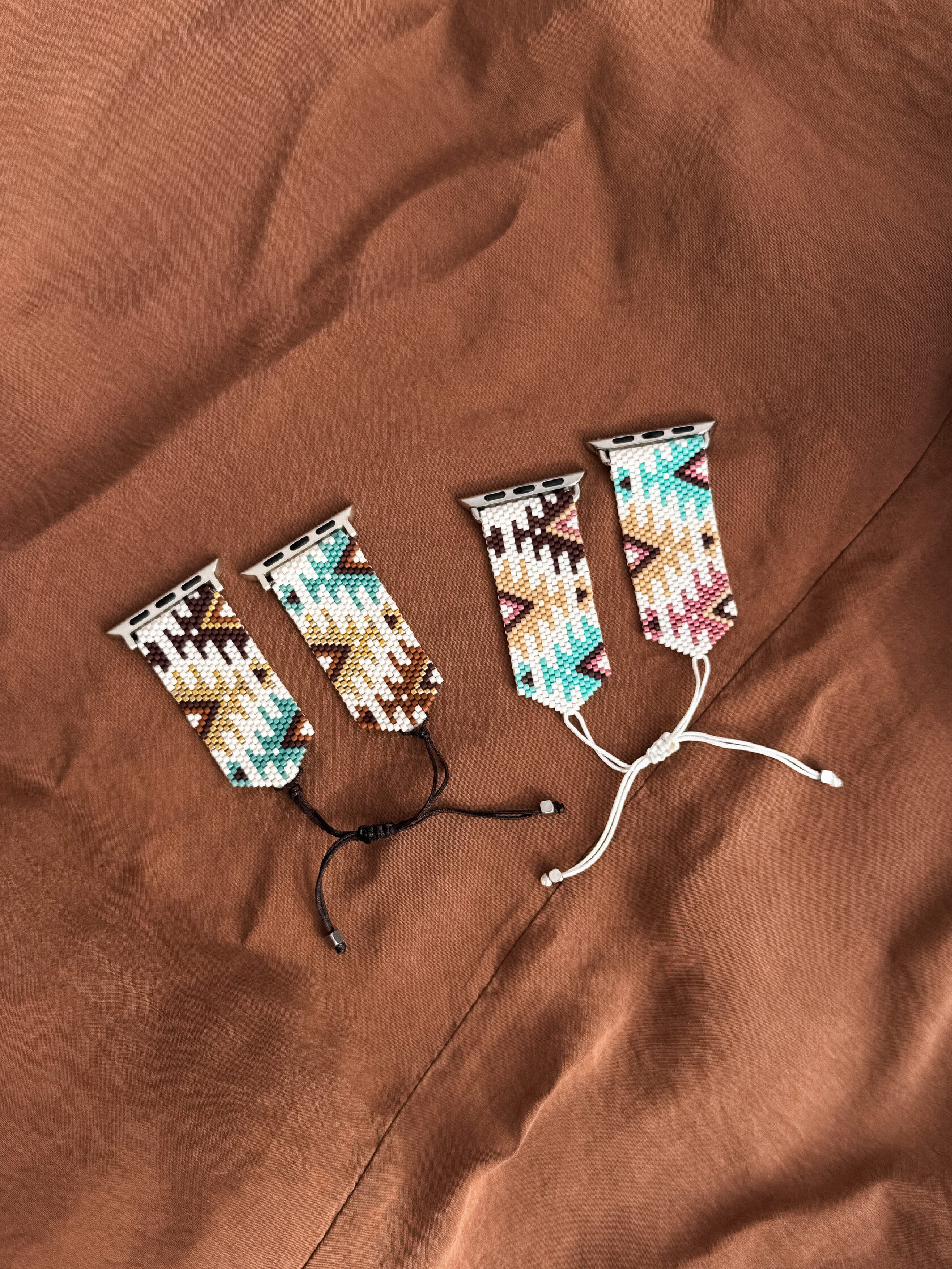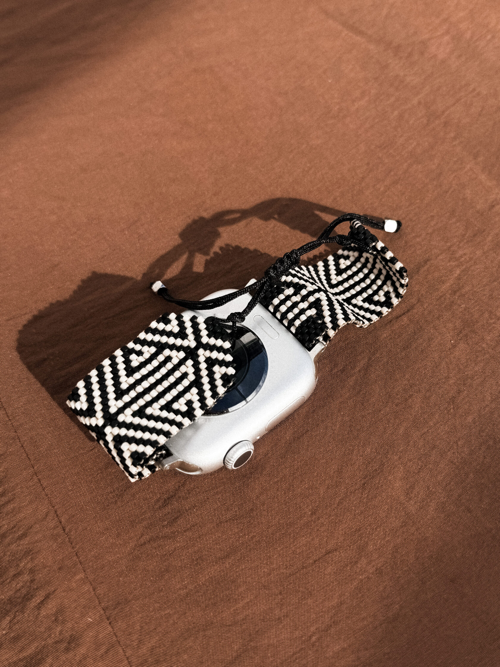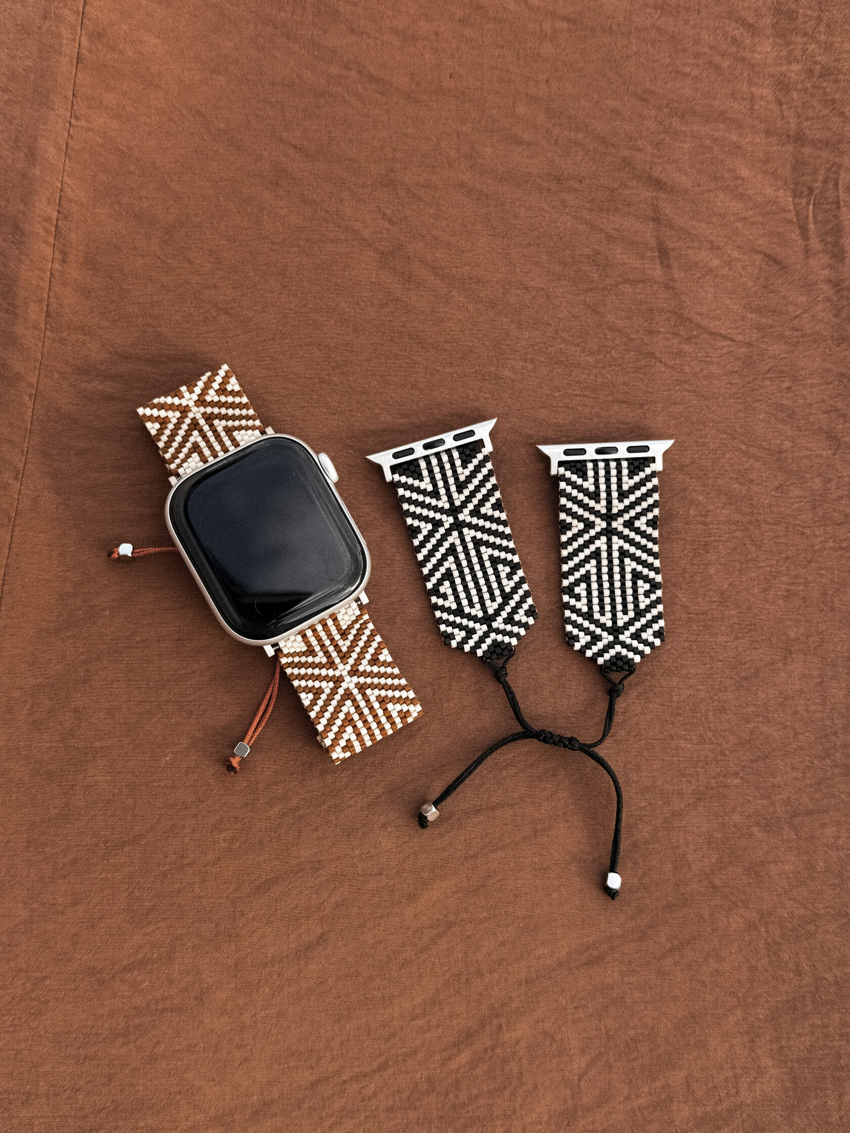 This Apple Watch band is inspired by the weaving traditions and rugged landscapes of the American Southwest. The palette of terracotta, sandstone, and turquoise reflects a deep connection to the earth, mimicking the mineral-rich layers of the canyons and the expansive desert horizon.