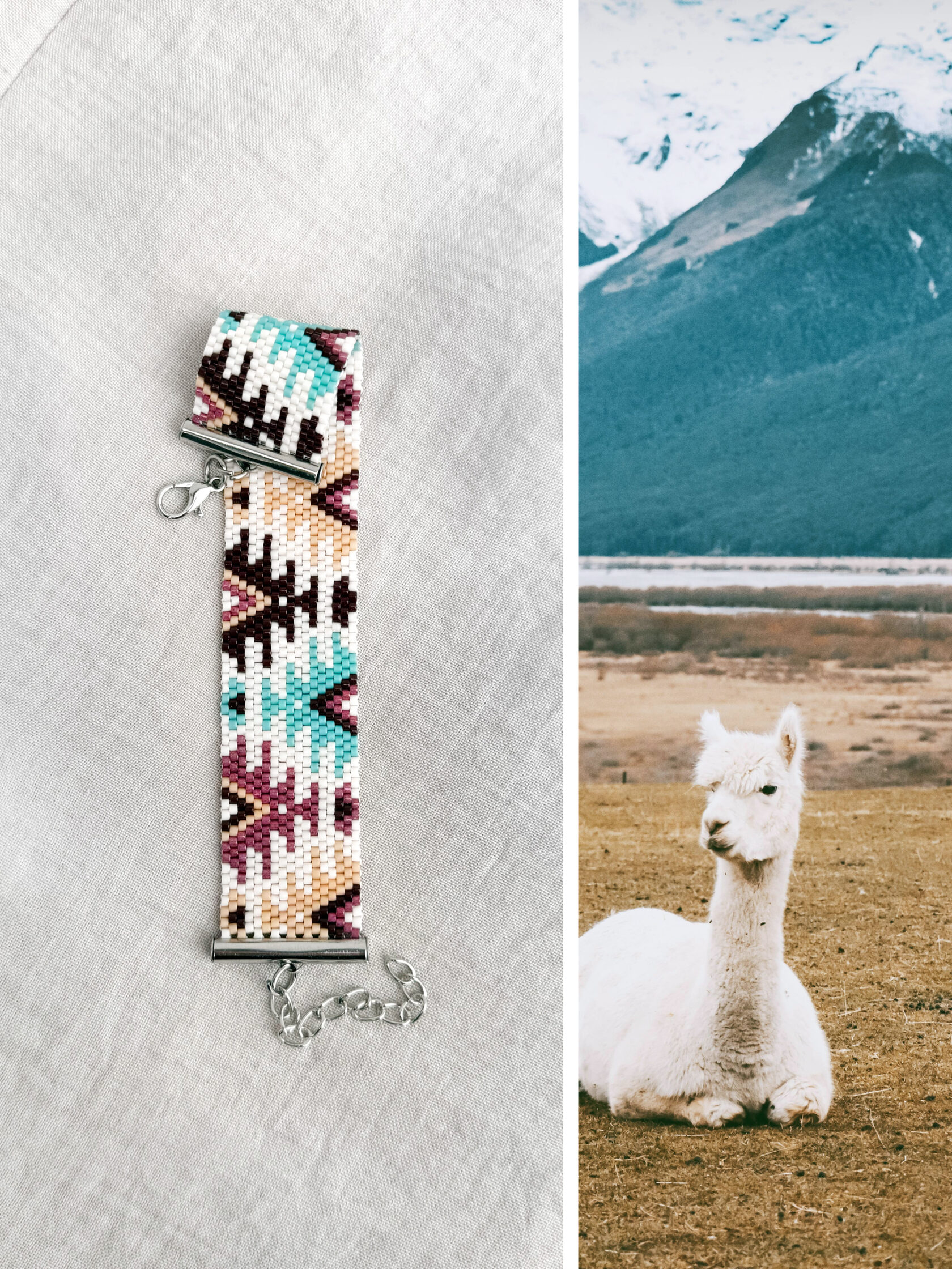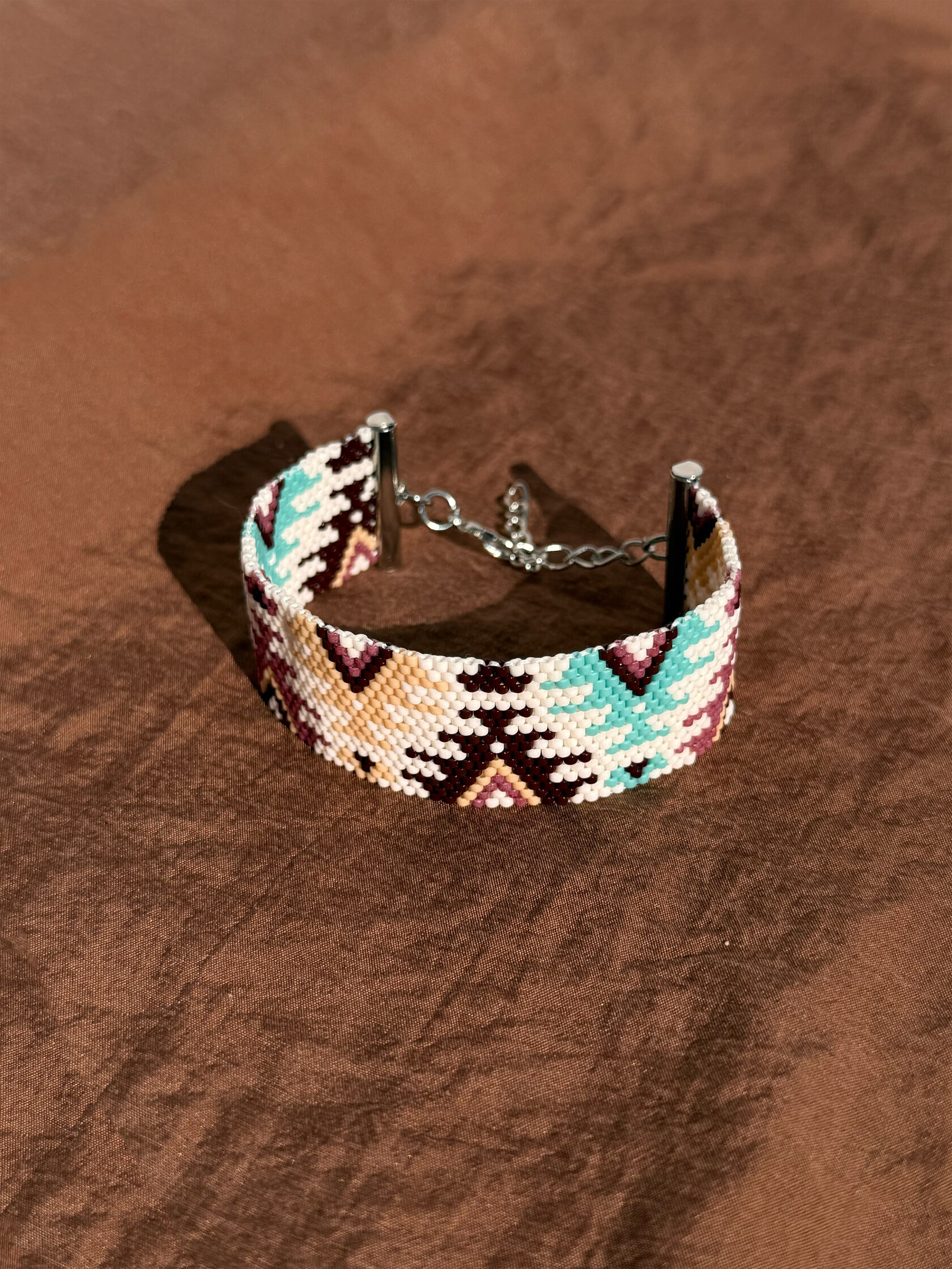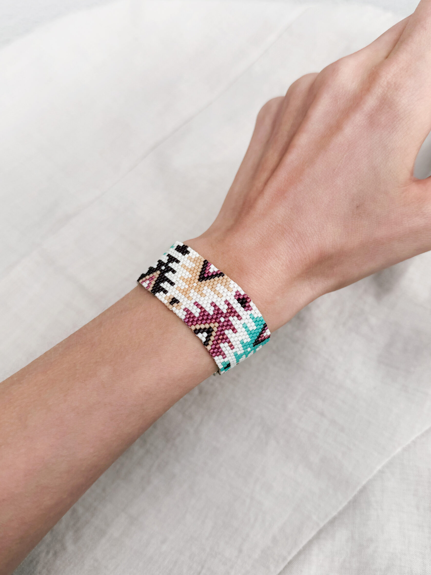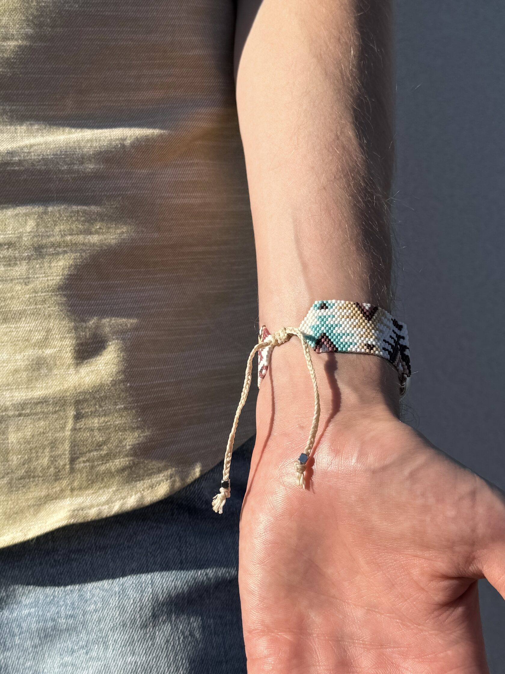 This bracelet inspired by ethnic art of Quechua people living in the Andes. Colors that refer to light alpaca wool, Andean minerals, and lush high-altitude grasses reflect their deep connection to nature and the earth.