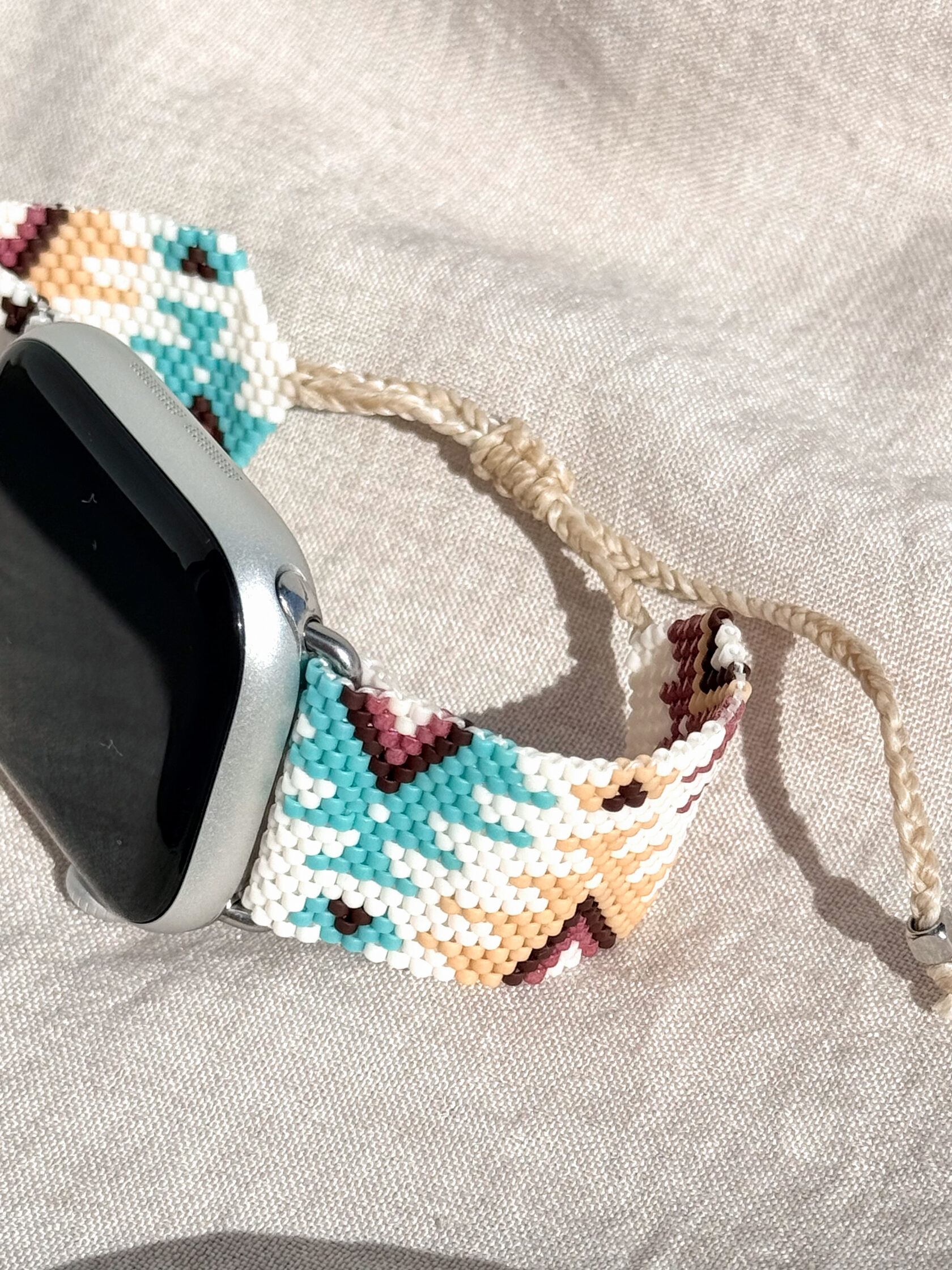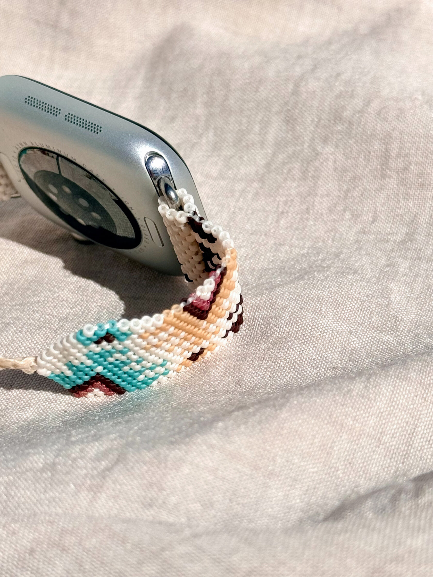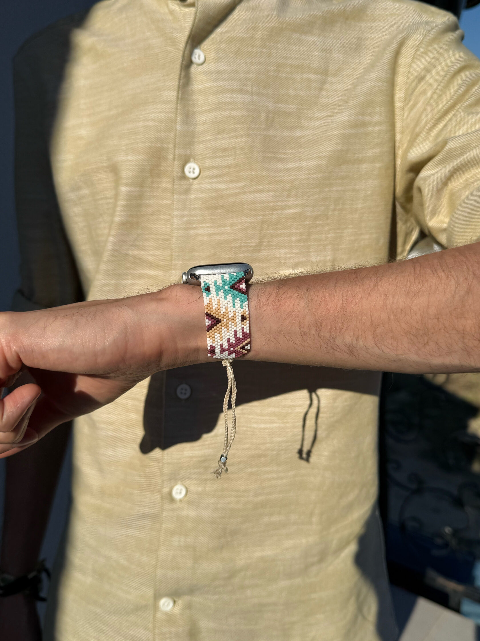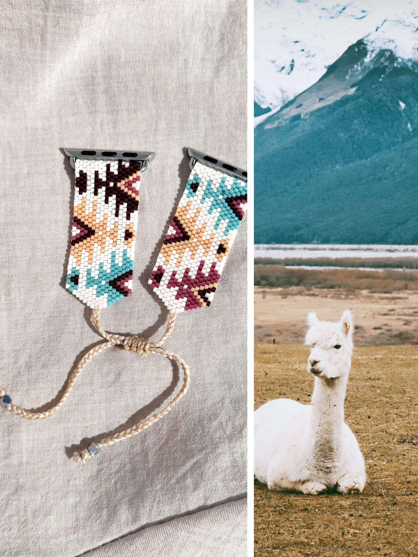 Apple Watch band with drawstrings, inspired by ethnic art of Quechua people living in the Andes. Colors that refer to light alpaca wool, Andean minerals, and lush high-altitude grasses reflect their deep connection to nature and the earth.