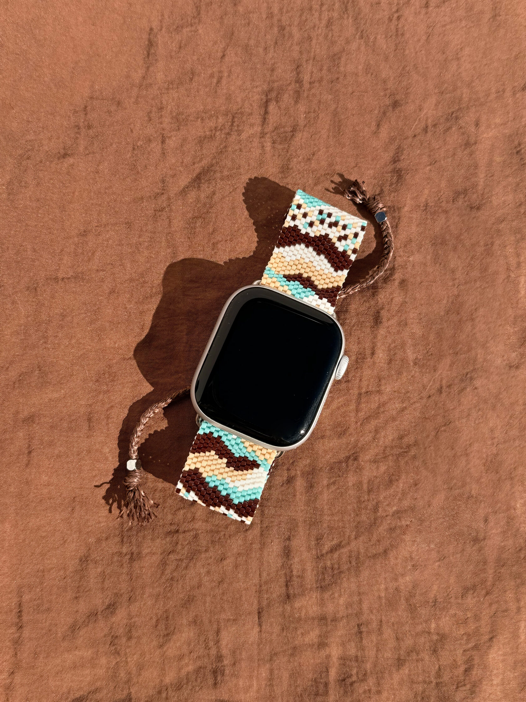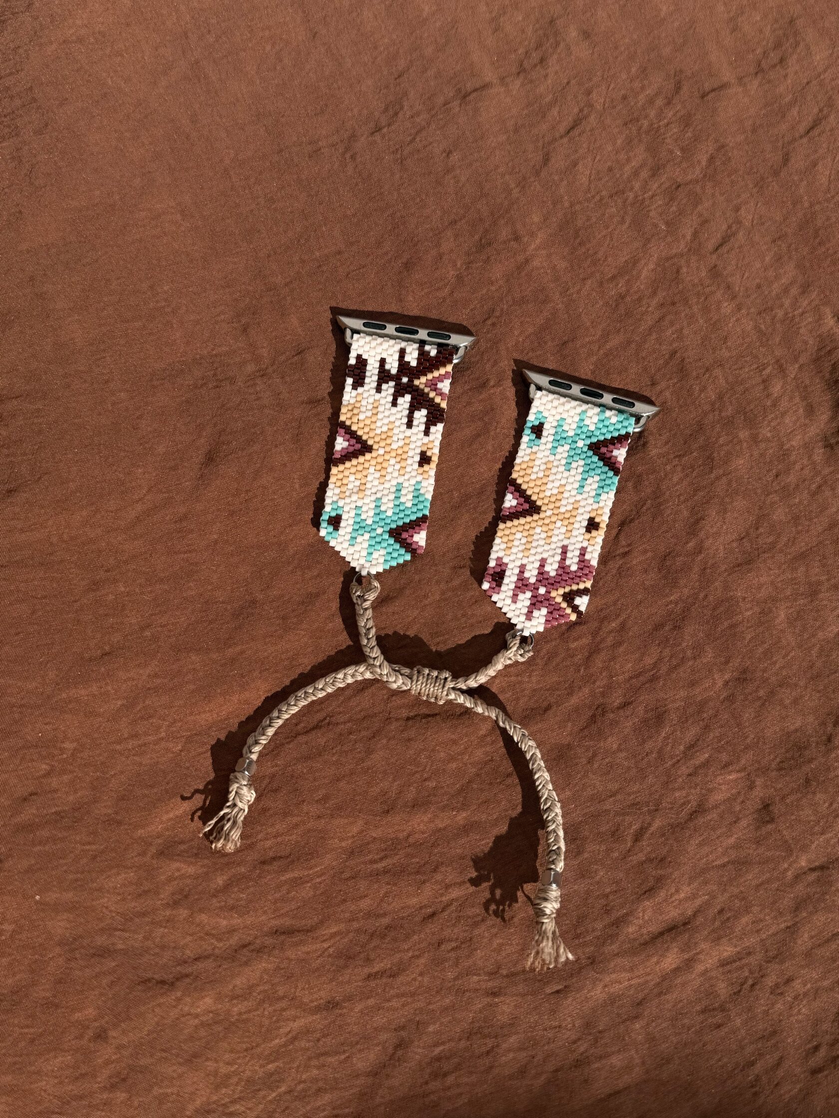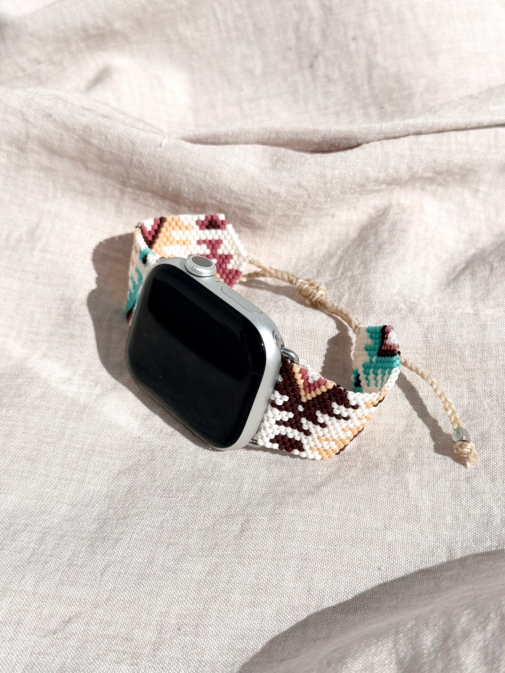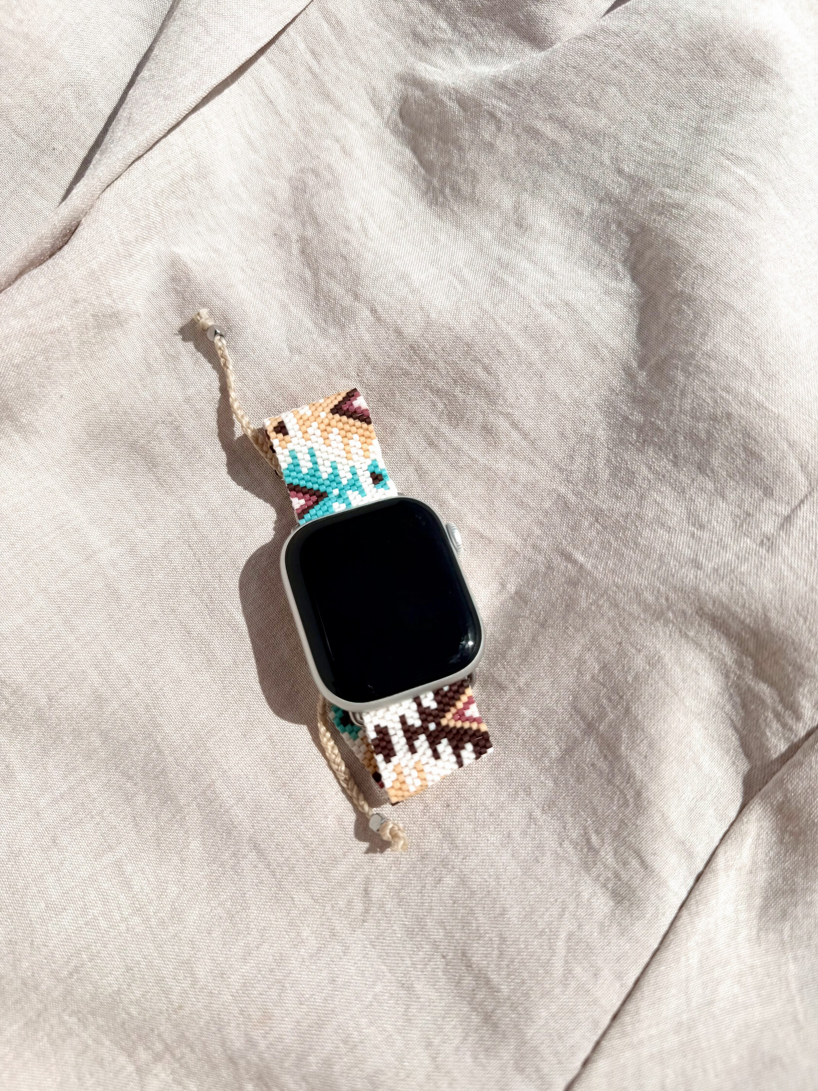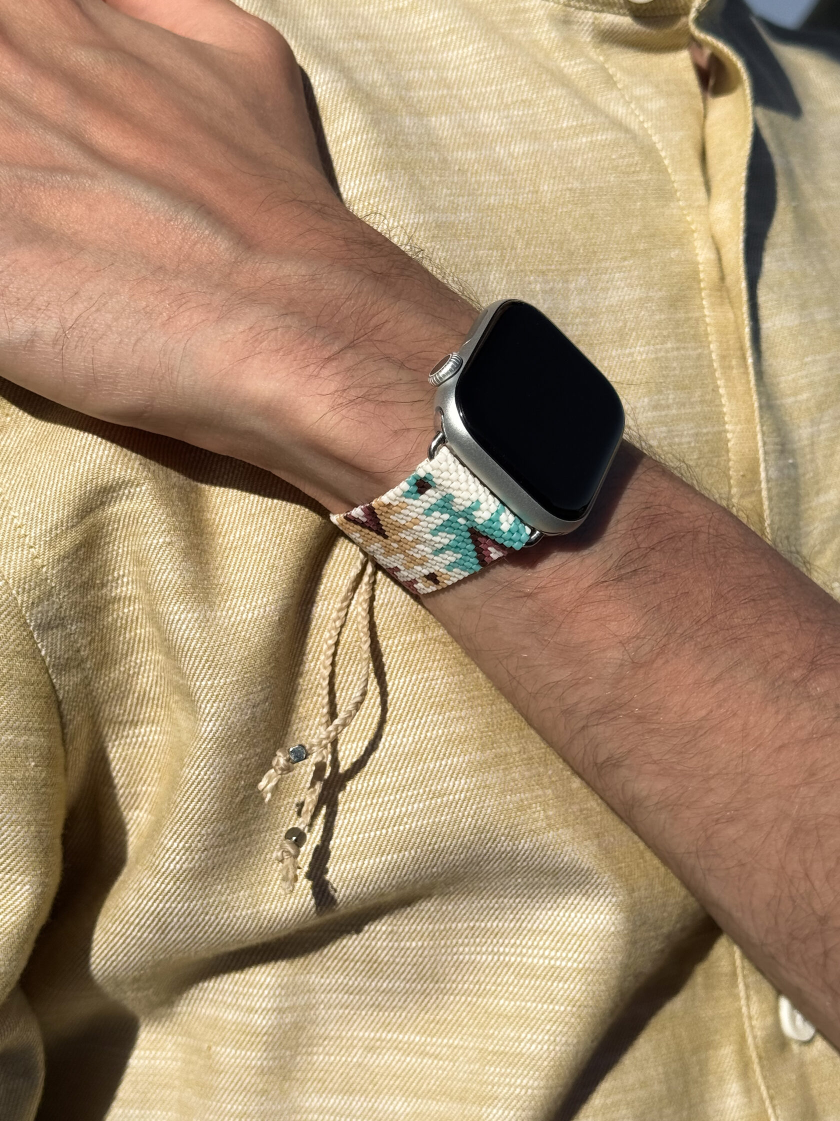 Apple Watch band with drawstrings, inspired by ethnic art of Quechua people living in the Andes. Colors that refer to light alpaca wool, Andean minerals, and lush high-altitude grasses reflect their deep connection to nature and the earth.
