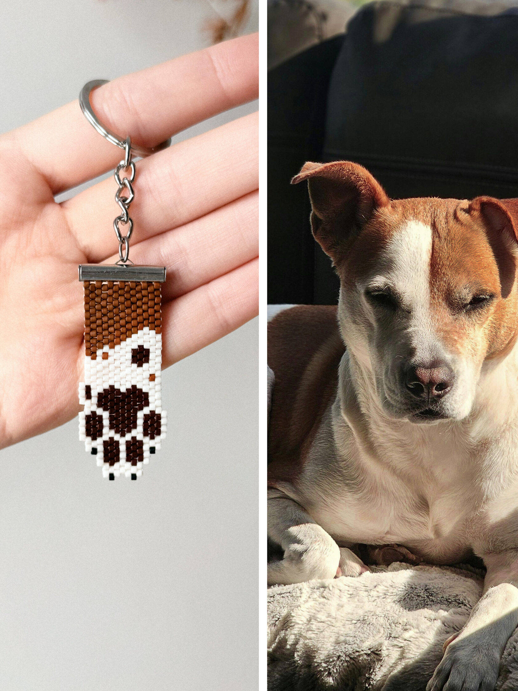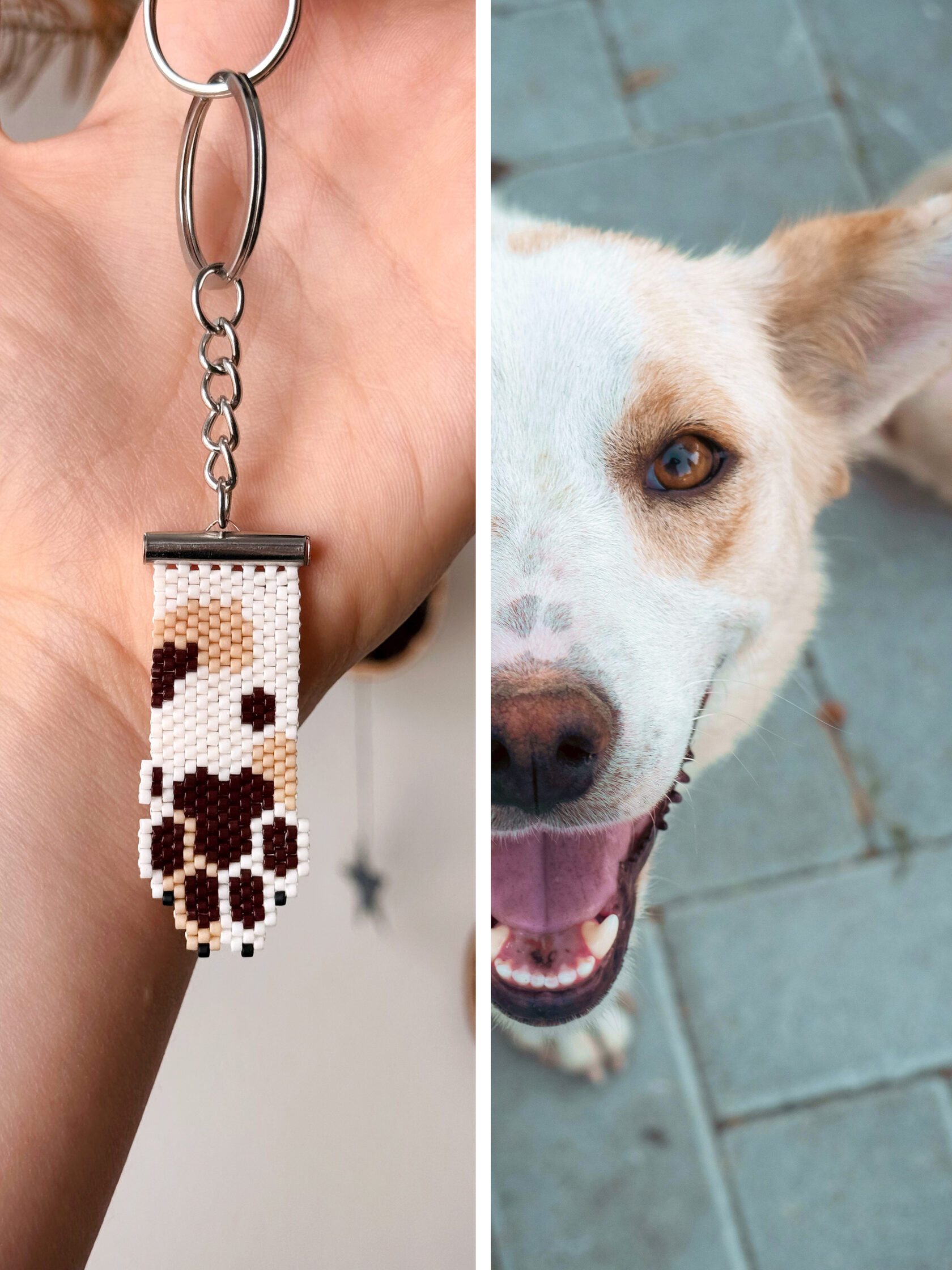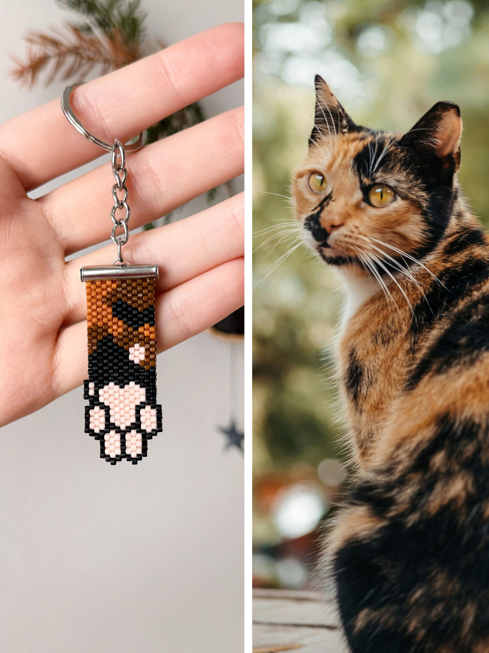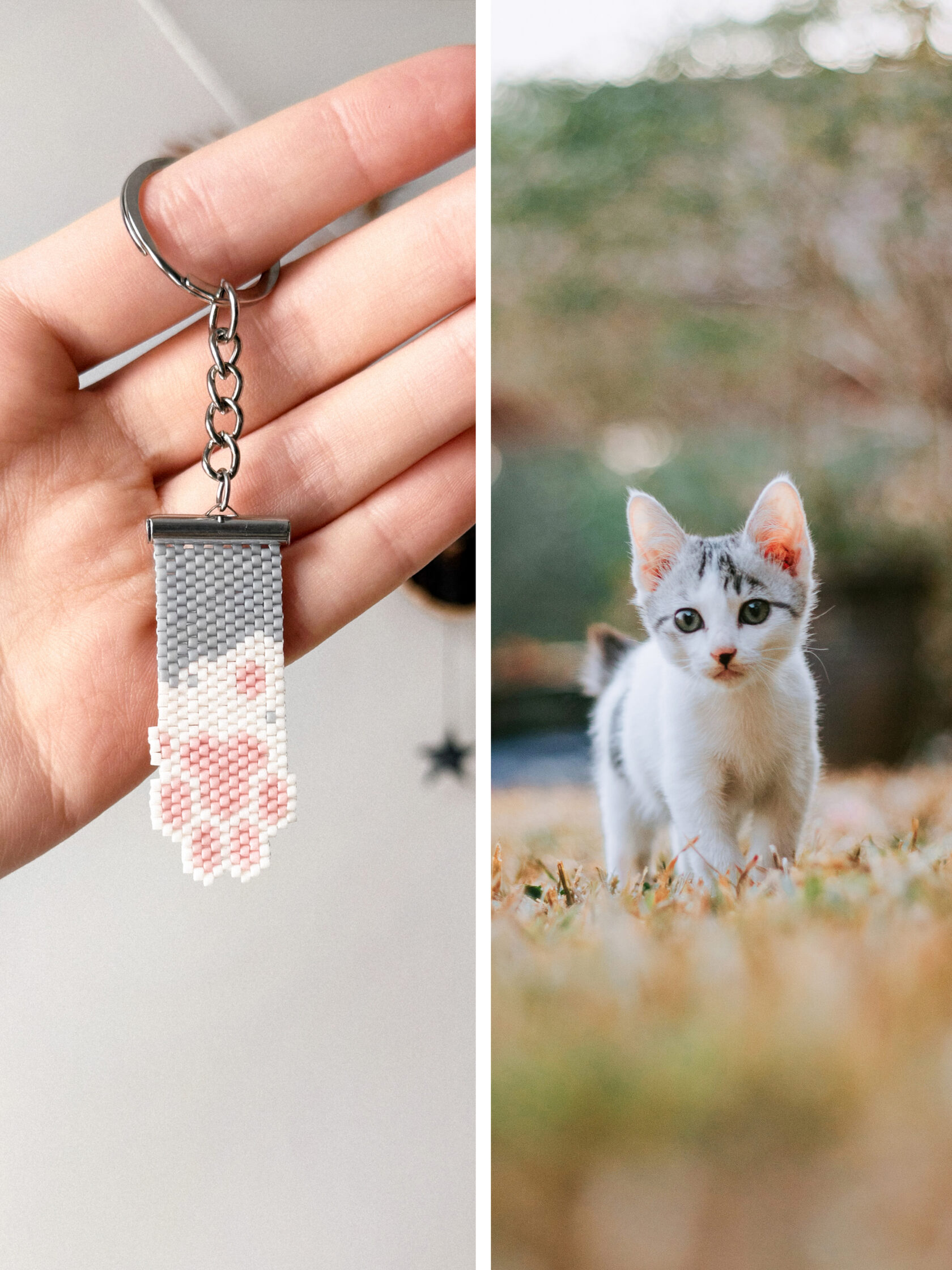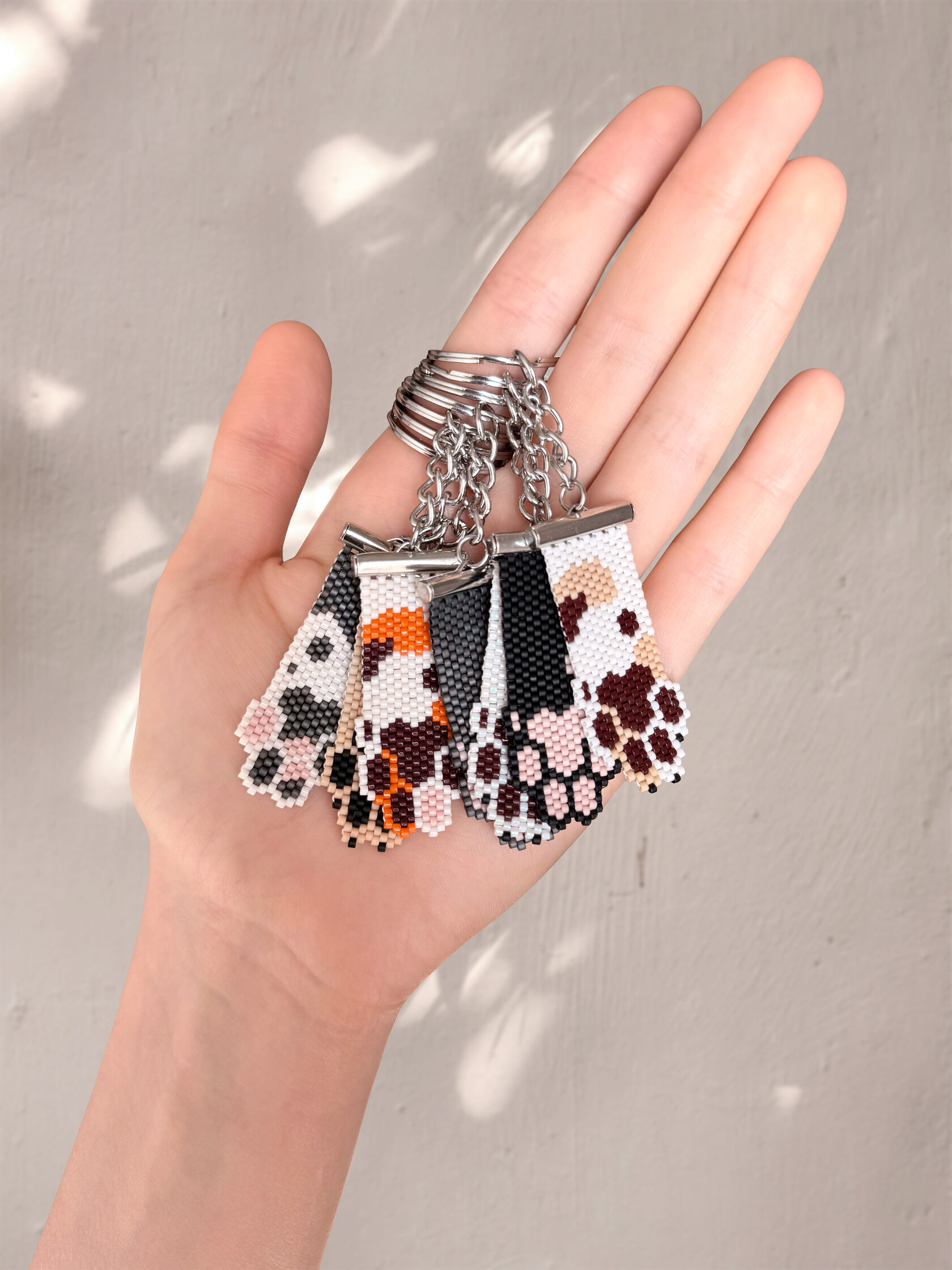 Cat or dog paw keychain in various colors handmade from glass beads and stainless steel using mosaic technique.