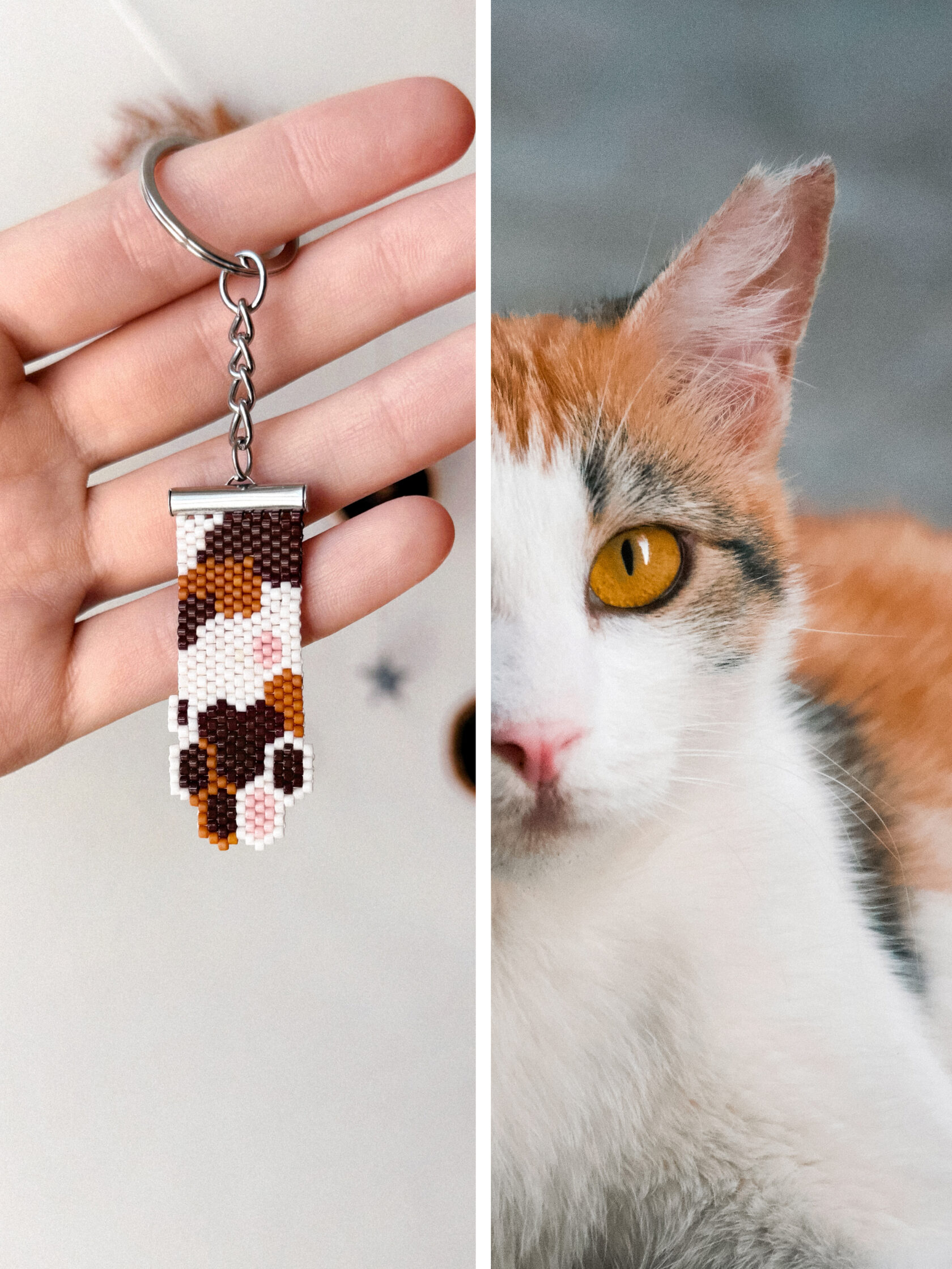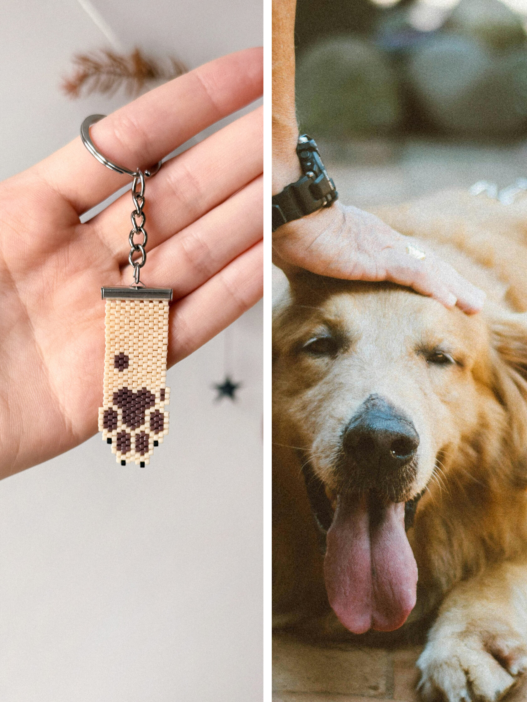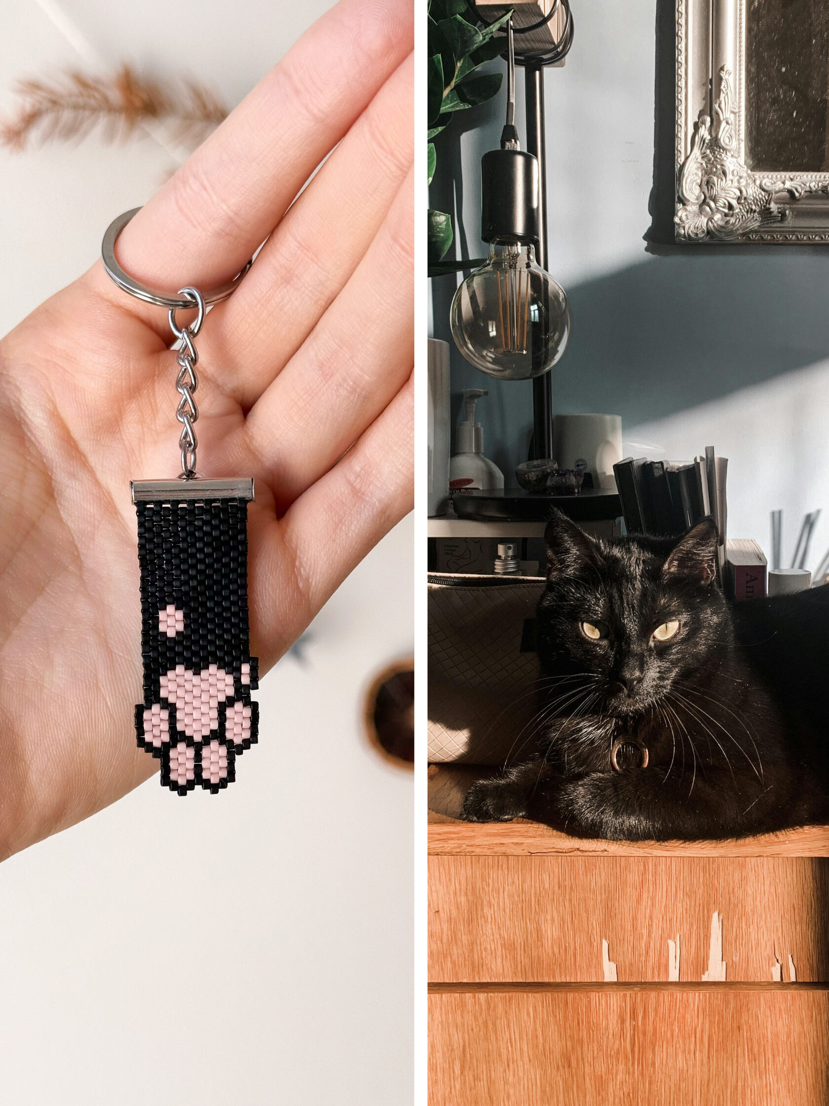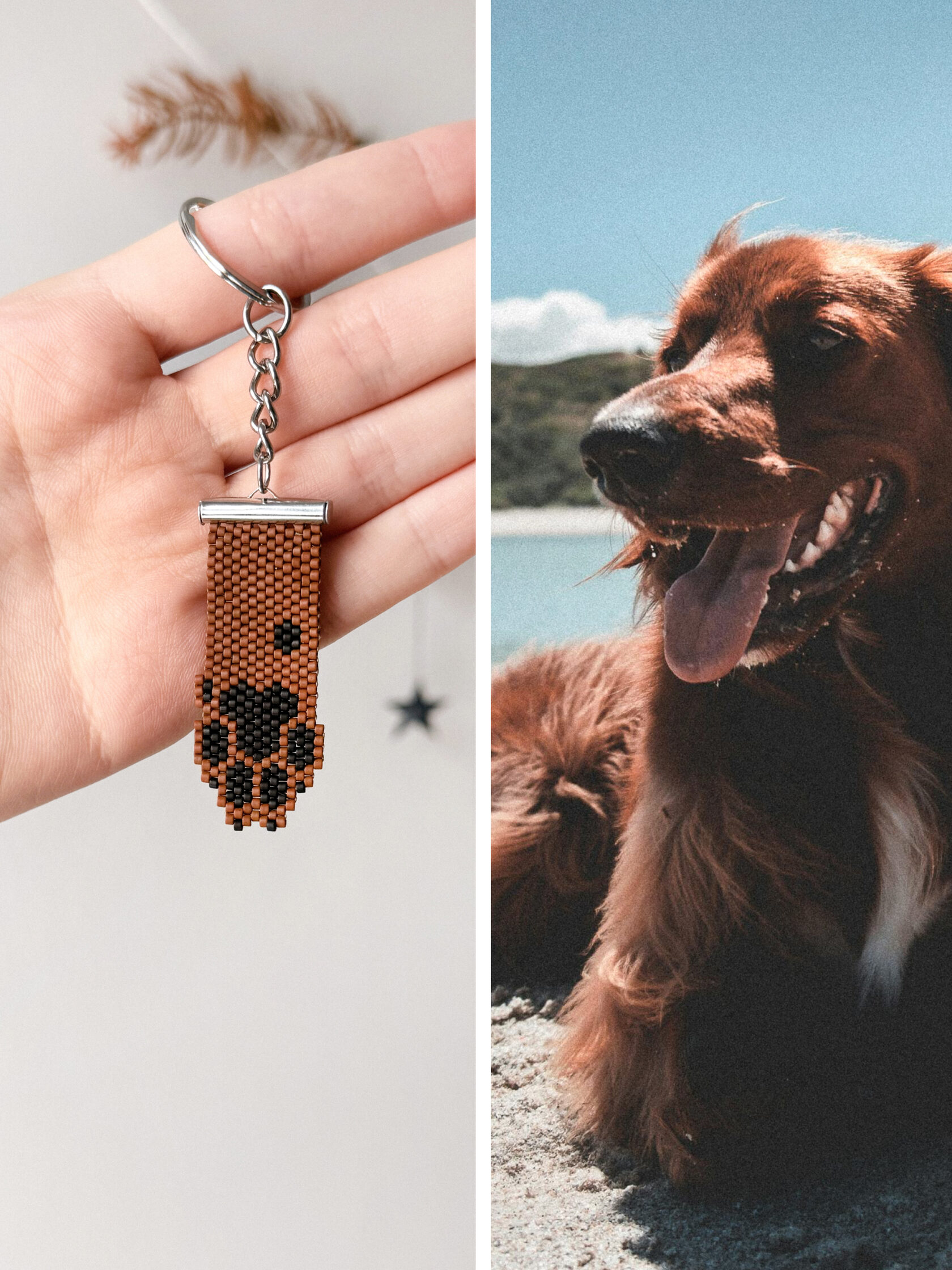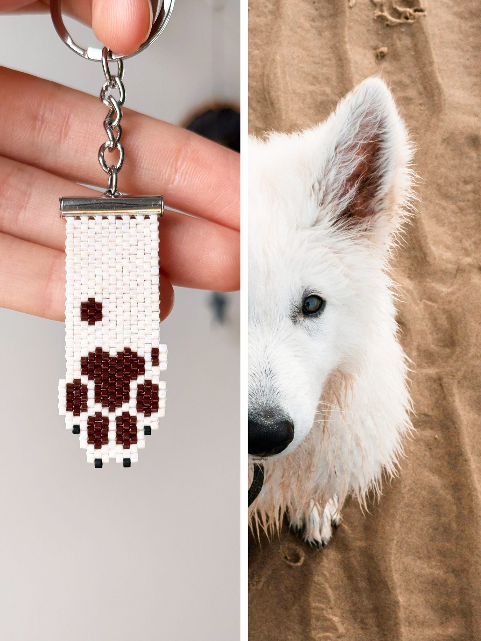 Cat or dog paw keychain in various colors handmade from glass beads and stainless steel using mosaic technique.