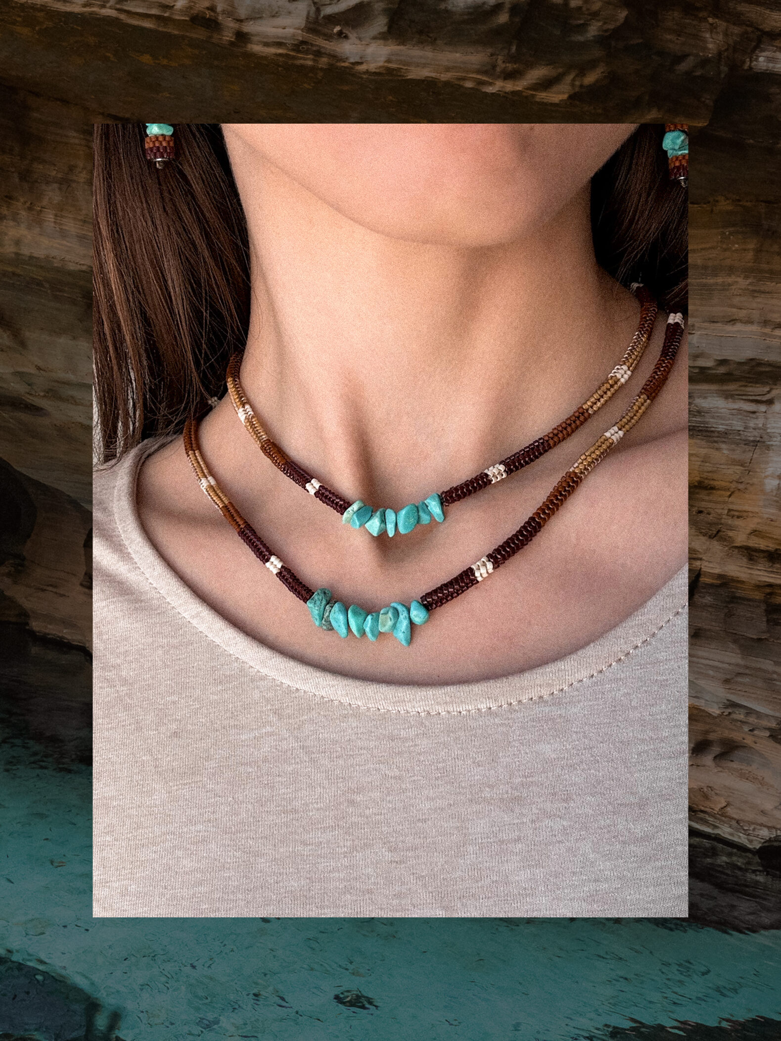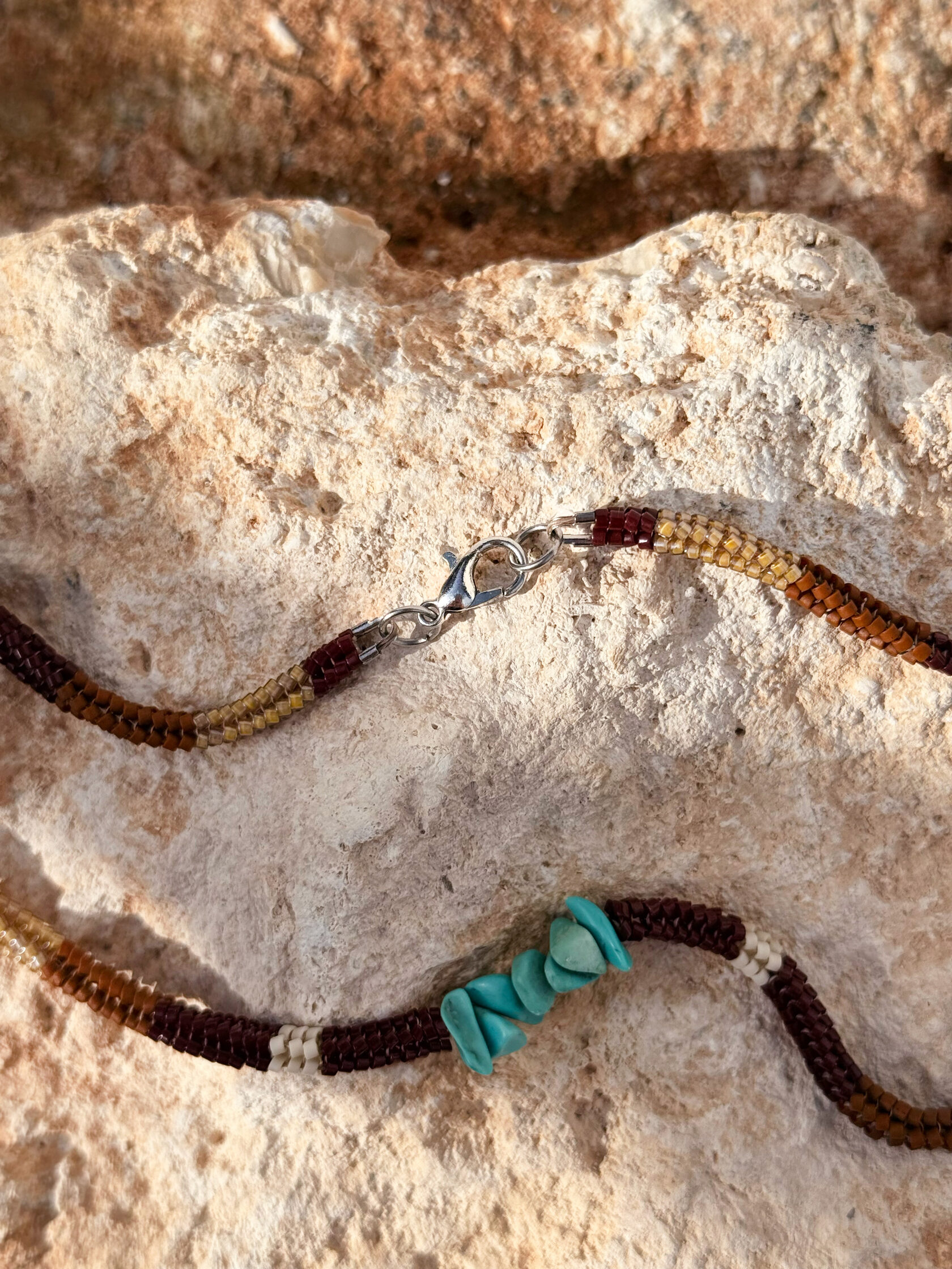 The color transitions, from deep brown to sandy beige and turquoise, captures the layered rock formations, sun-scorched earth, and rare oases. The central focus is a group of turquoise stones (their pure bluish-green color is formed by copper compounds).