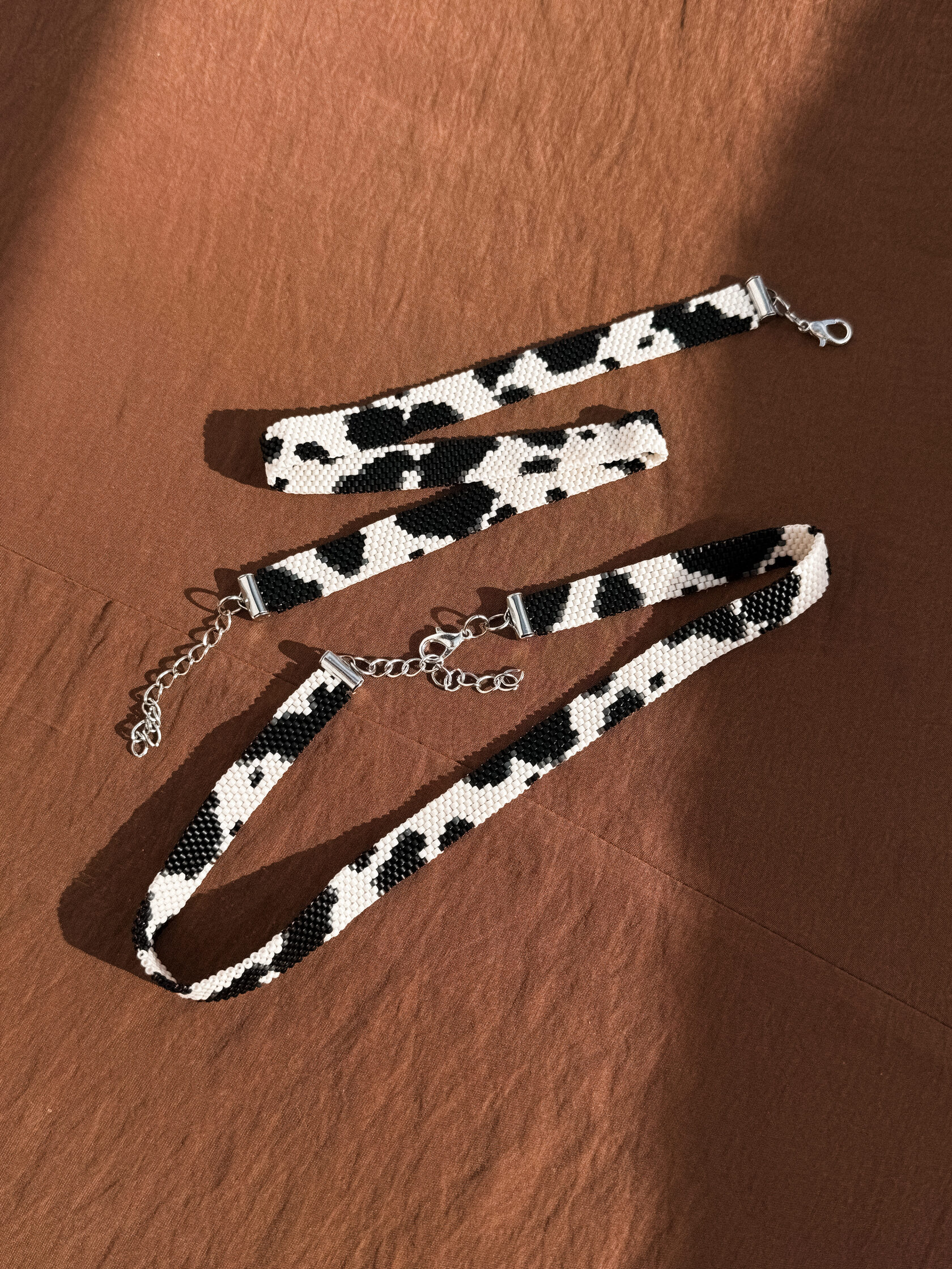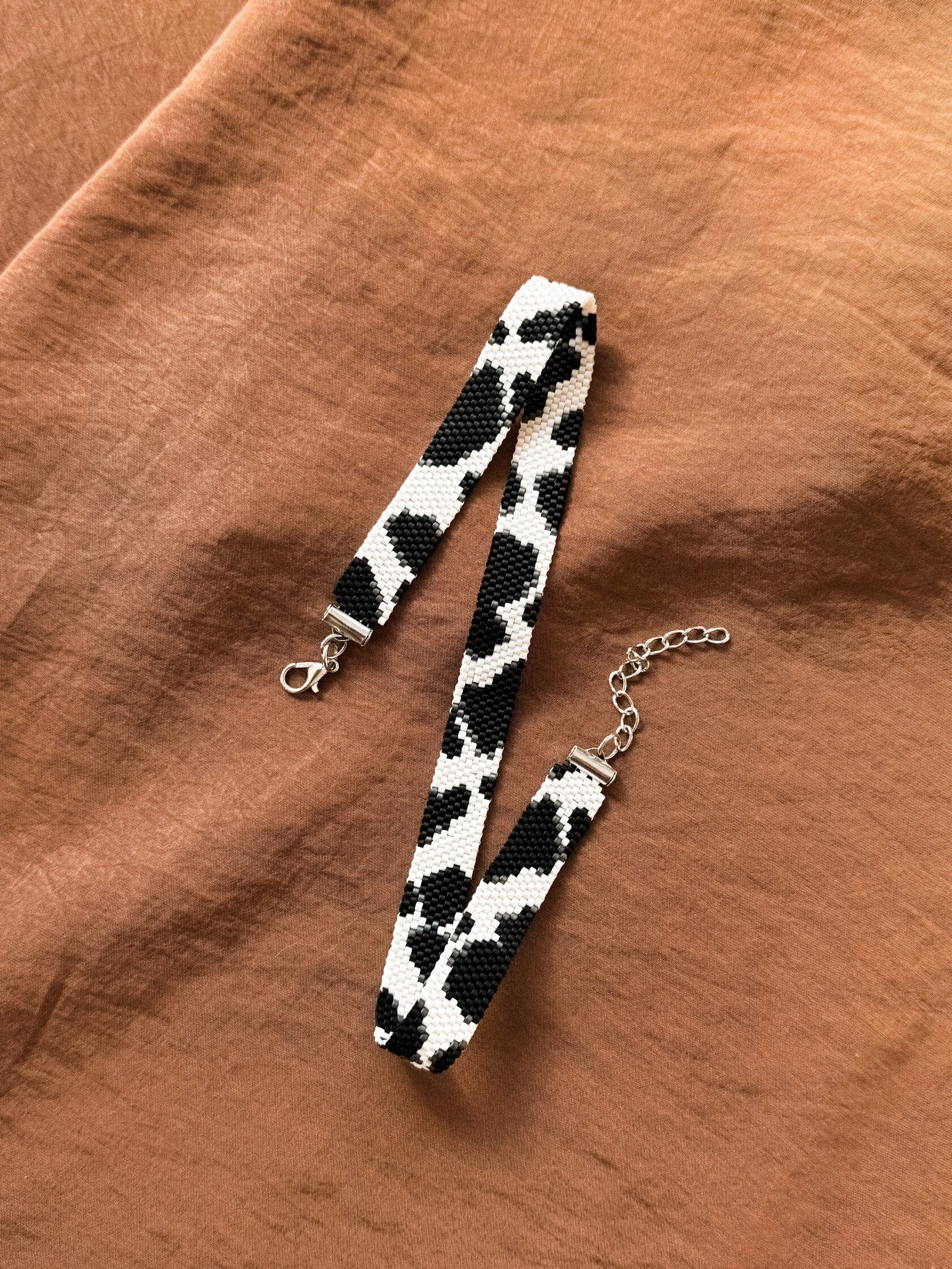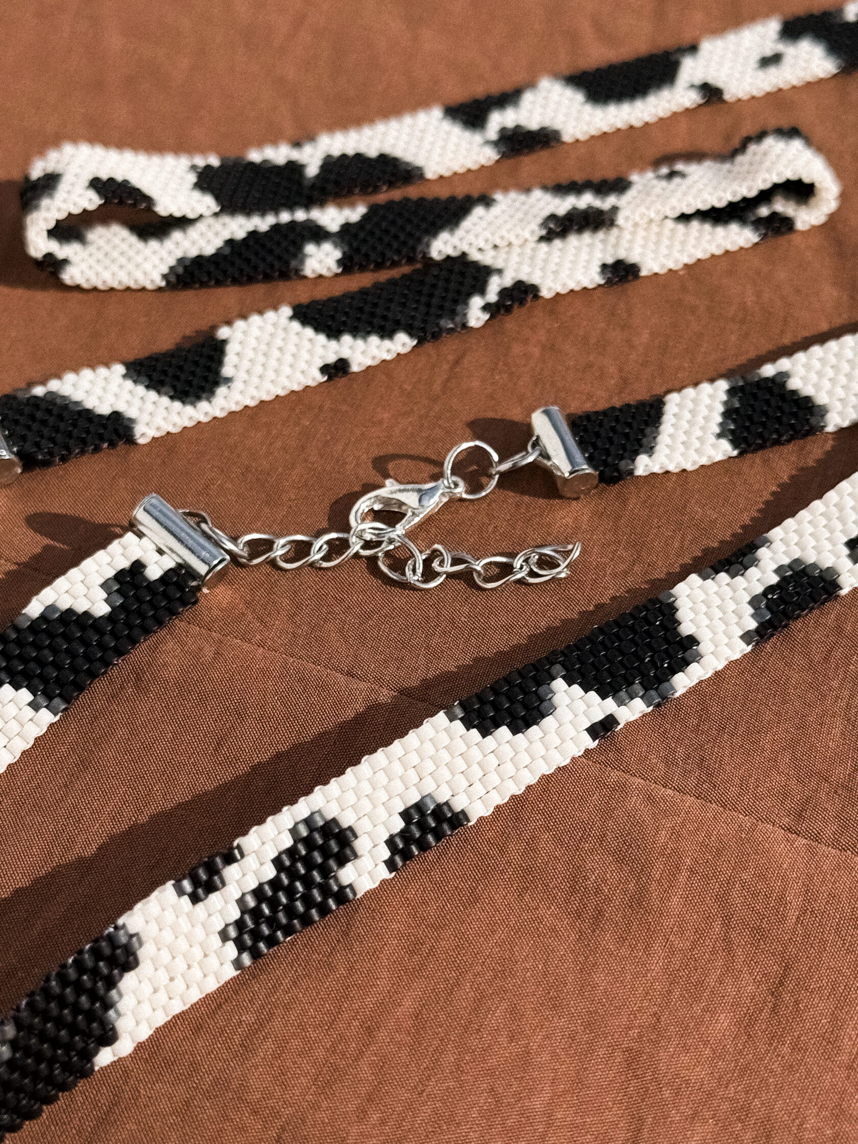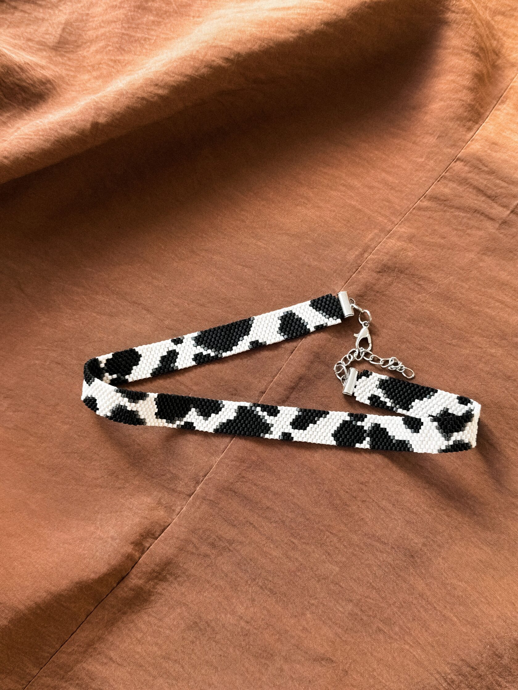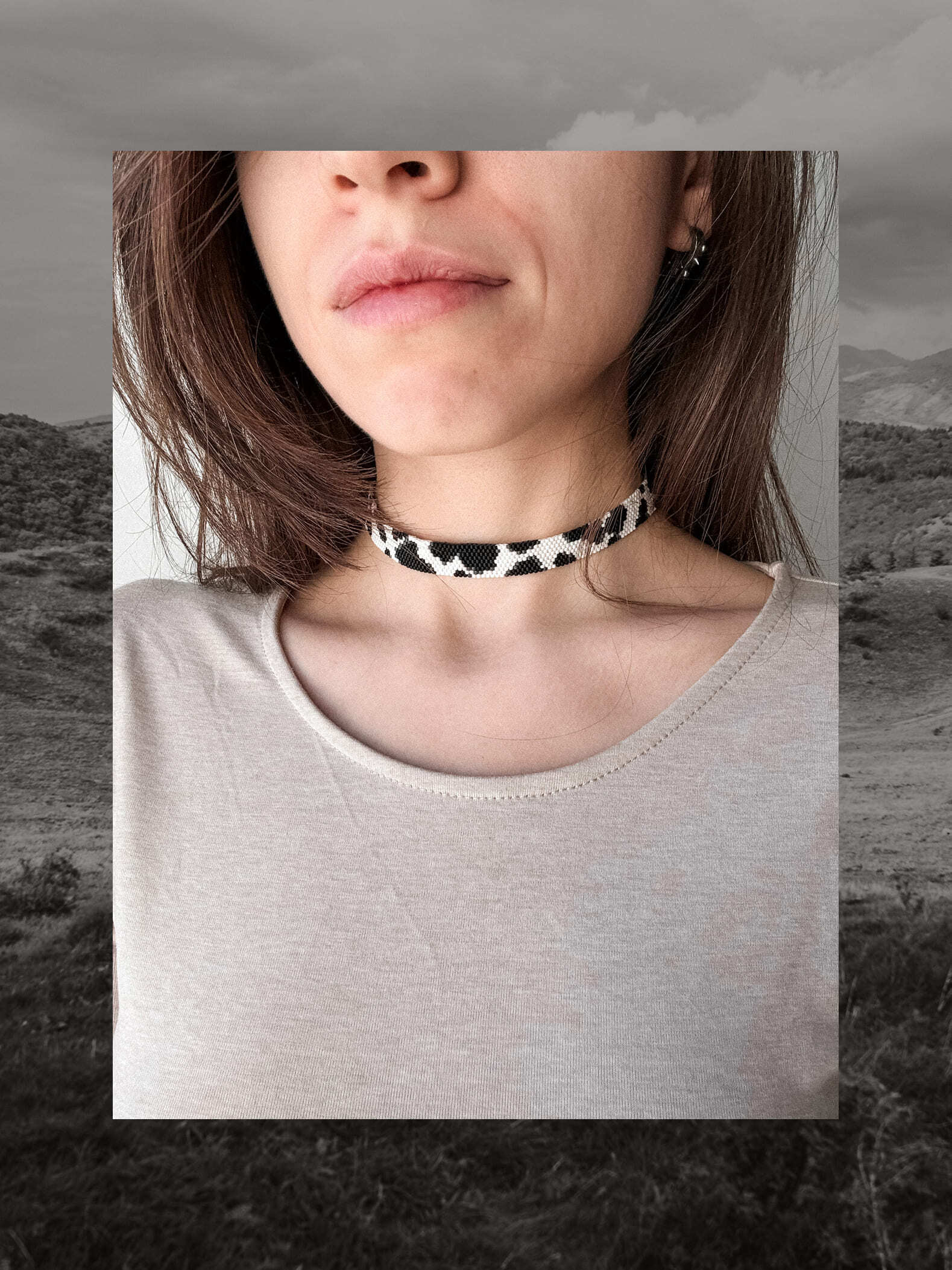 This beaded cowdy-style choker is handmade from high-quality glass beads and stainless steel using mosaic weaving technique. Can be custom-made — wider or thinner, longer or shorter, whatever suits you best.