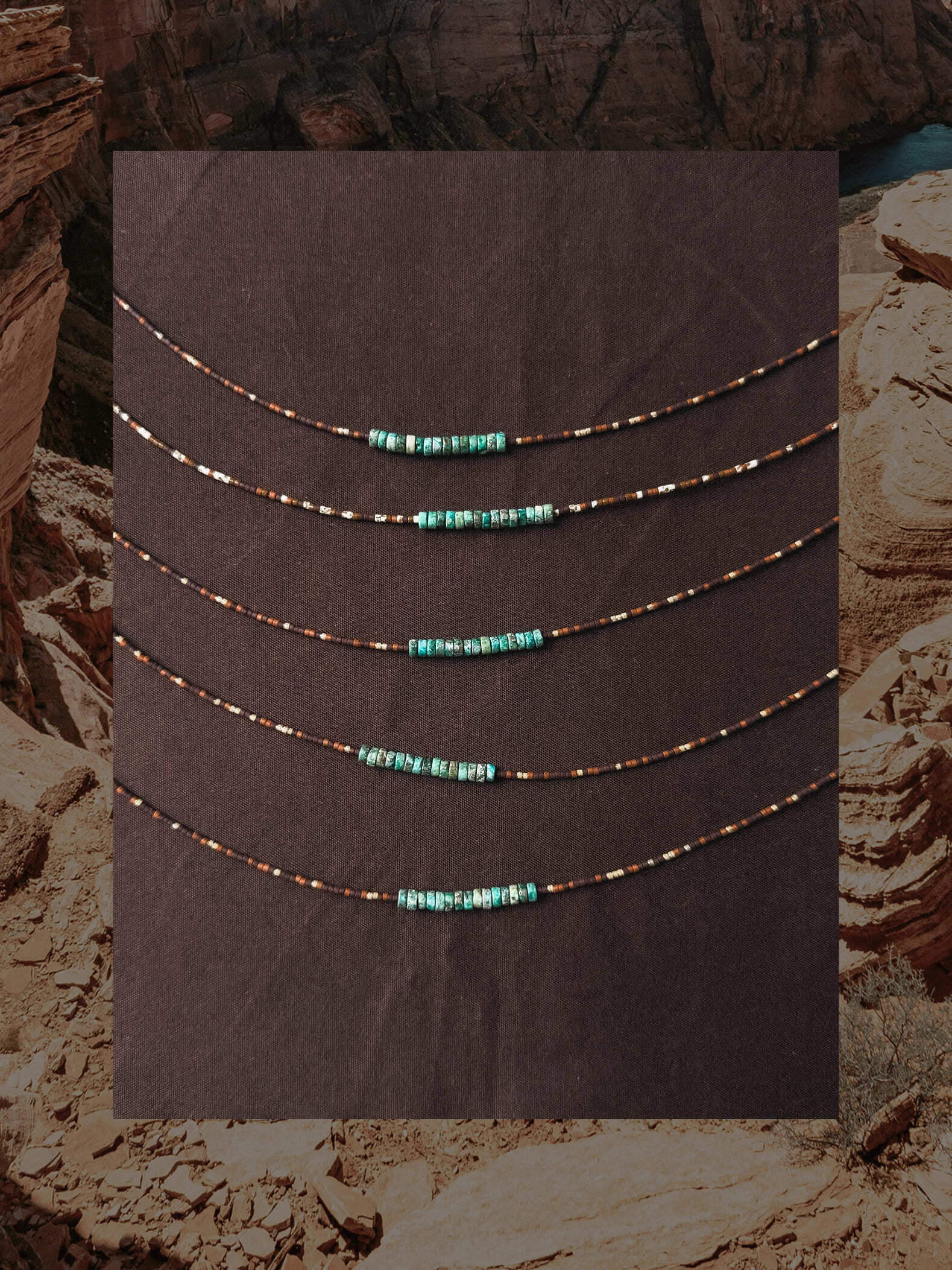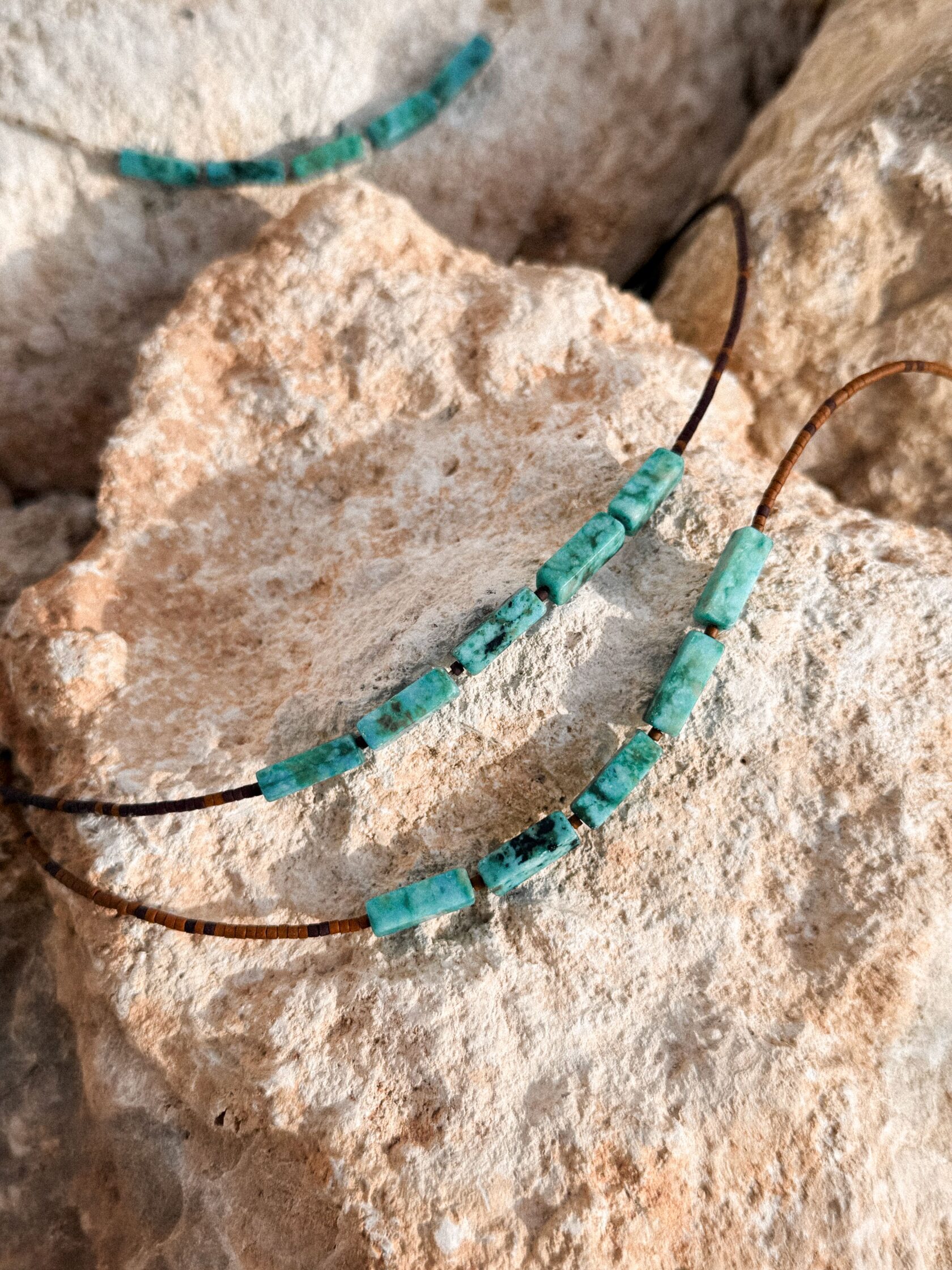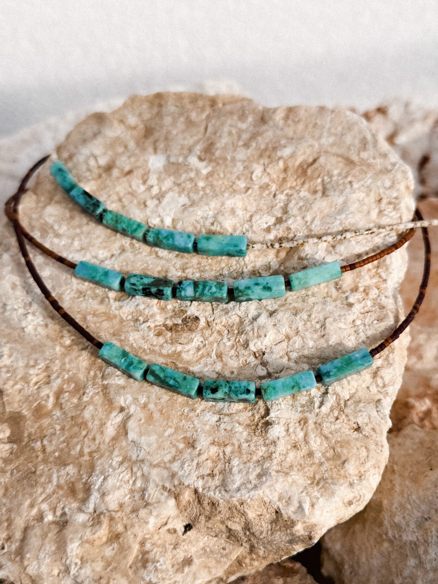 Inspired by the tranquil flow of turquoise water through a rugged landscape, the Brook necklace embodies the quiet harmony of nature. It's handmade from high-quality glass beads, stainless steel, and natural African Jasper.