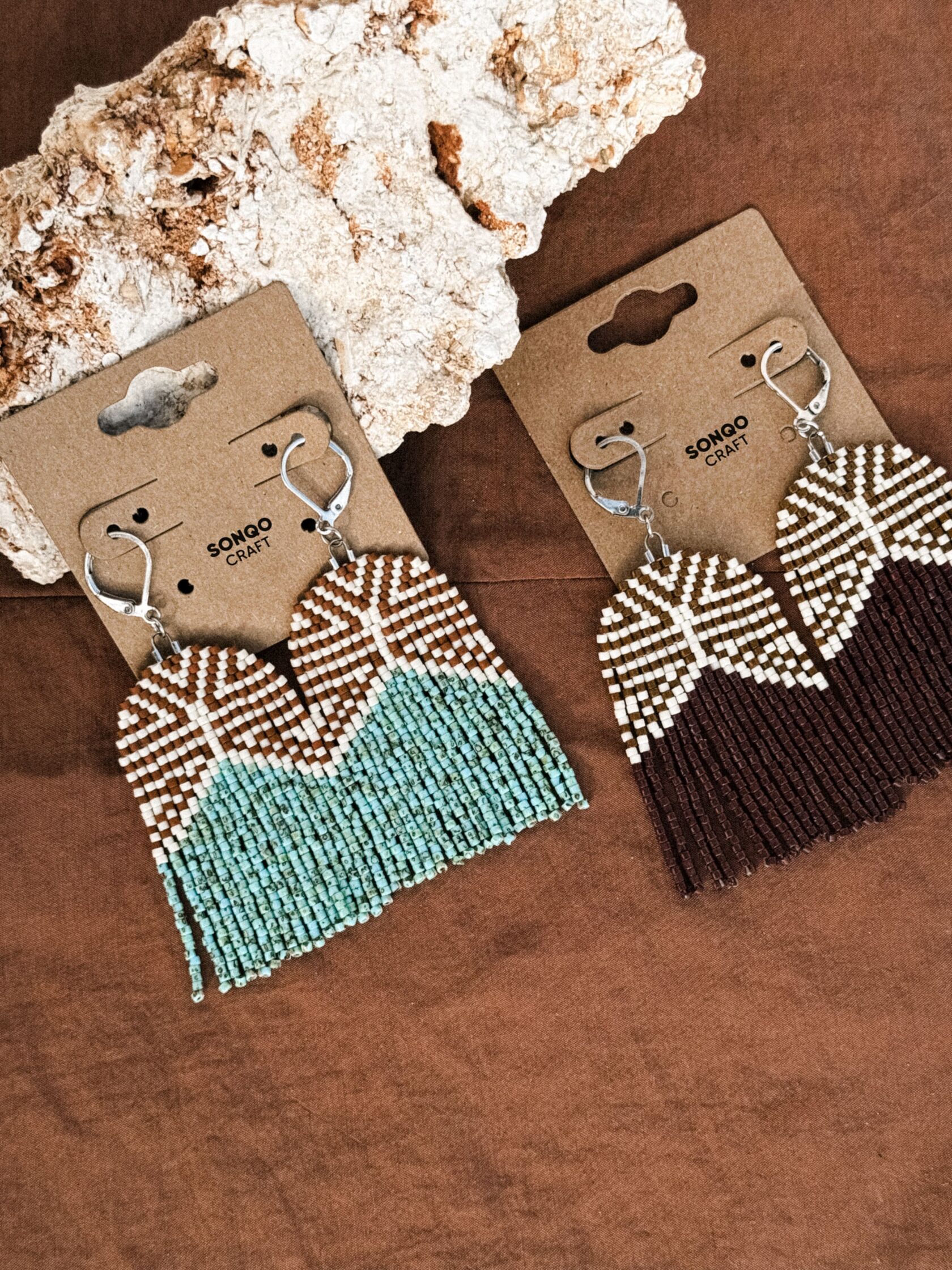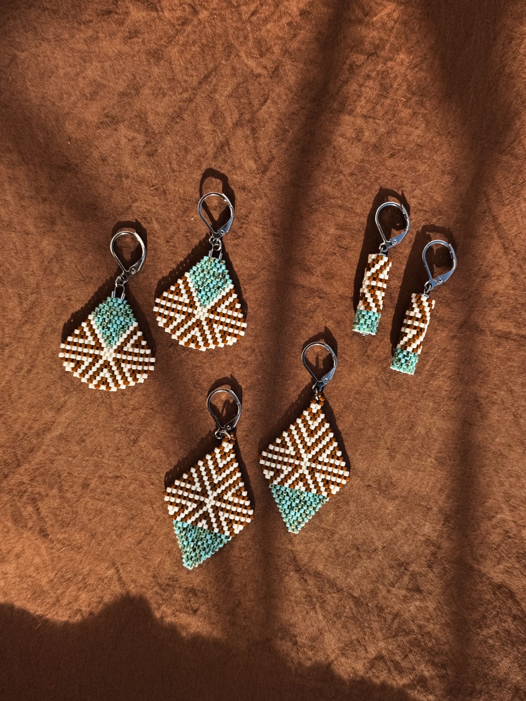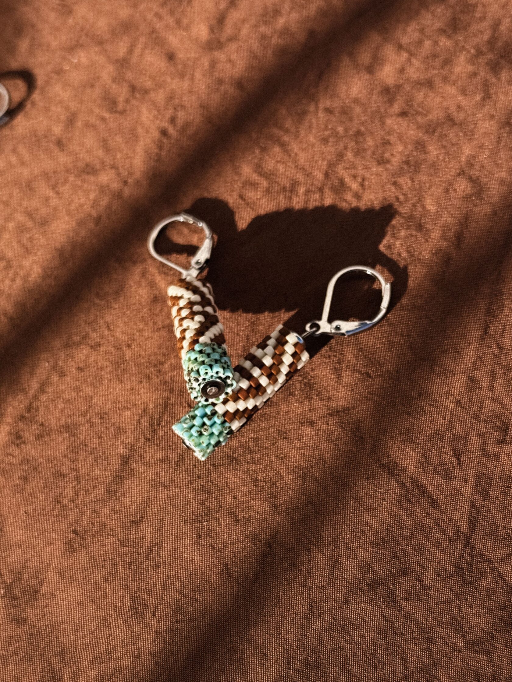 These earrings features a precision geometric pattern that reflects the concepts of path, time, and navigation. It's handmade from high-quality glass beads and stainless steel using mosaic weaving technique. Can be custom-made in various shapes, colors and sizes.
