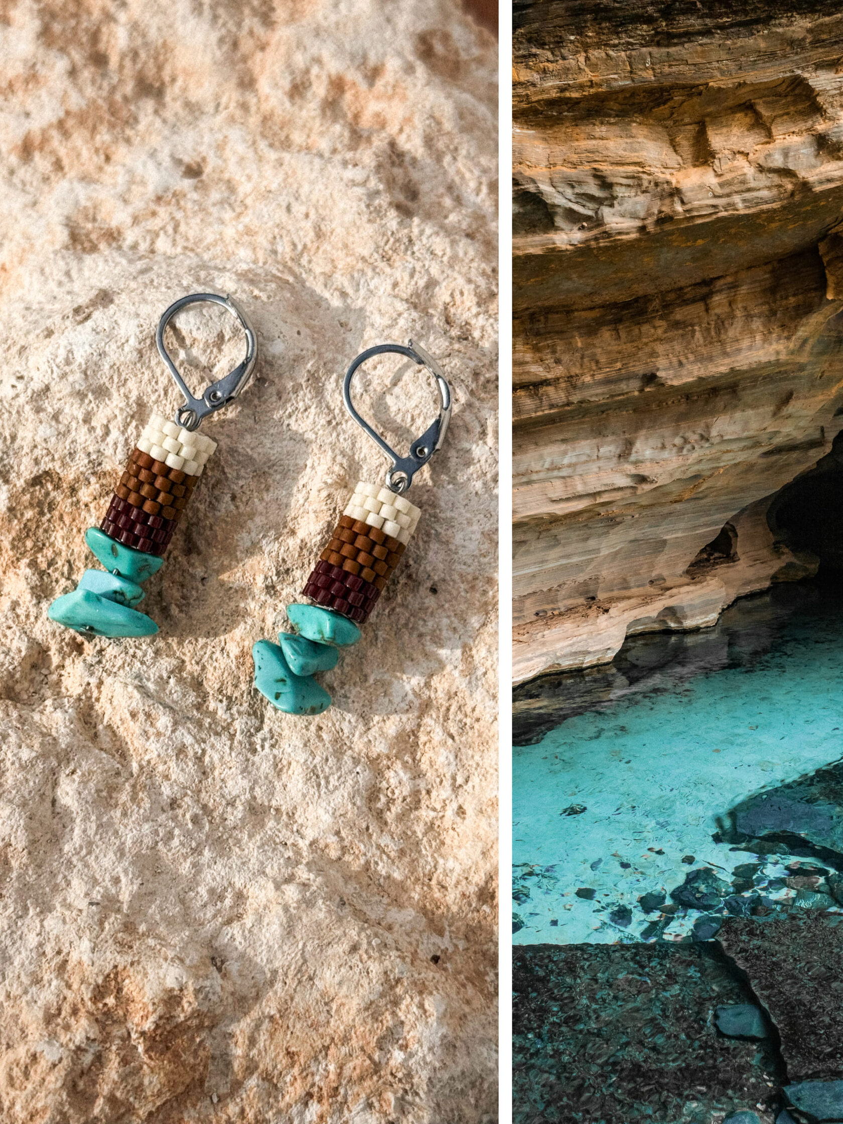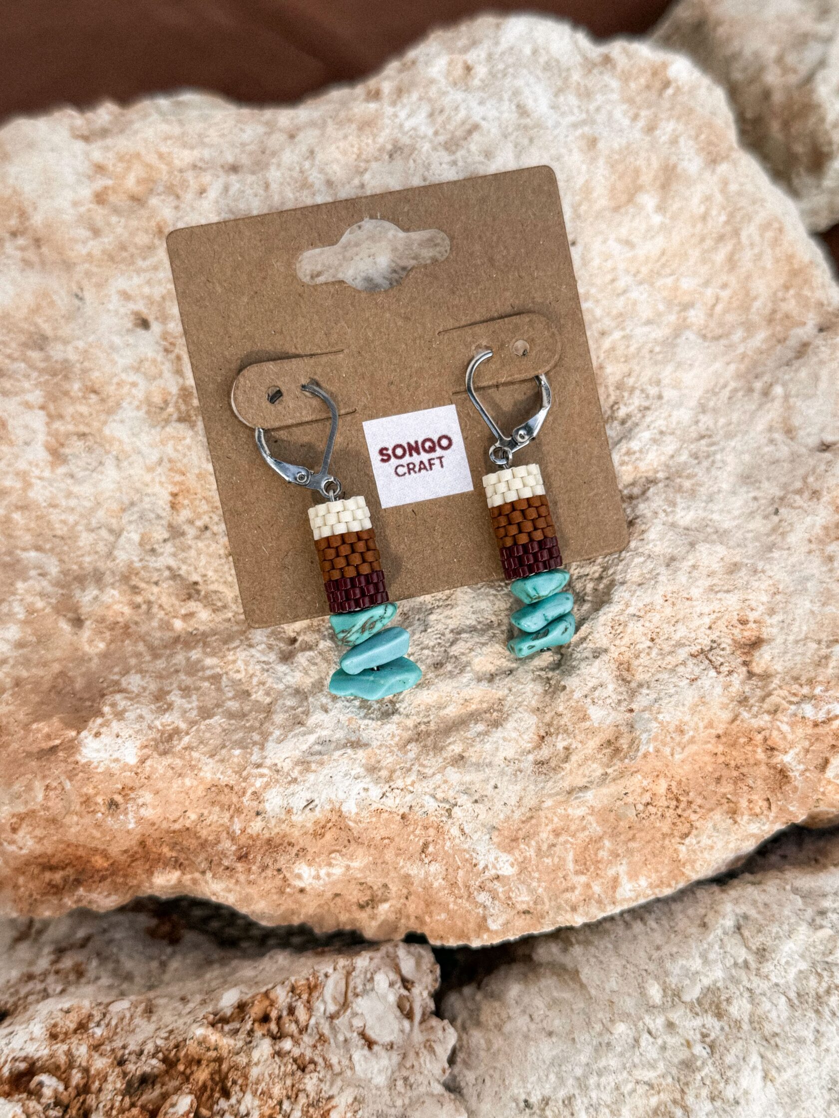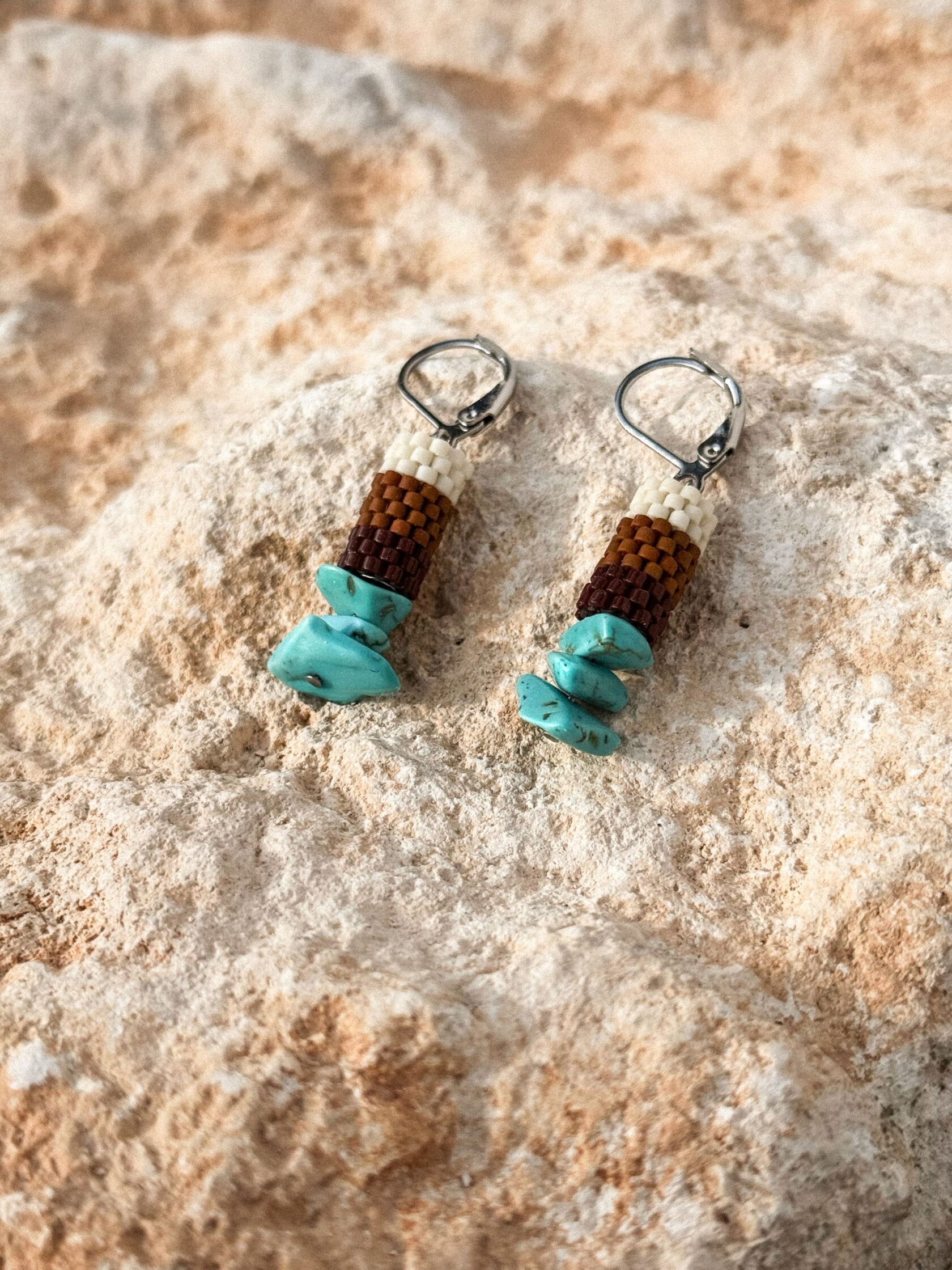This beaded cylindrical earrings is handmade from glass beads, stainless steel and natural turquoise stones. Despite the presence of metal segments inside, each earring weighs just 2.5 grams, making them extremely light and comfortable to wear all day long.