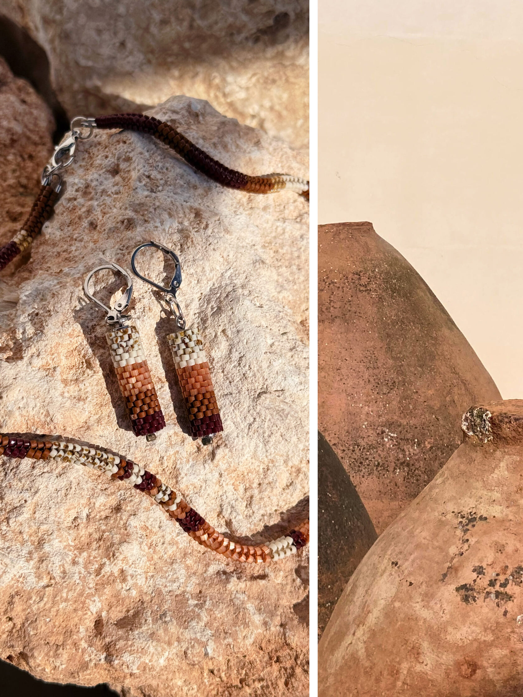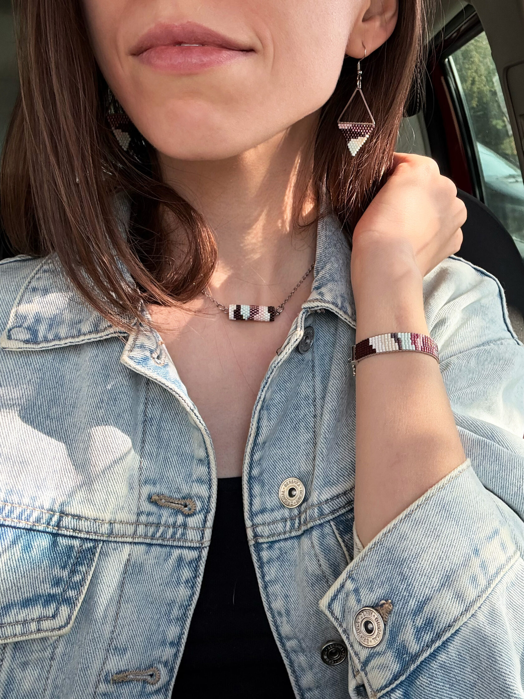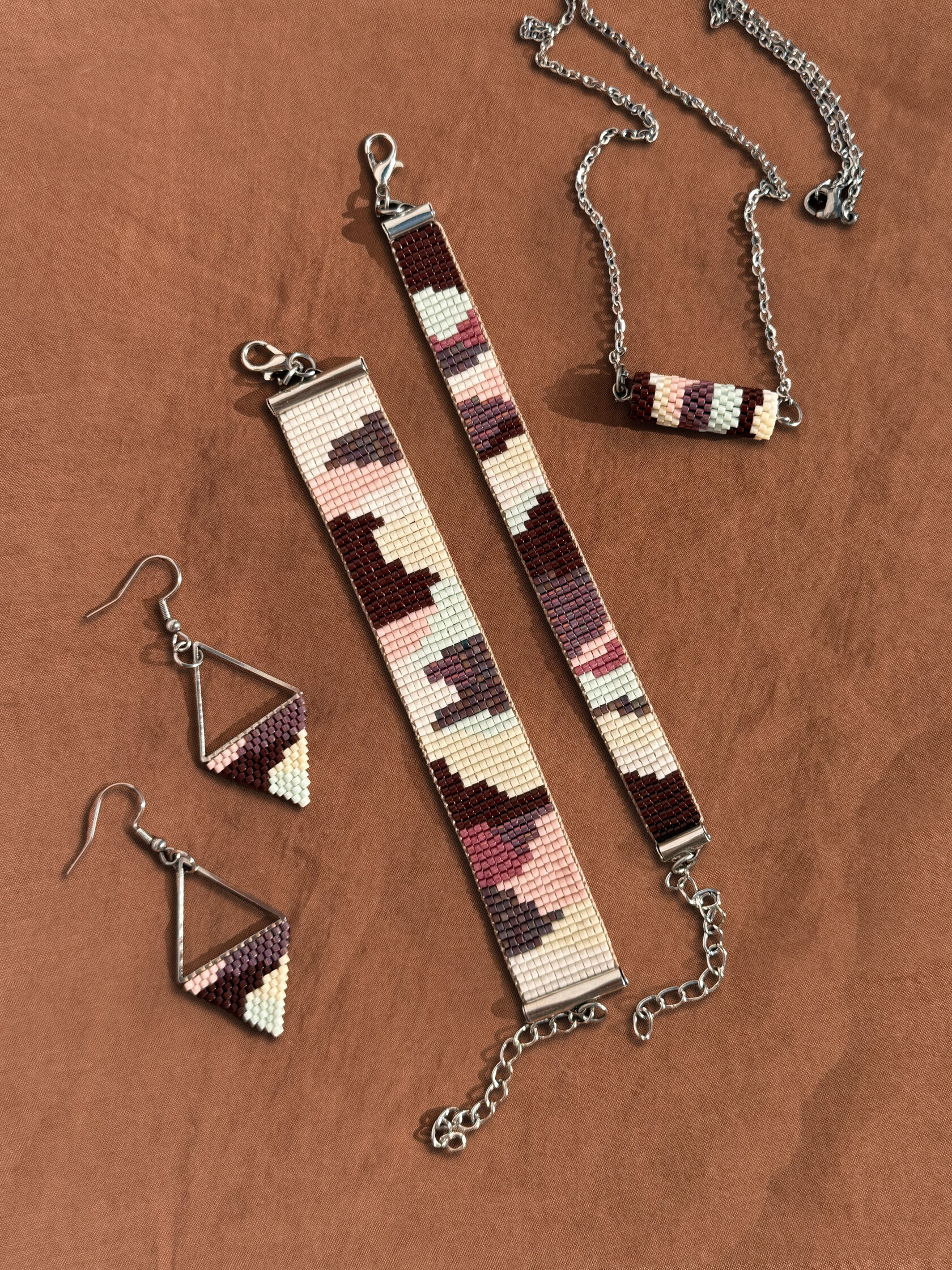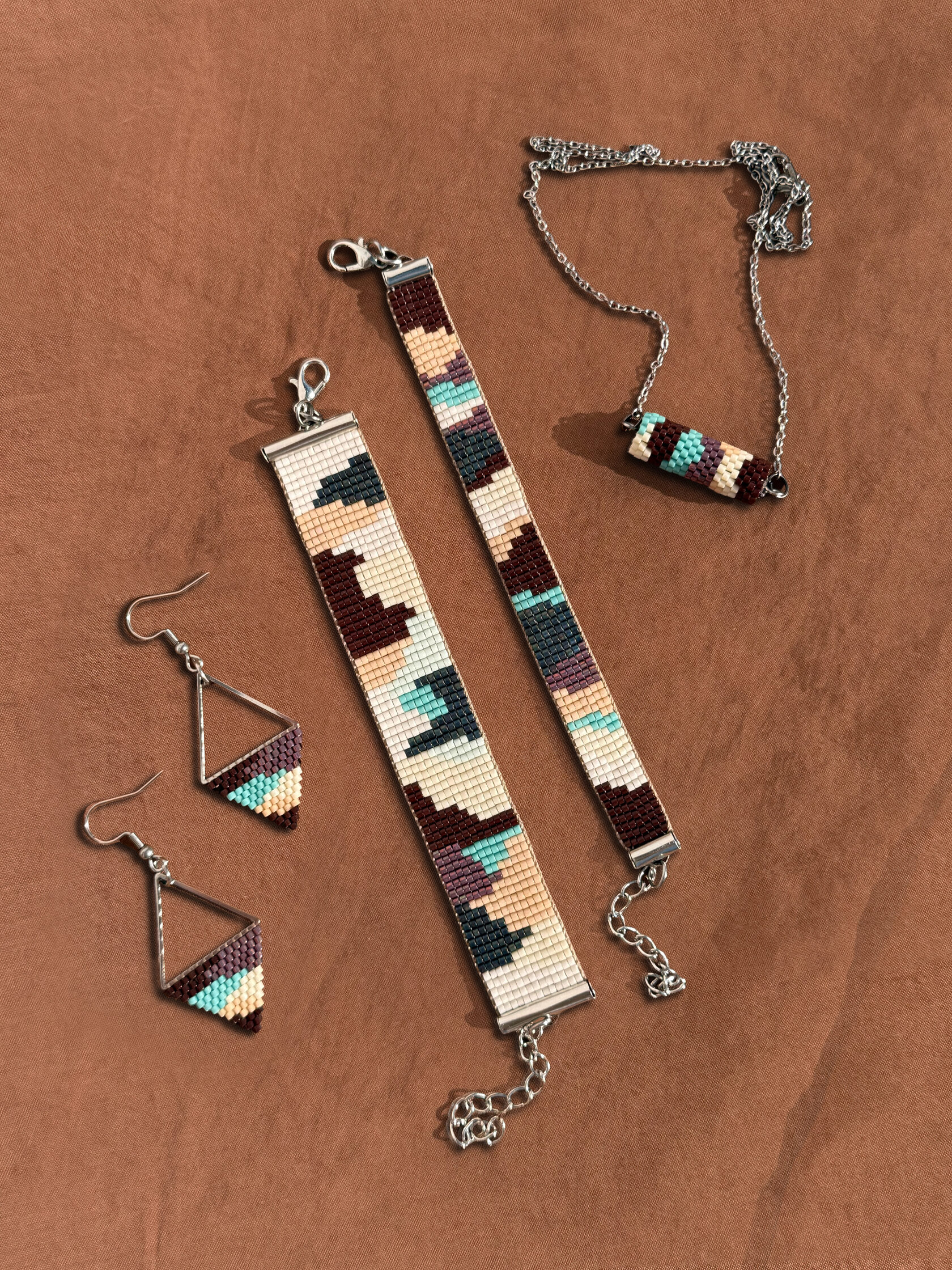 There are triangular earrings, a horizontal cylinder-shaped pendant, wide and narrow bracelets. All of these pieces are beaded in two color variants: