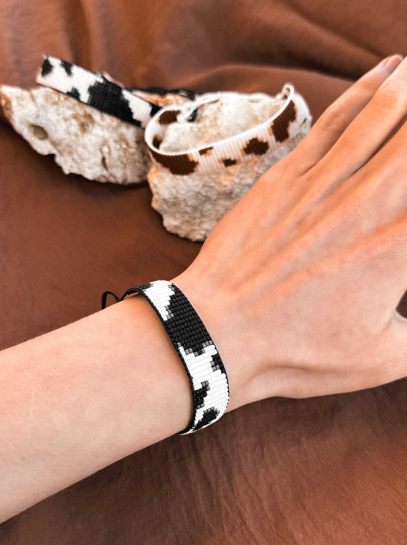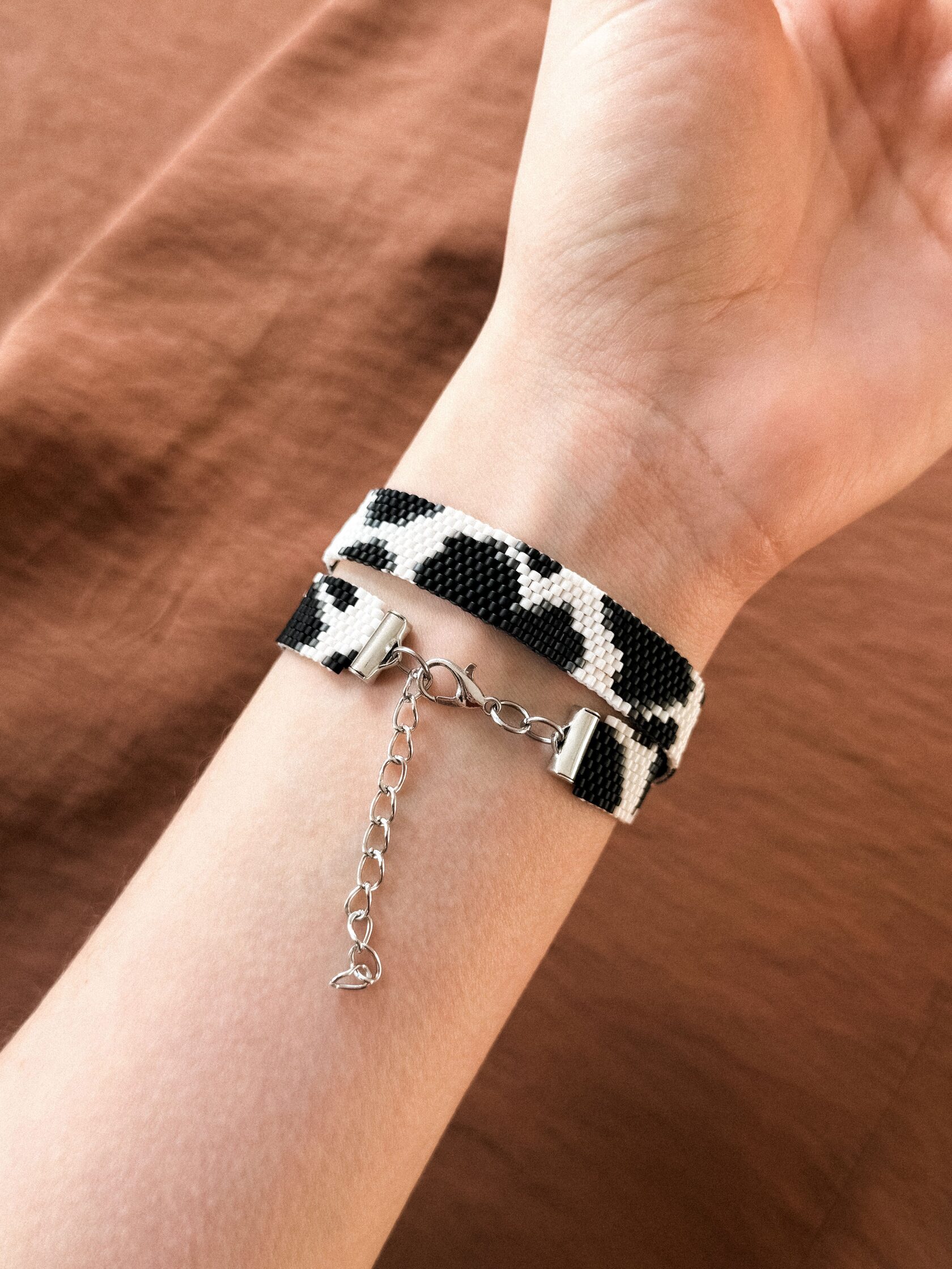 This bracelet is inspired by natural textures combined with curved rhombus shapes and is handmade from high-quality glass beads and stainless steel using a loom technique. Perfectly complements a boho style, fits well with jeans, natural fabrics, loose-fitting or layered clothing.