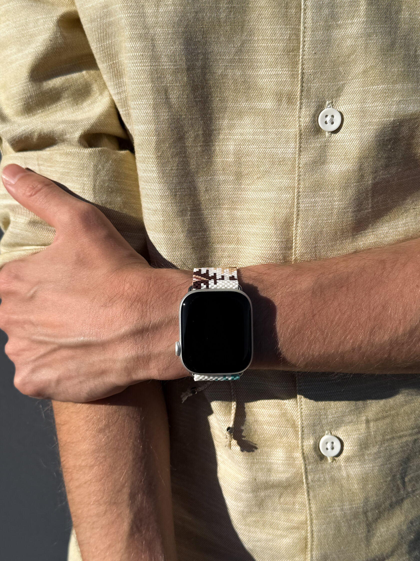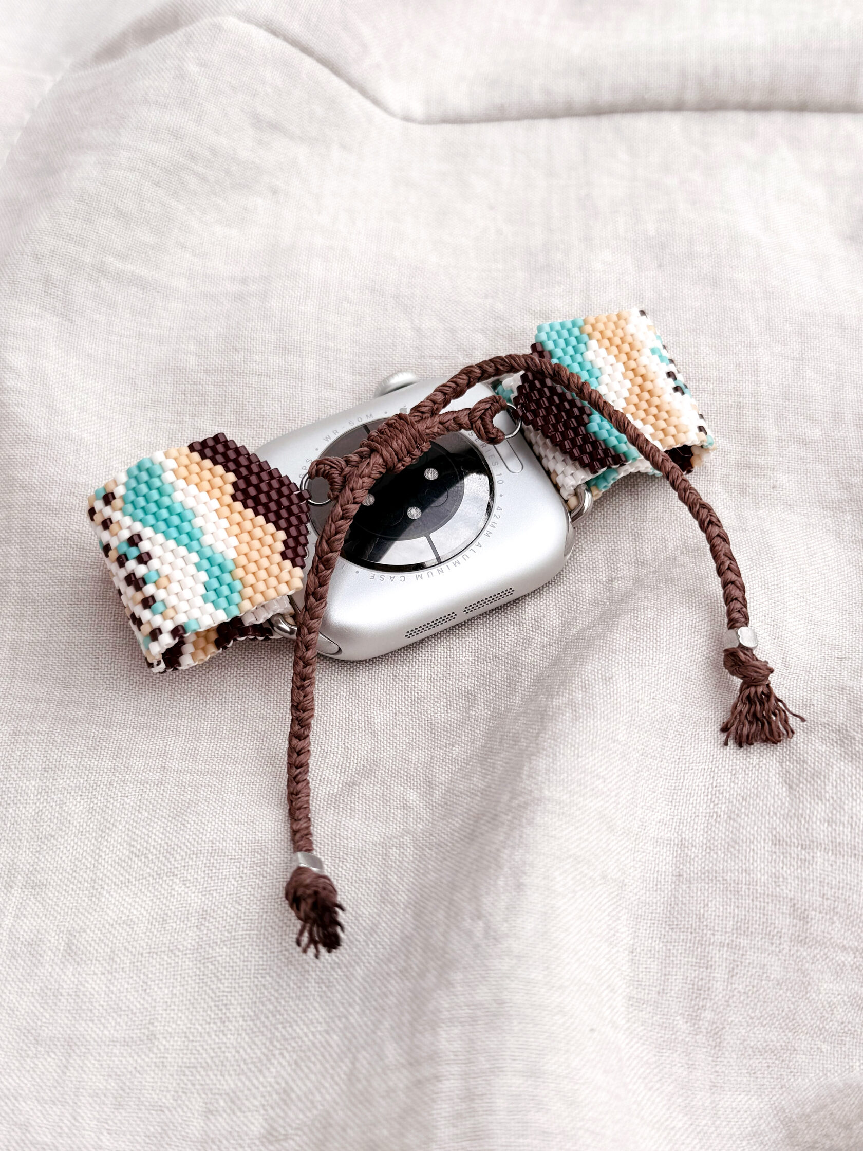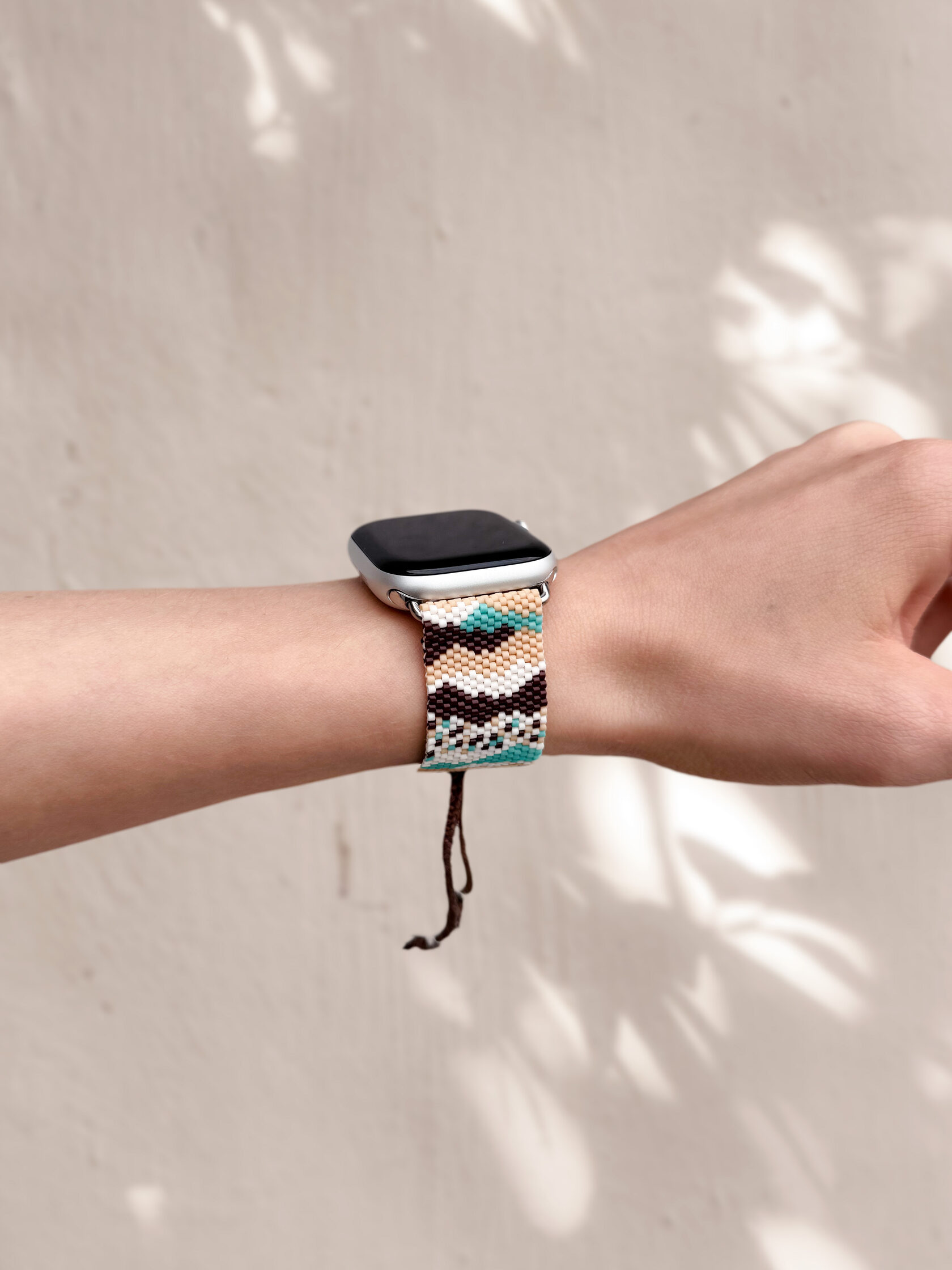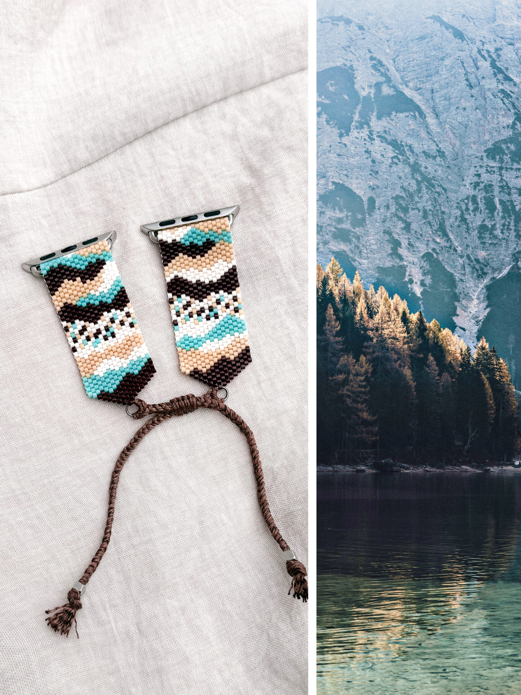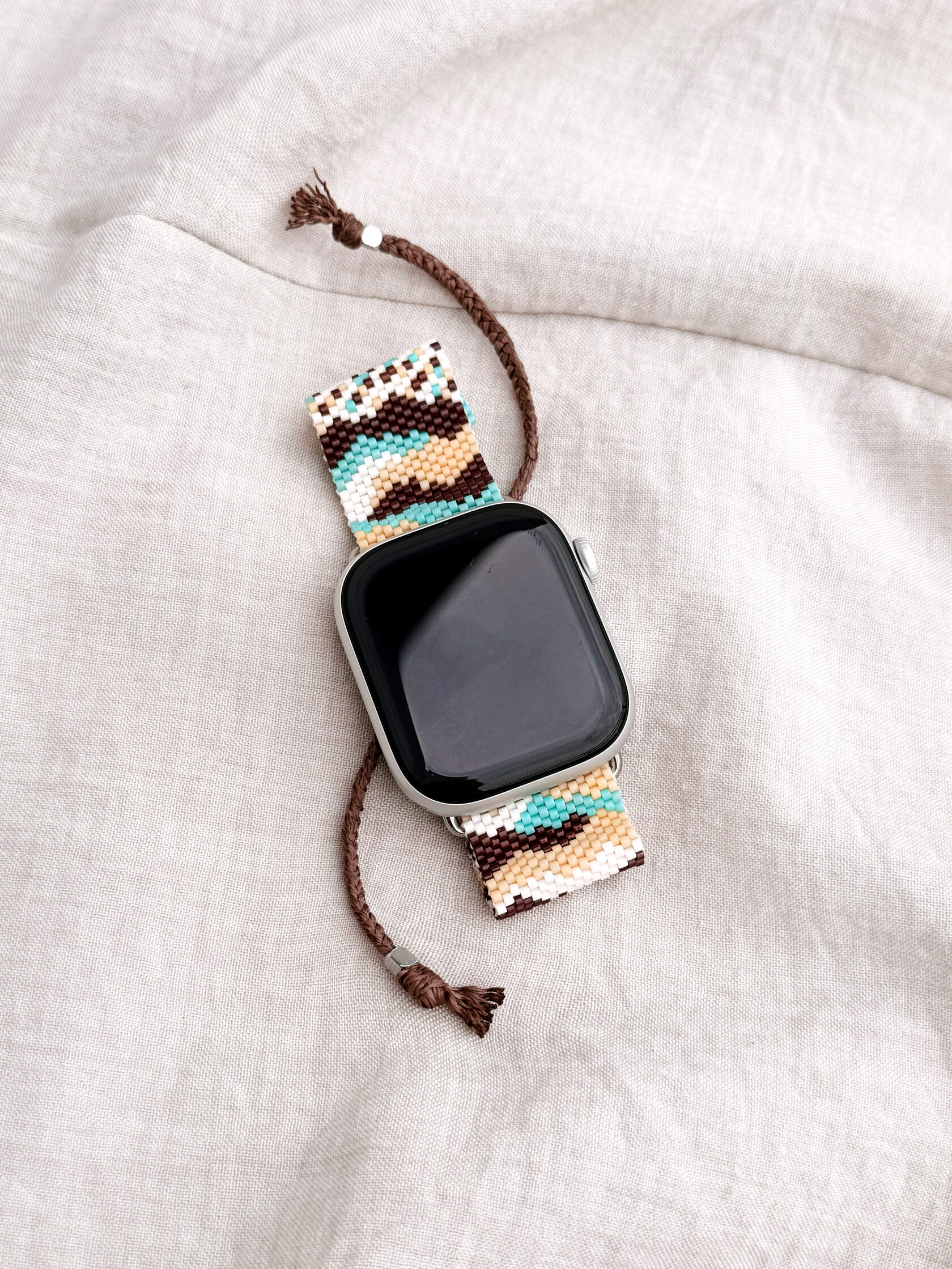 Apple Watch band with drawstrings inspired by mountain nature. It's handmade from glass beads using mosaic weaving technique. Fits well with jeans, light-colored shirts, loose-fitting or layered clothing. Suitable for both women and men.