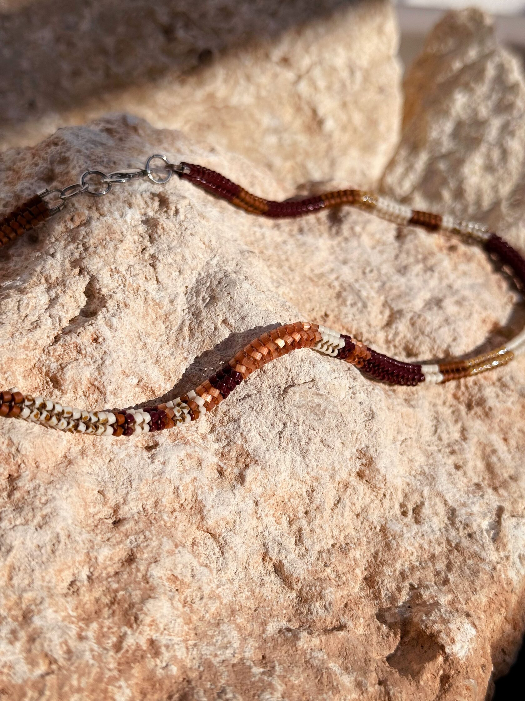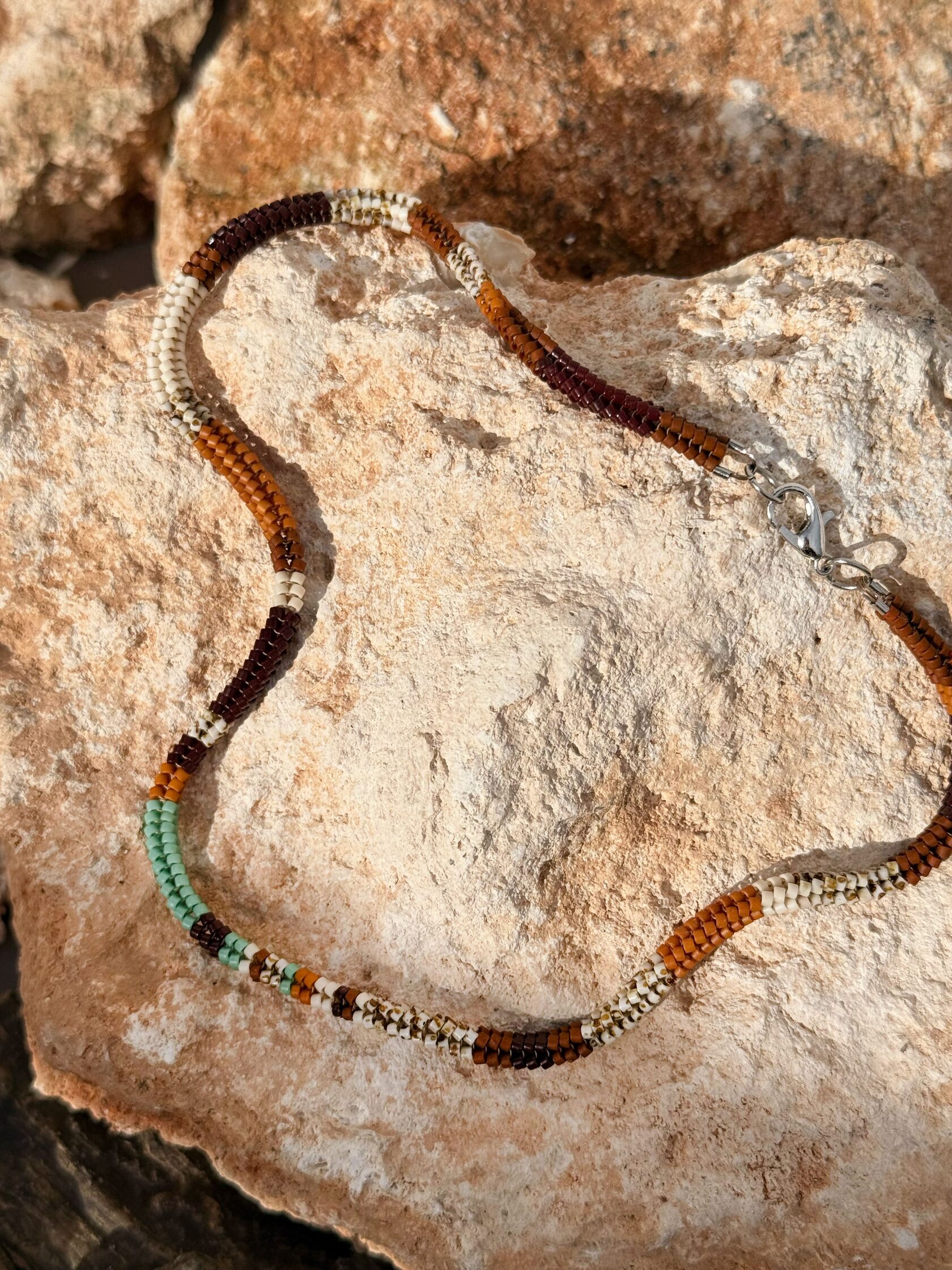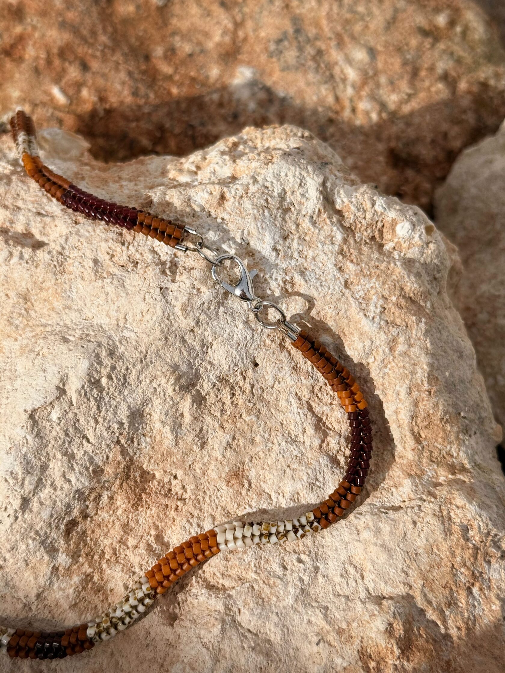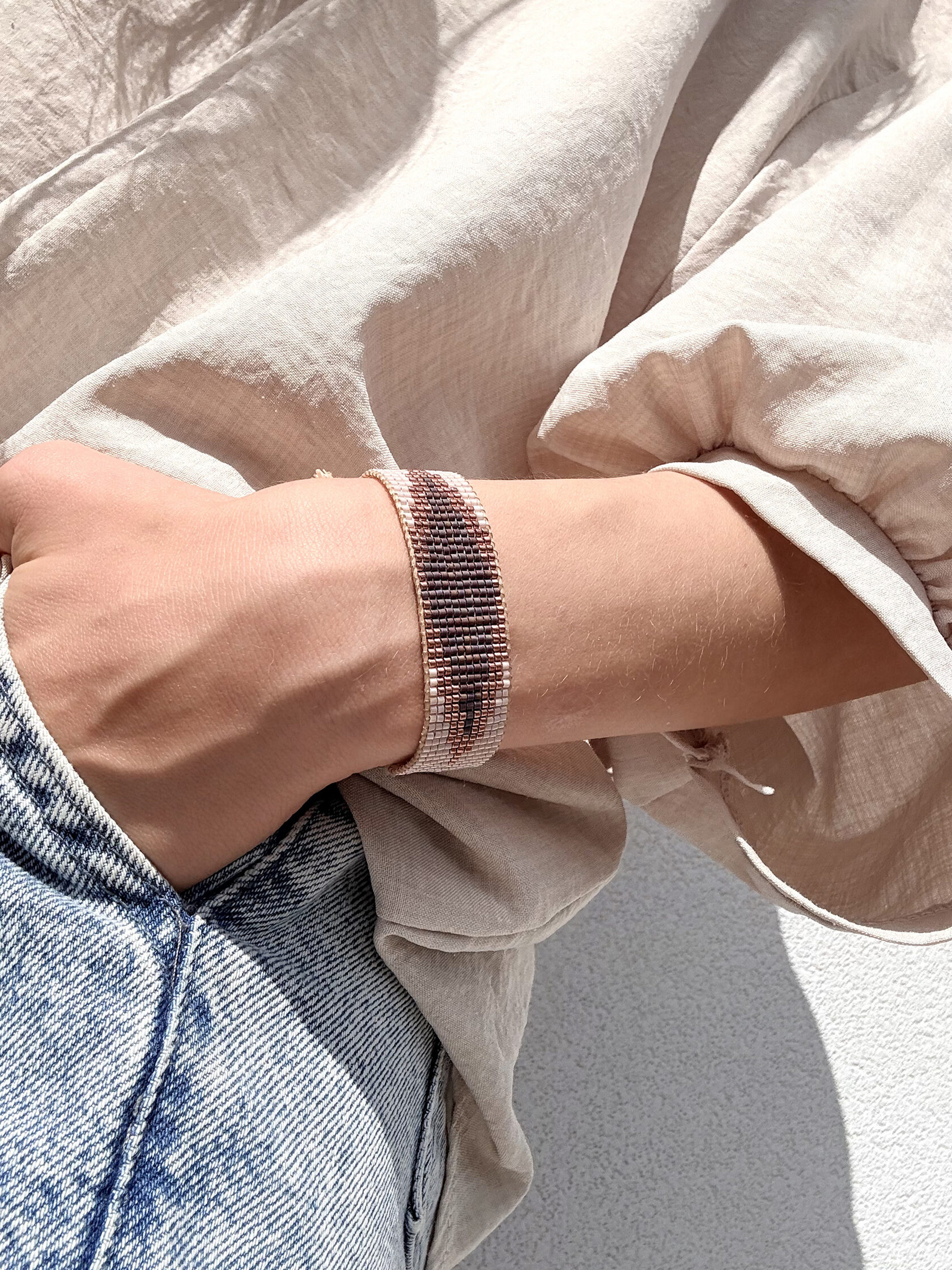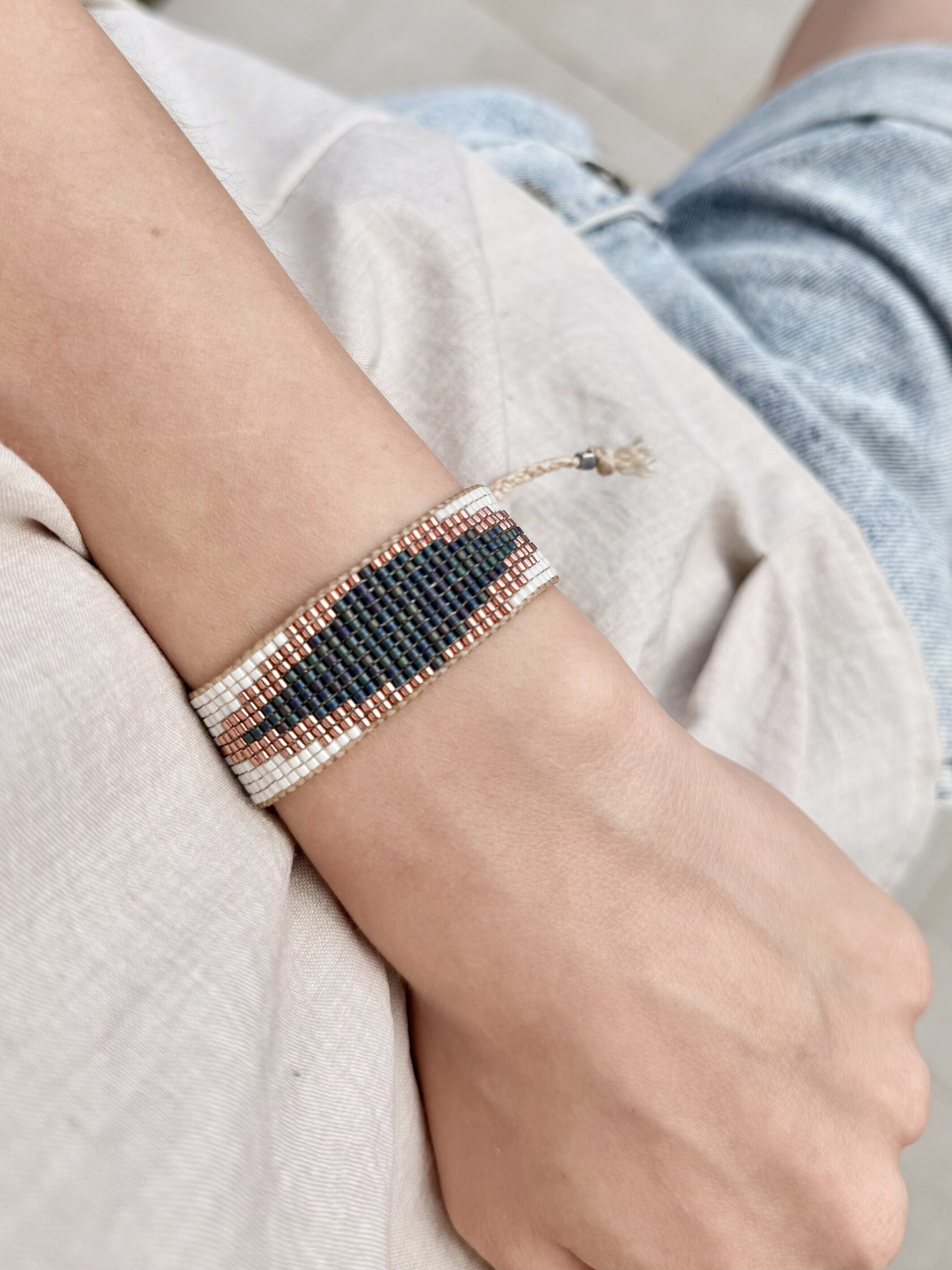 This bracelet is inspired by natural textures combined with curved rhombus shapes and is handmade from glass beads and stainless steel using a loom technique. Perfectly complements a boho style, fits well with jeans, natural fabrics, loose-fitting or layered clothing.