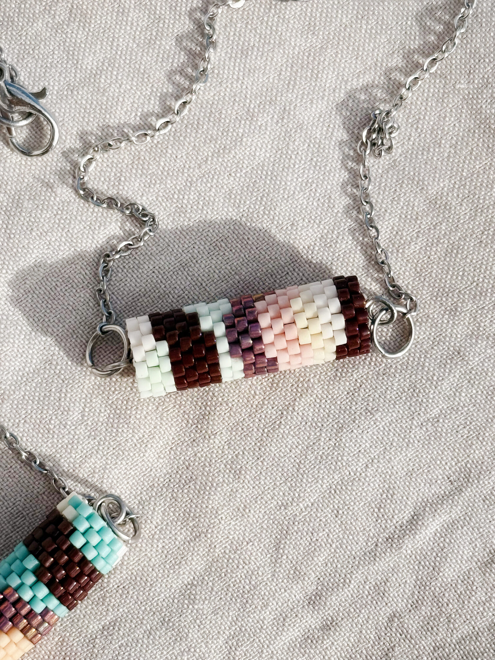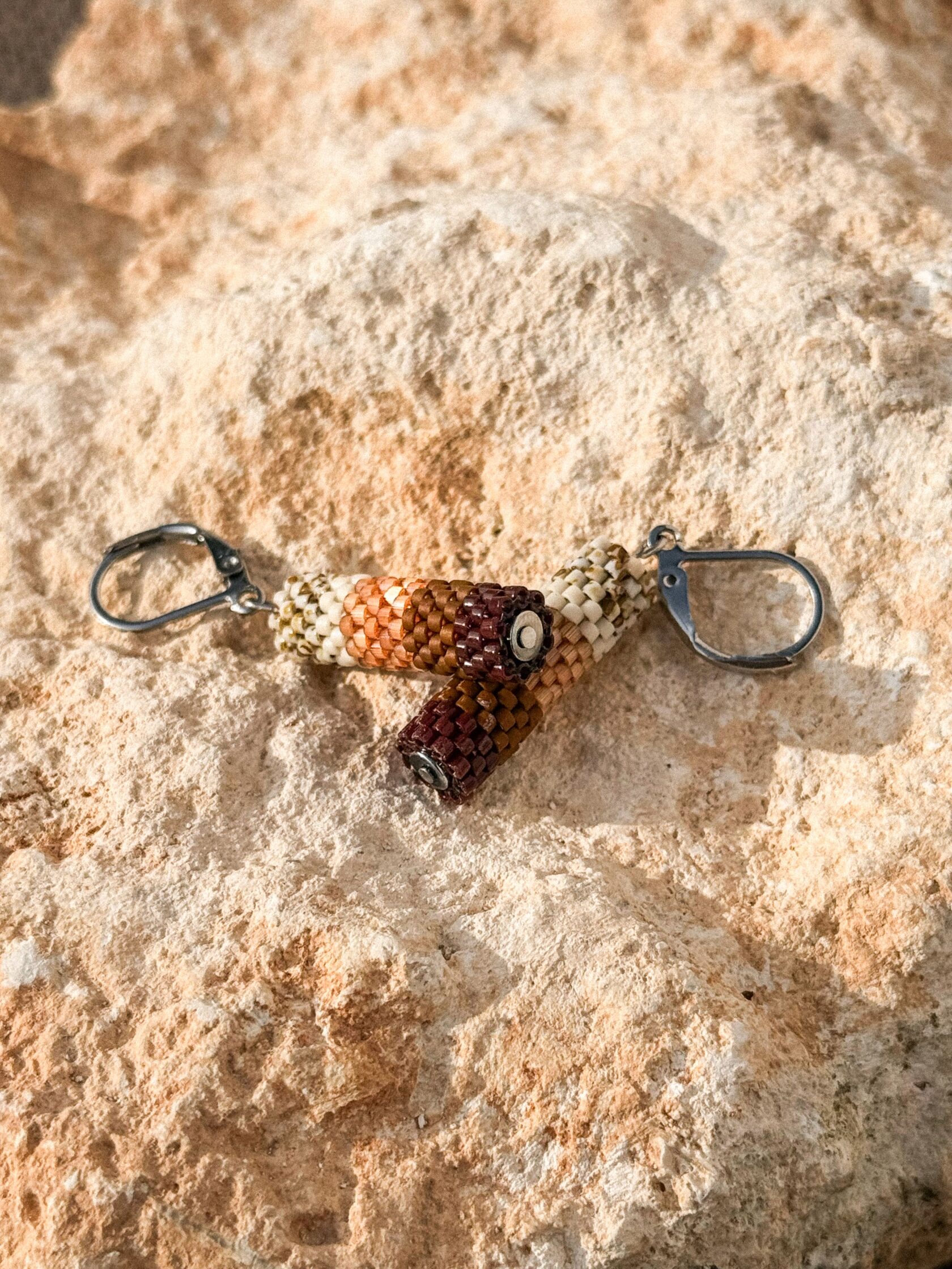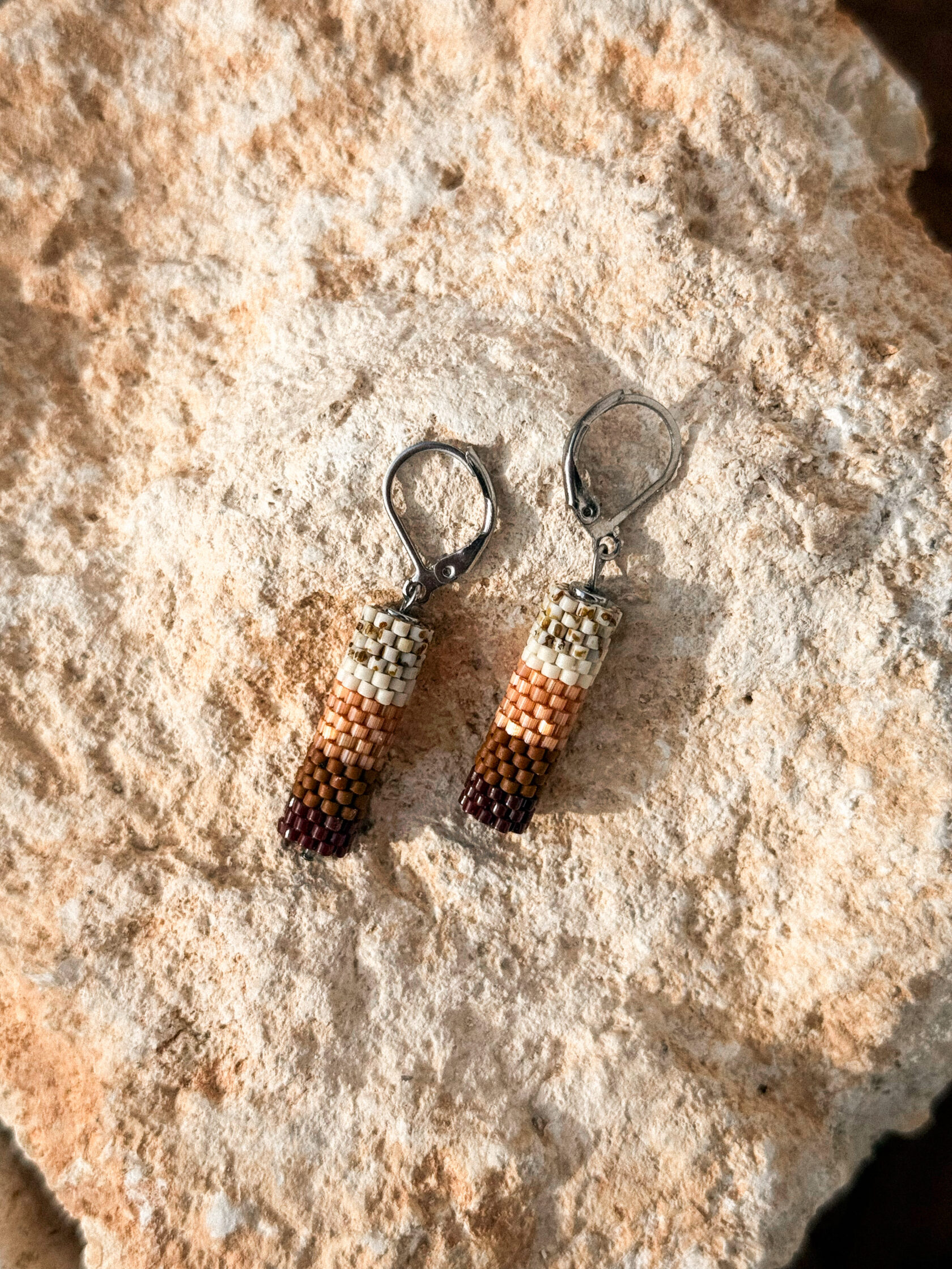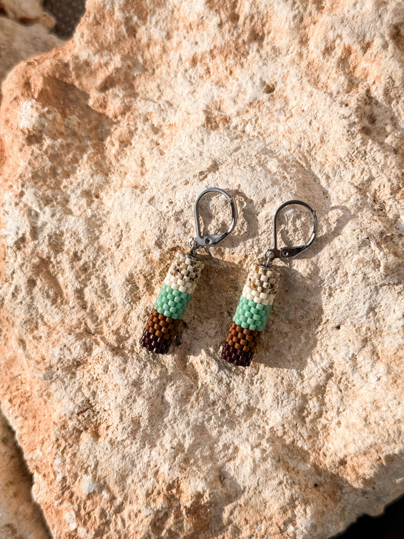 This beaded cylindrical earrings is handmade from glass beads and stainless steel. Despite the presence of metal segments inside, each earring weighs just 2.5 grams, making them extremely light and comfortable to wear all day long. Thanks to their compact and solid form they won't get tangled in your hair or snag on clothing.