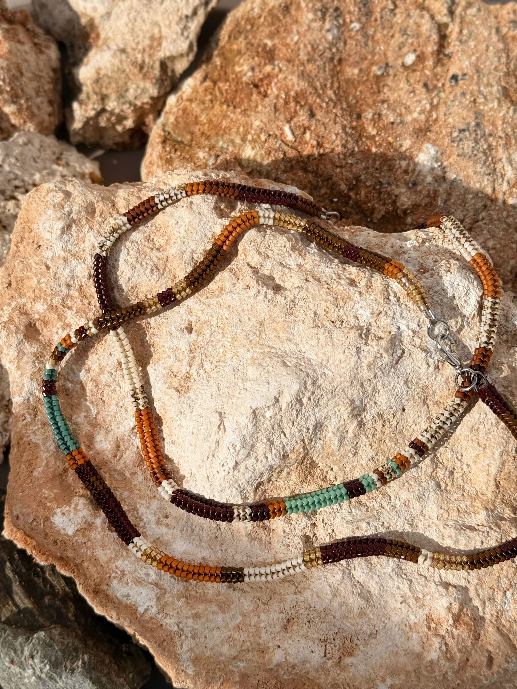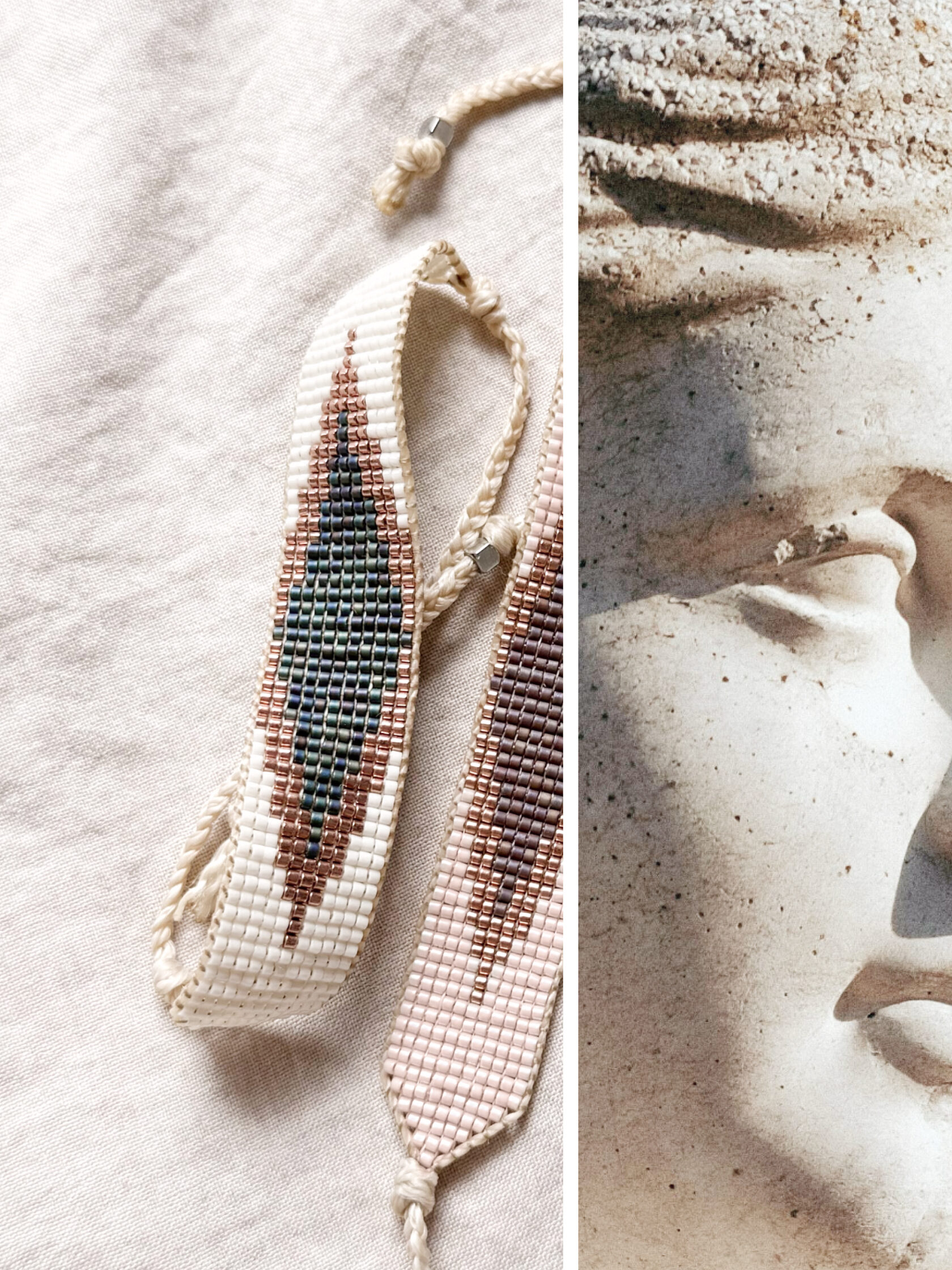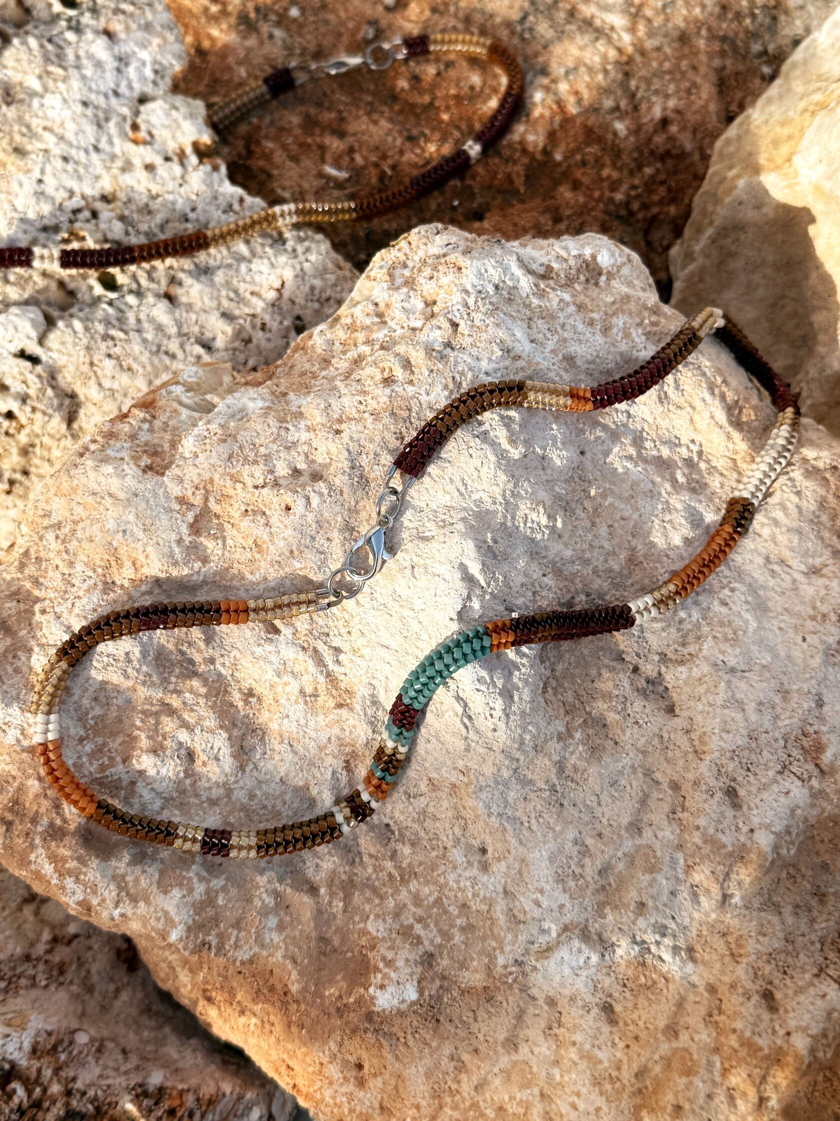 I use Miyuki Delica Japanese glass beads: their small size and cylindrical shape make the pieces light, smooth, and comfortable to wear. The weaving is based on nylon threads, which do not stretch or break even under strong tension. The fasteners made of stainless steel.