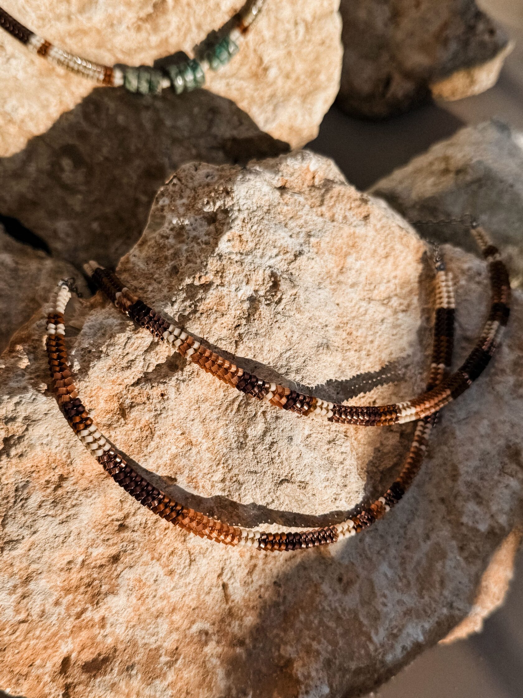 I use original Miyuki Japanese glass beads: their small size and cylindrical shape make the pieces light, smooth, and comfortable to wear. The weaving is based on nylon threads, which do not stretch or break even under strong tension. The fasteners made of stainless steel.