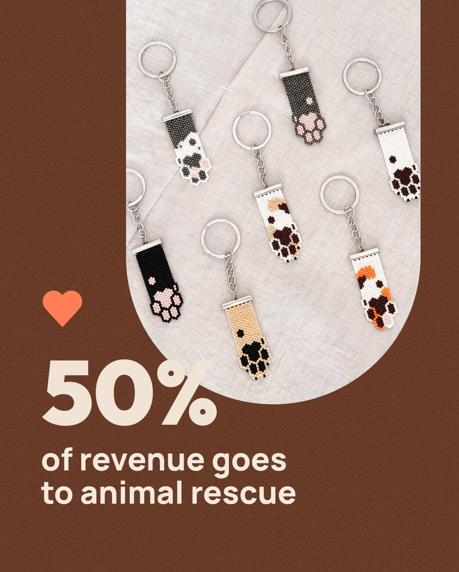 I handmade Charity Paw keychains to give you a symbol of compassion that makes a real difference: 50% of the revenue from every Paw goes to funds that rescue stray animals. Donations are distributed monthly among the funds in proportion to their involvement. See the list of current partner foundations.